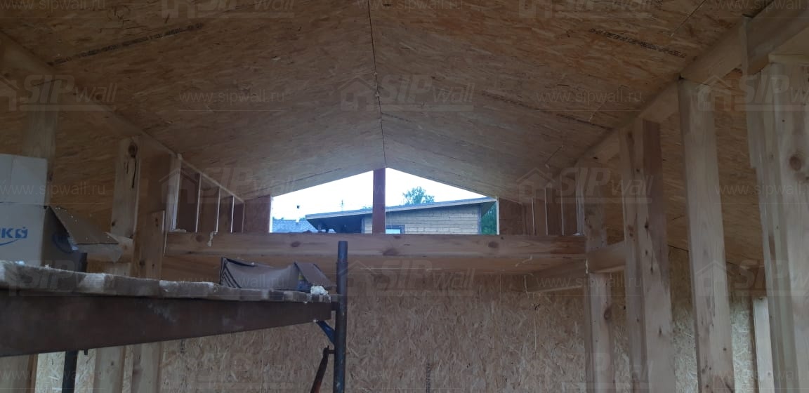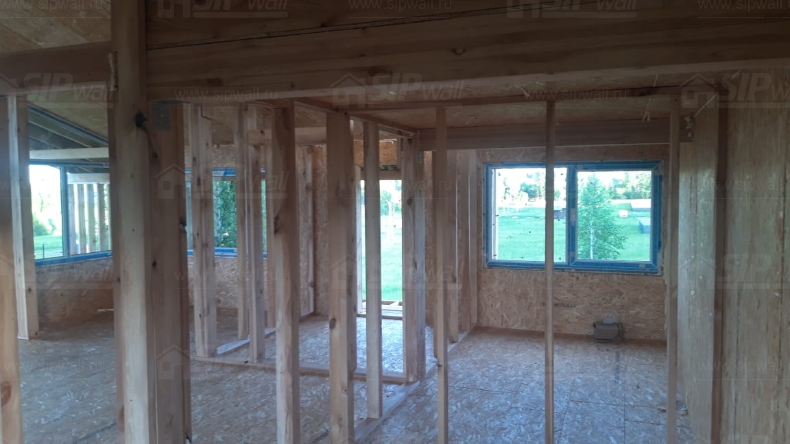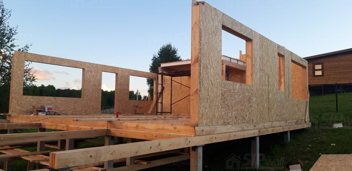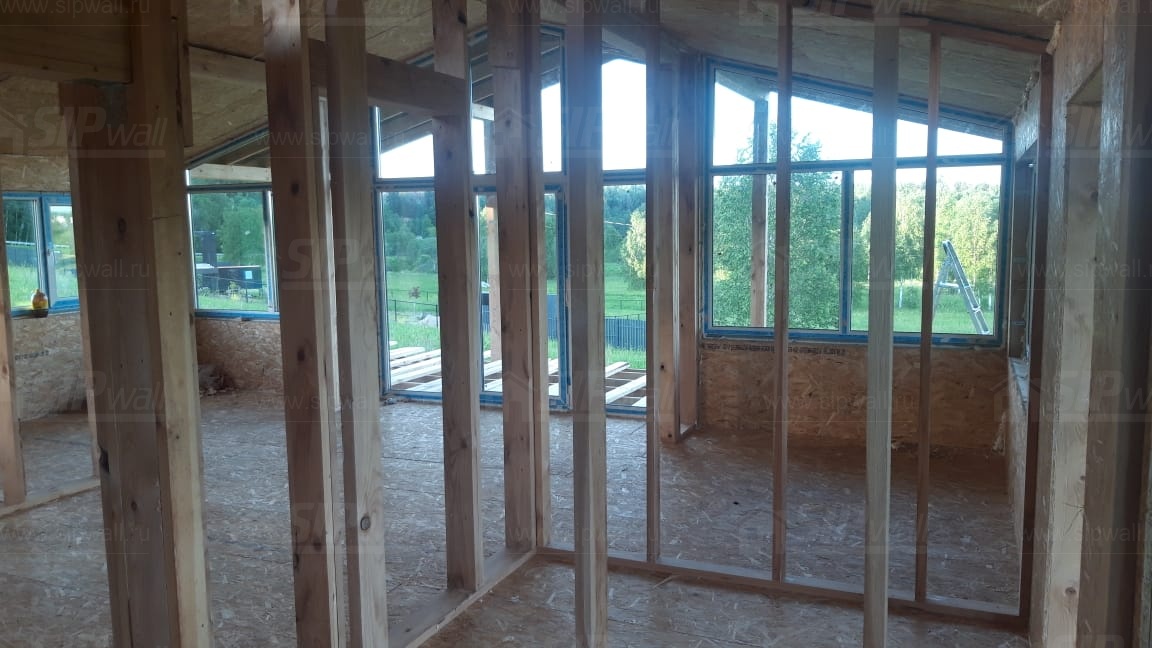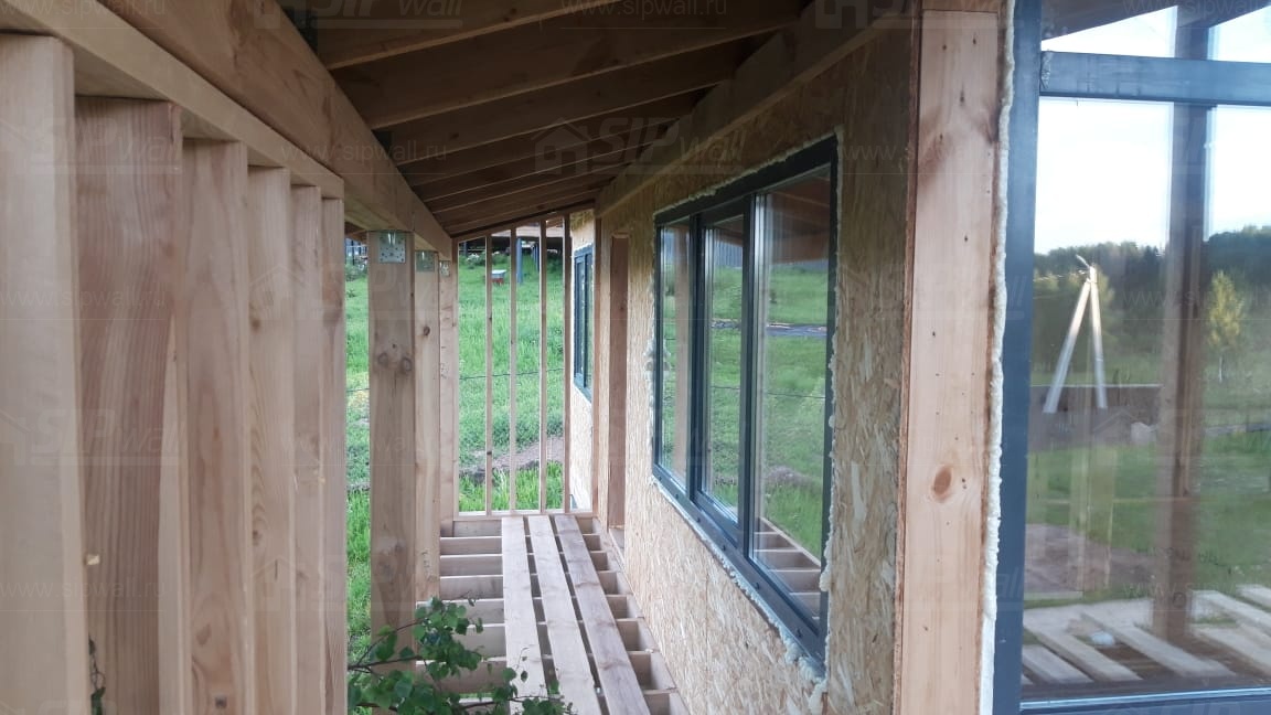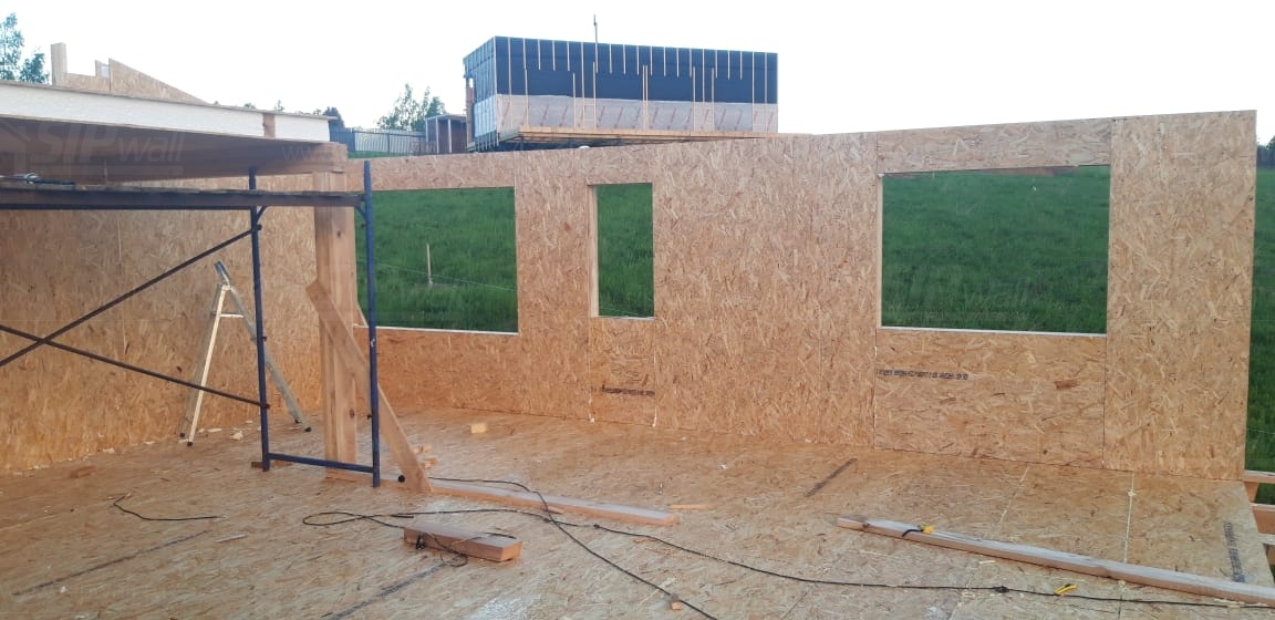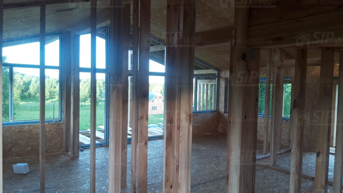Все СИП панели SIPwall толщиной 224/174/124 мм (плиты OSB-3 толщиной 12 мм "Калевала" Россия и фасадный пенополистирол ППС-14 толщиной 200/150/100 мм производства, Россия) нарезаны и обрусованы сухим строганным брусом камерной сушки в соответствии с проектной документацией.