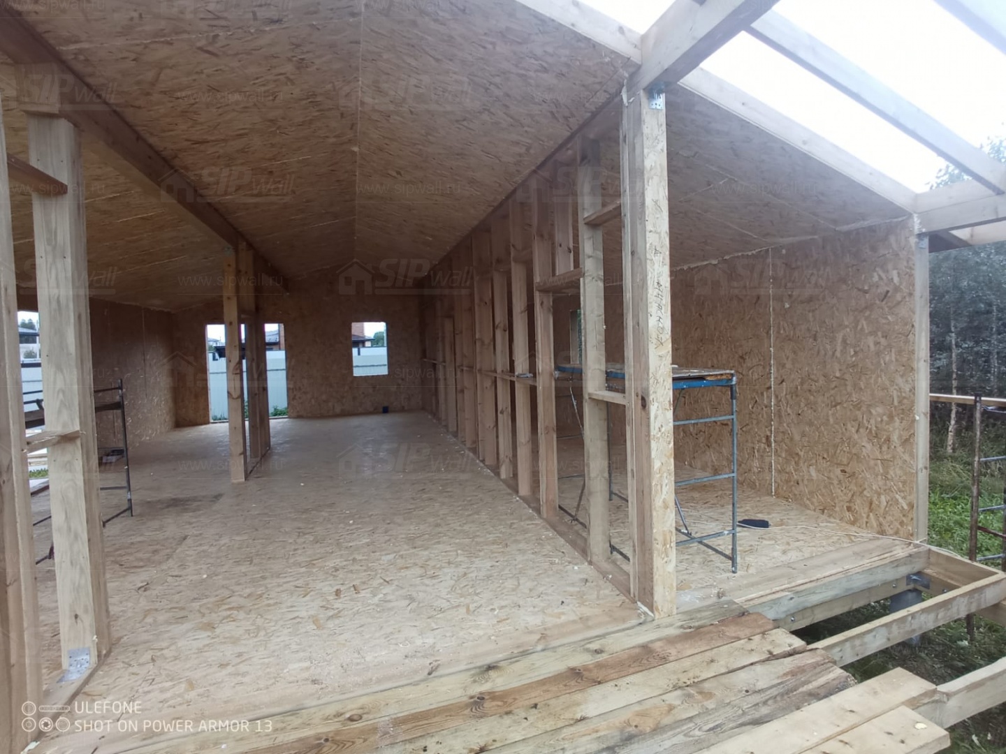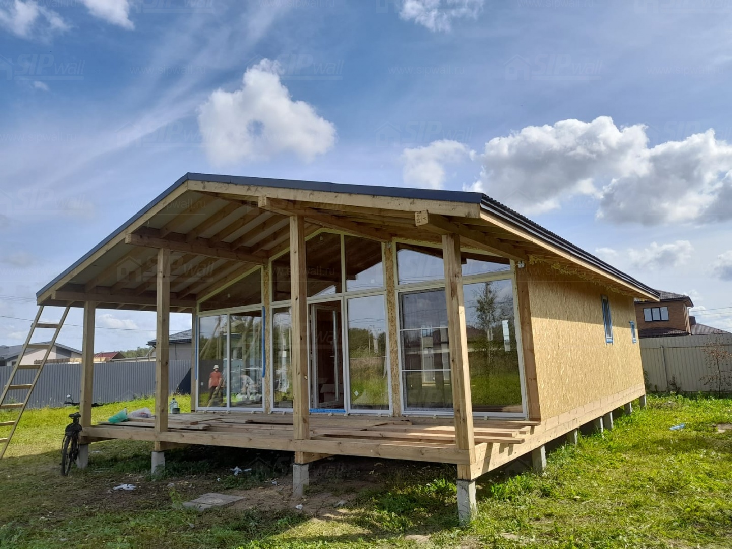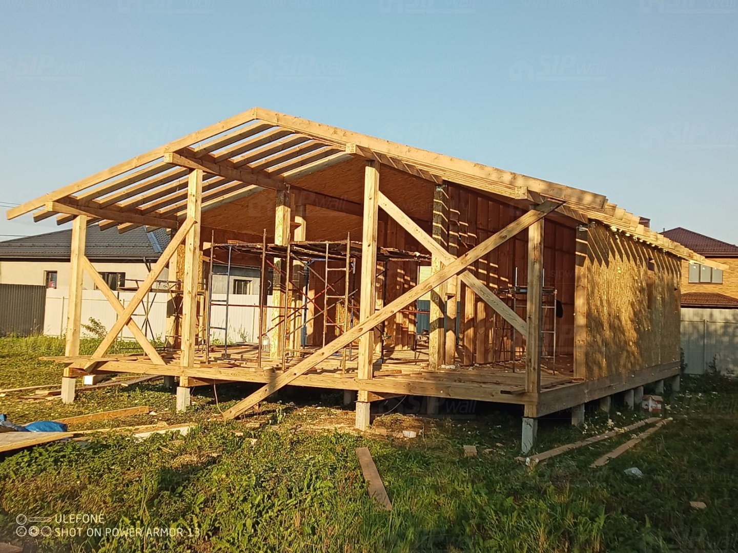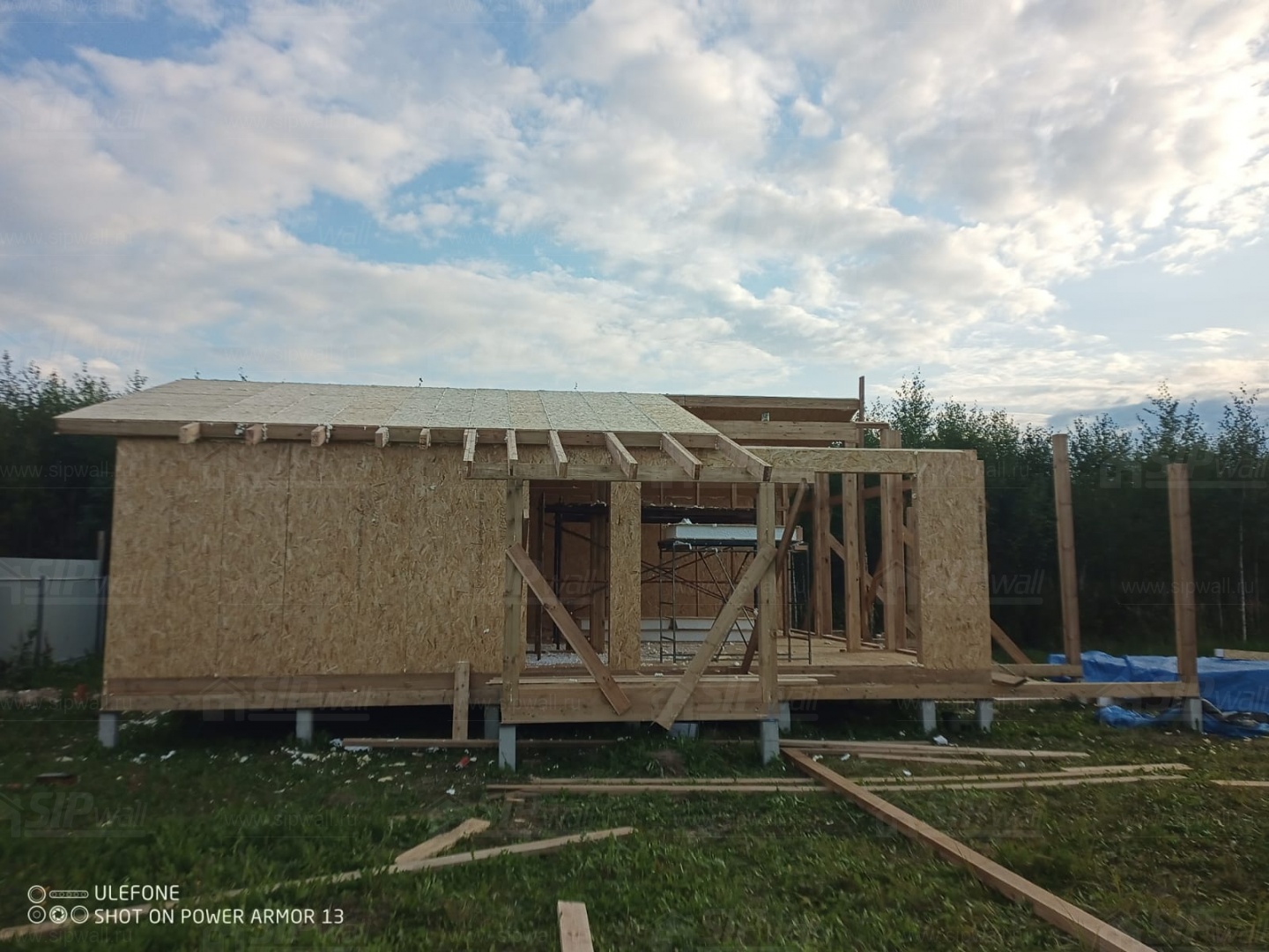 Сборка домокомплекта: Монтаж стен и перекрытий из СИП панелей, обеспечивающих высокую энергоэффективность и долговечность конструкции.