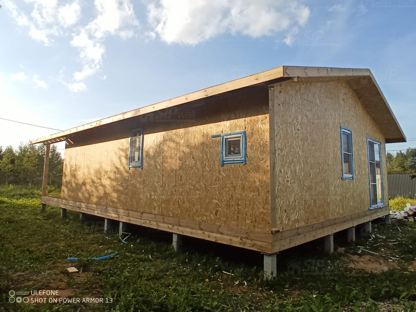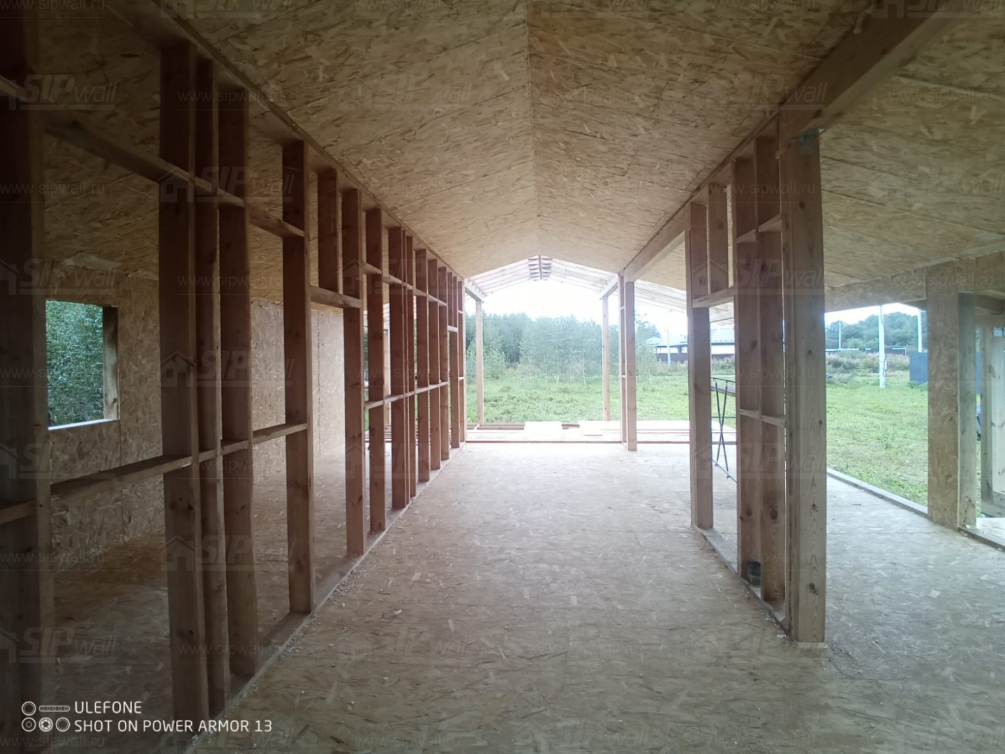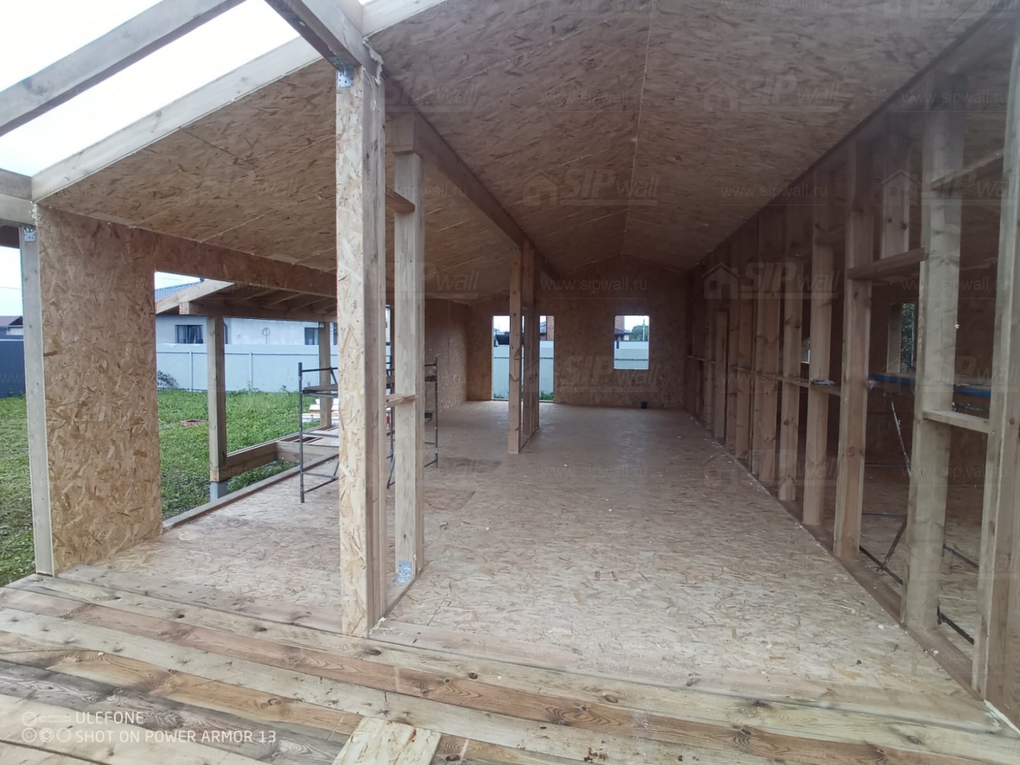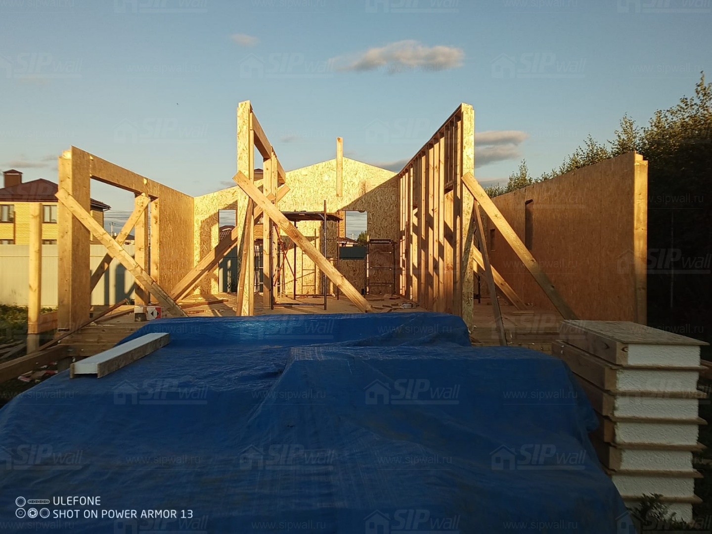 Сборка домокомплекта: Монтаж стен и перекрытий из СИП панелей, обеспечивающих высокую энергоэффективность и долговечность конструкции.