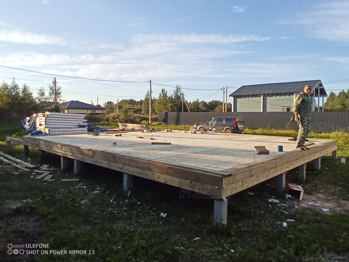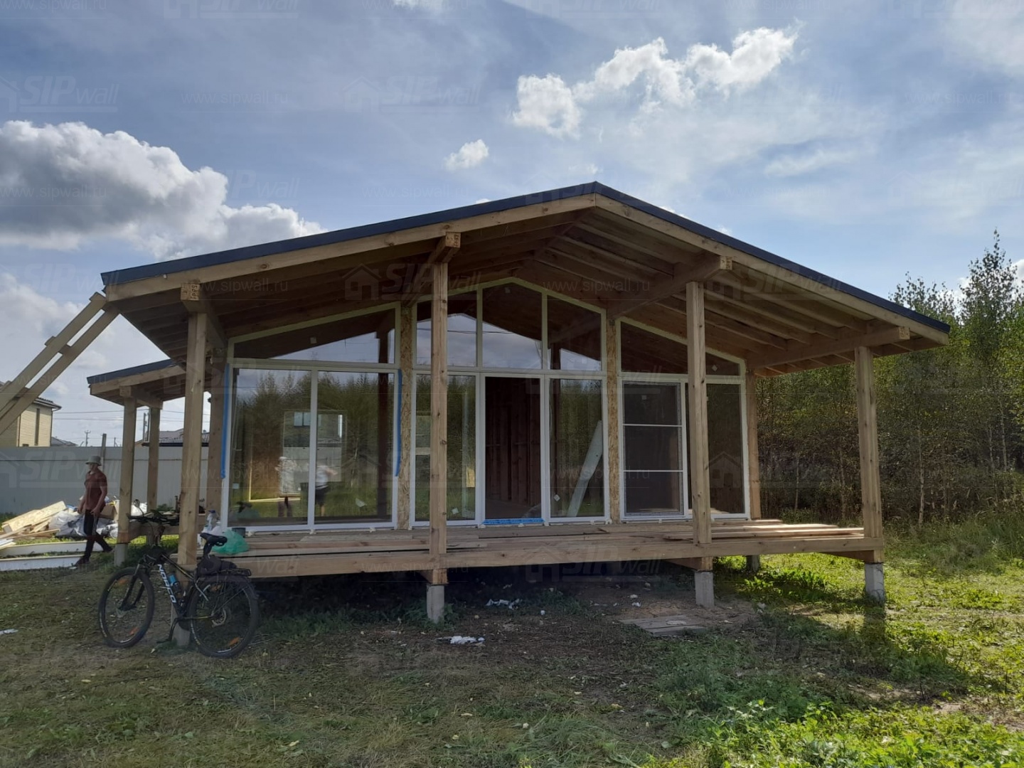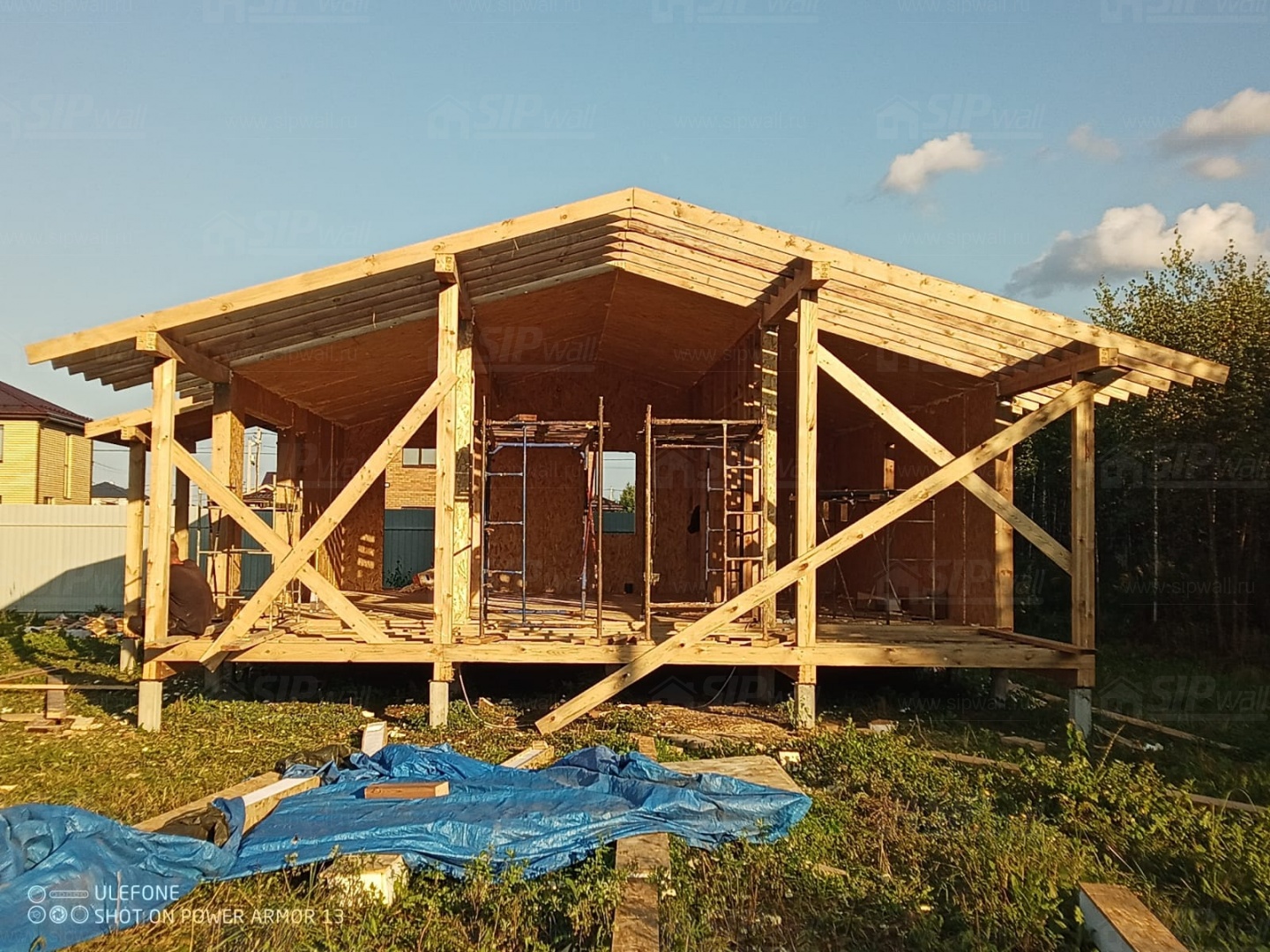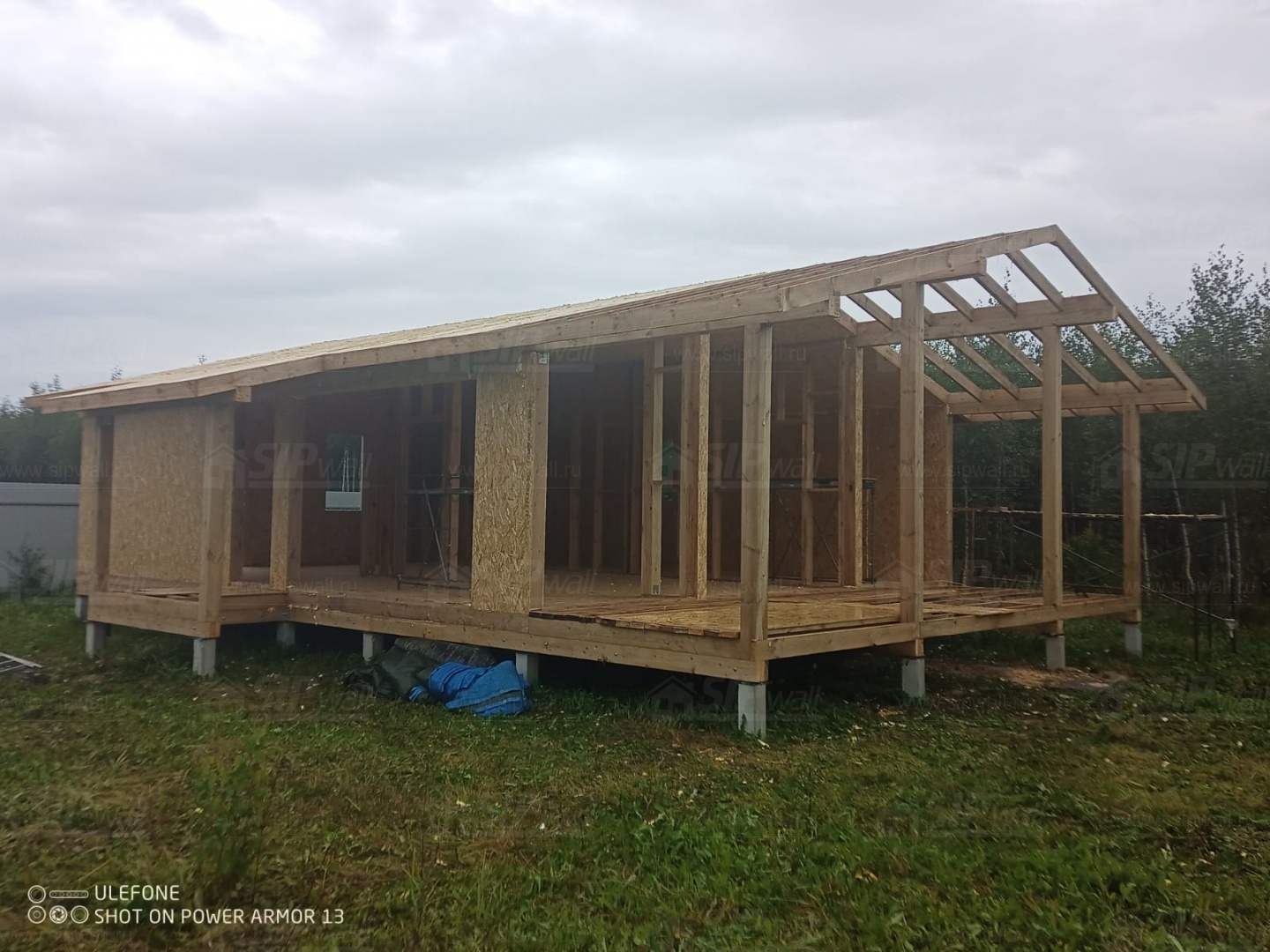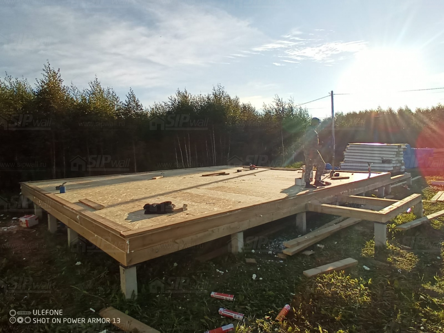 Сборка домокомплекта: Монтаж стен и перекрытий из СИП панелей, обеспечивающих высокую энергоэффективность и долговечность конструкции.