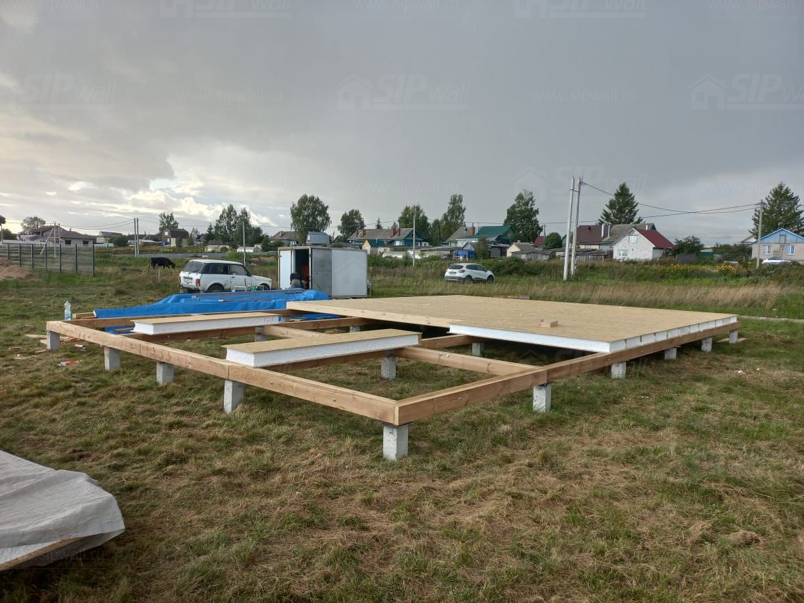 Комплектация домокомплекта: перекрытие на отметке +0.000 - СИП - 174У мм, несущие стены дома выполнены из СИП панелей 174 мм, внутренние несущие стены - СИП 174 мм, не несущие стены - СИП 124 мм Кровля - СИП 174У.