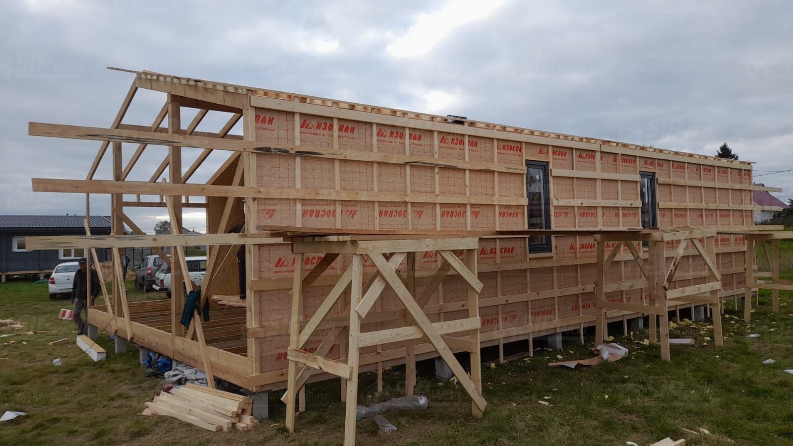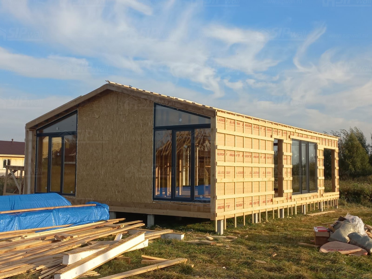 Все СИП панели SIPwall толщиной 224/174/124 мм (плиты OSB-3 толщиной 12 мм "Калевала" Россия и фасадный пенополистирол ППС-14 толщиной 200/150/100 мм производства, Россия) нарезаны и обрусованы сухим строганным брусом камерной сушки в соответствии с проектной документацией.