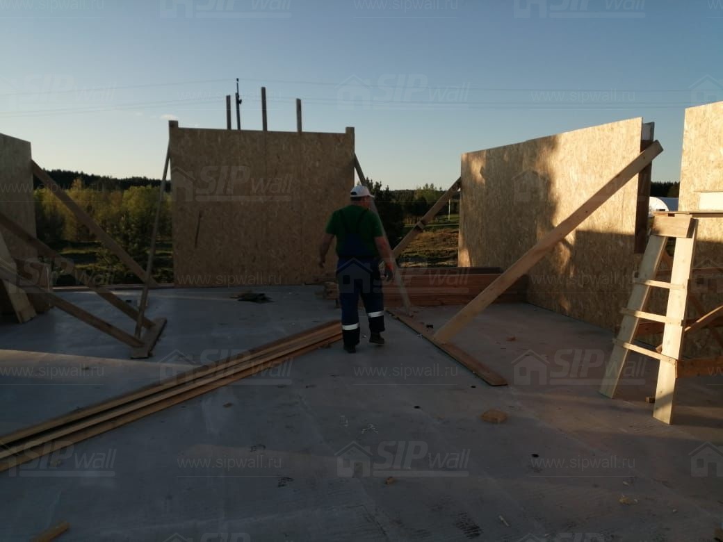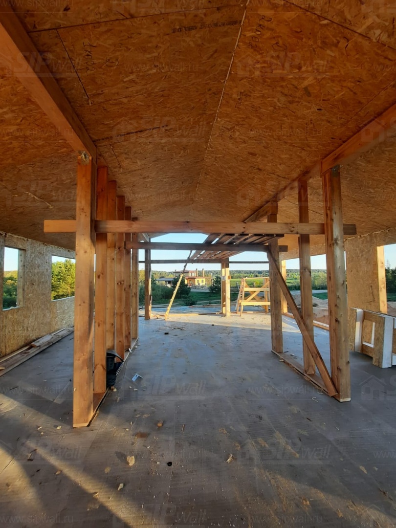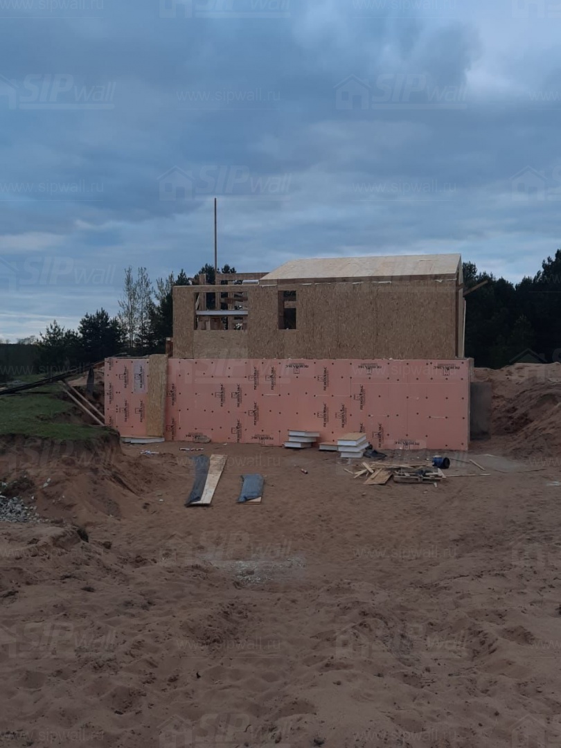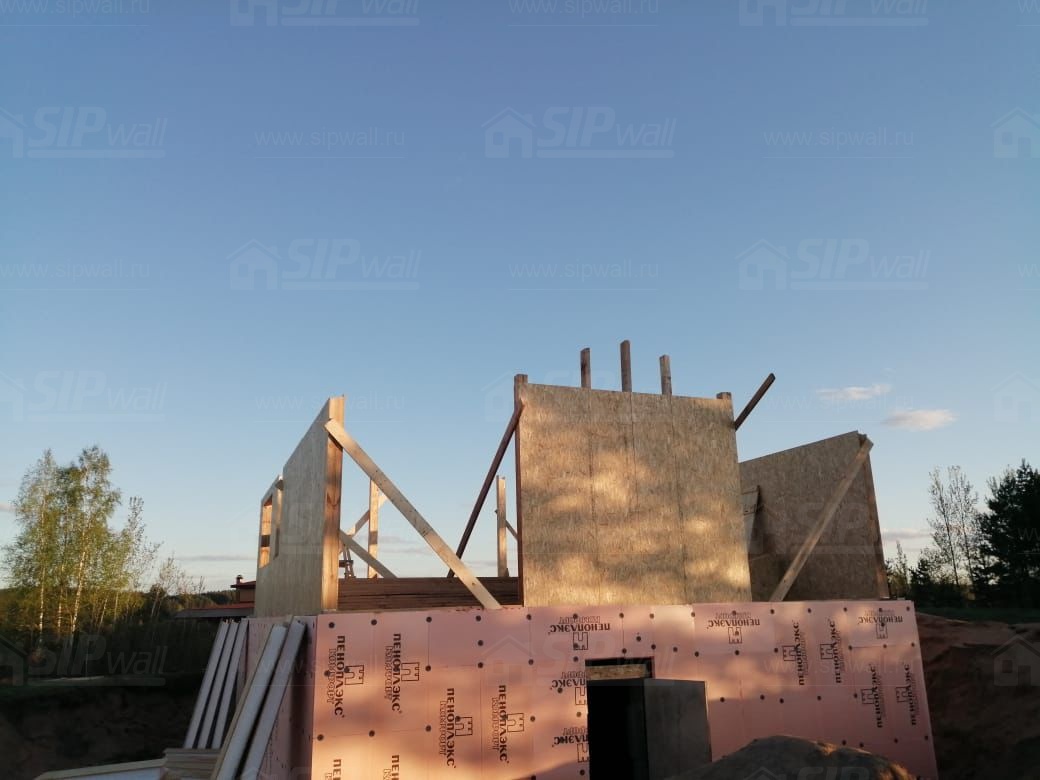 Все СИП панели SIPwall толщиной 224/174/124 мм (плиты OSB-3 толщиной 12 мм "Калевала" Россия и фасадный пенополистирол ППС-14 толщиной 200/150/100 мм производства, Россия) нарезаны и обрусованы сухим строганным брусом камерной сушки в соответствии с проектной документацией.