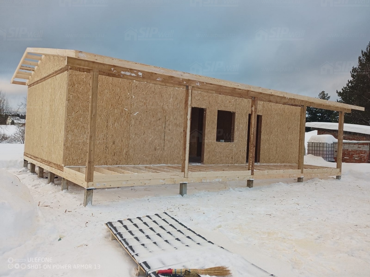 Комплектация домокомплекта: перекрытие на отметке +0.000 - СИП - 174У мм, несущие стены дома выполнены из СИП панелей 174 мм, внутренние несущие стены - СИП 174 мм, не несущие стены - СИП 124 мм Кровля - СИП 174У.