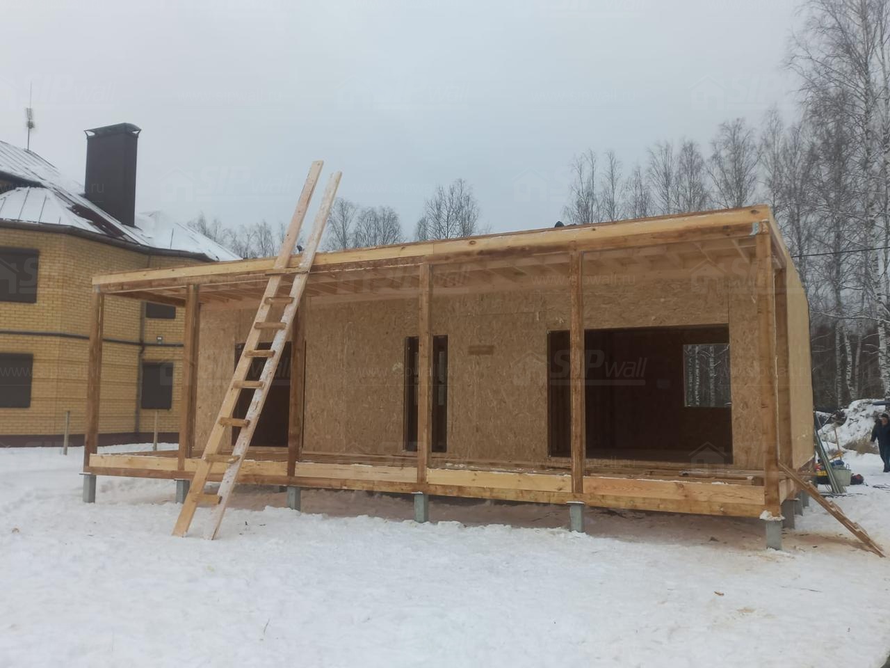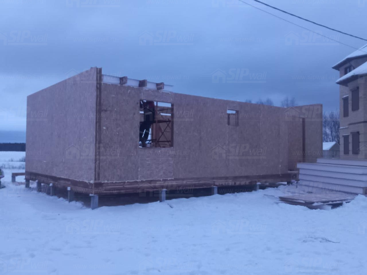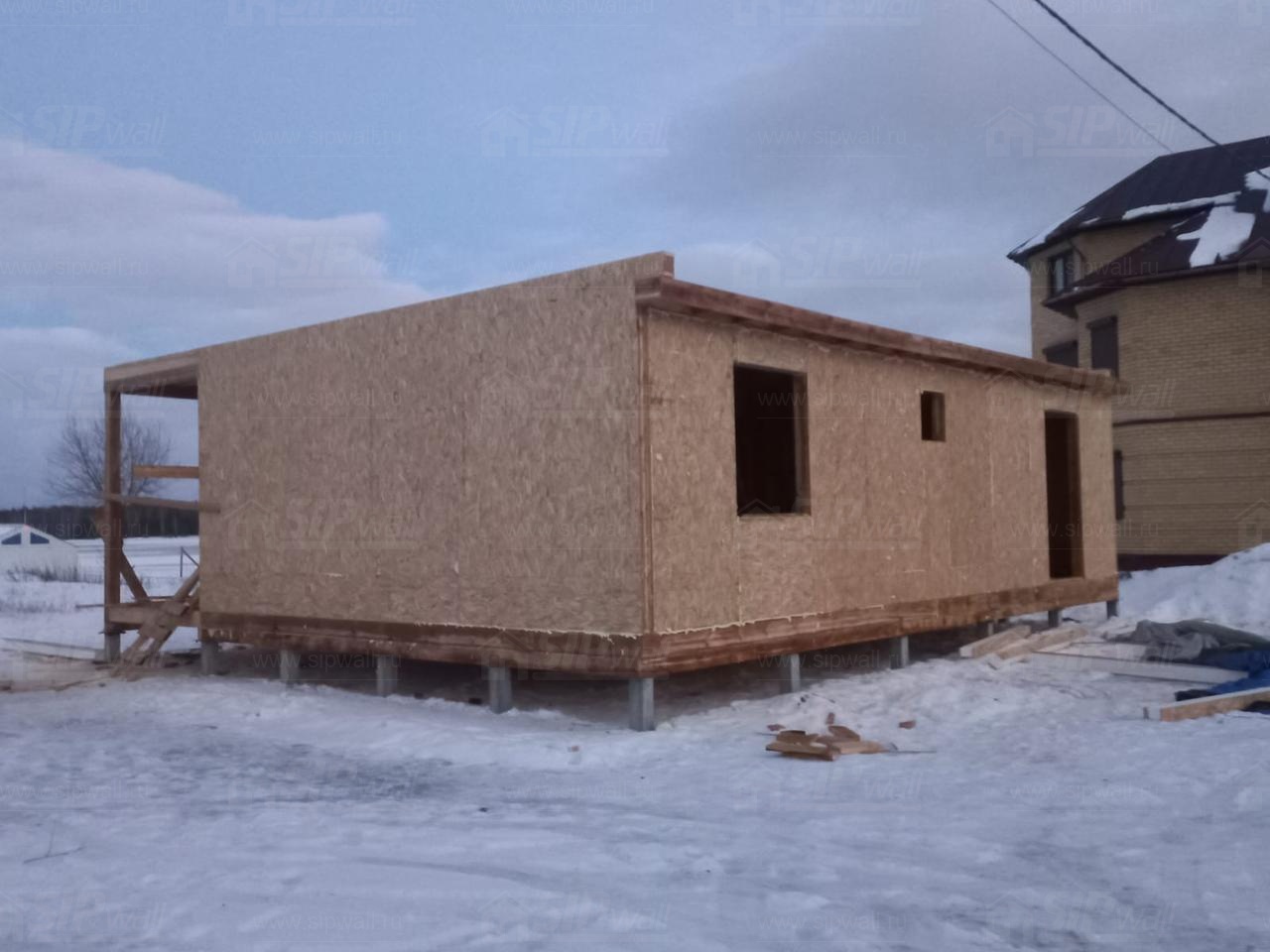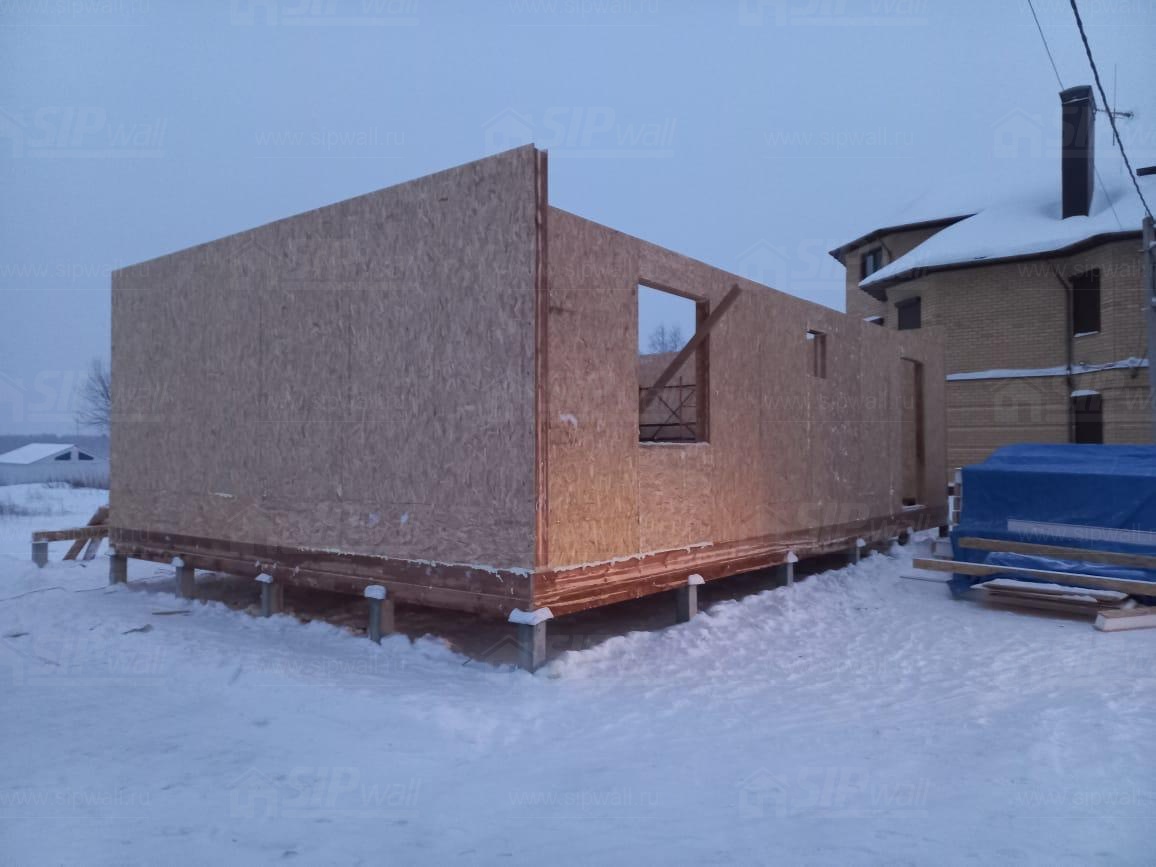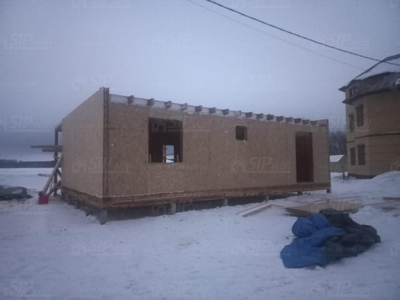 Комплектация домокомплекта: перекрытие на отметке +0.000 - СИП - 174У мм, несущие стены дома выполнены из СИП панелей 174 мм, внутренние несущие стены - СИП 174 мм, не несущие стены - СИП 124 мм Кровля - СИП 174У.