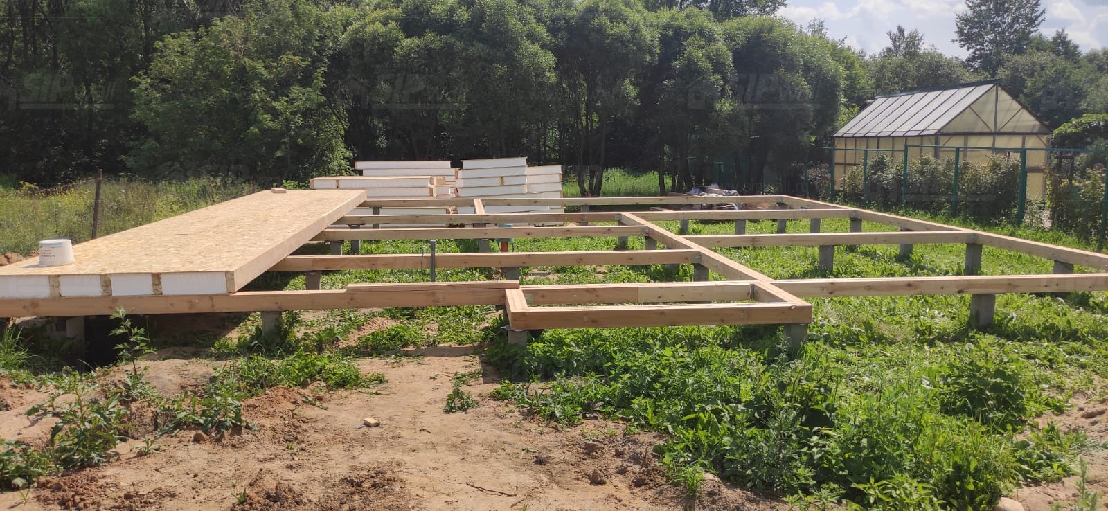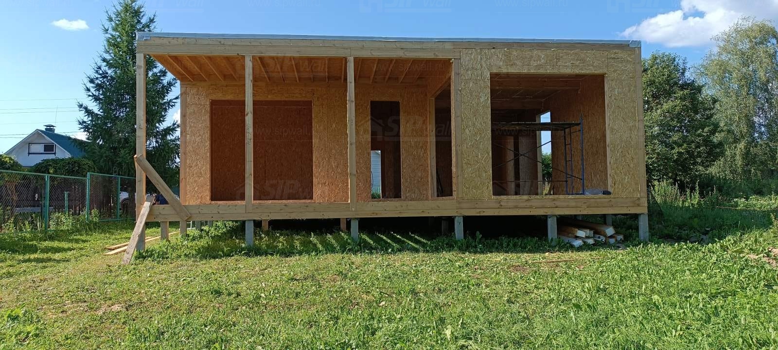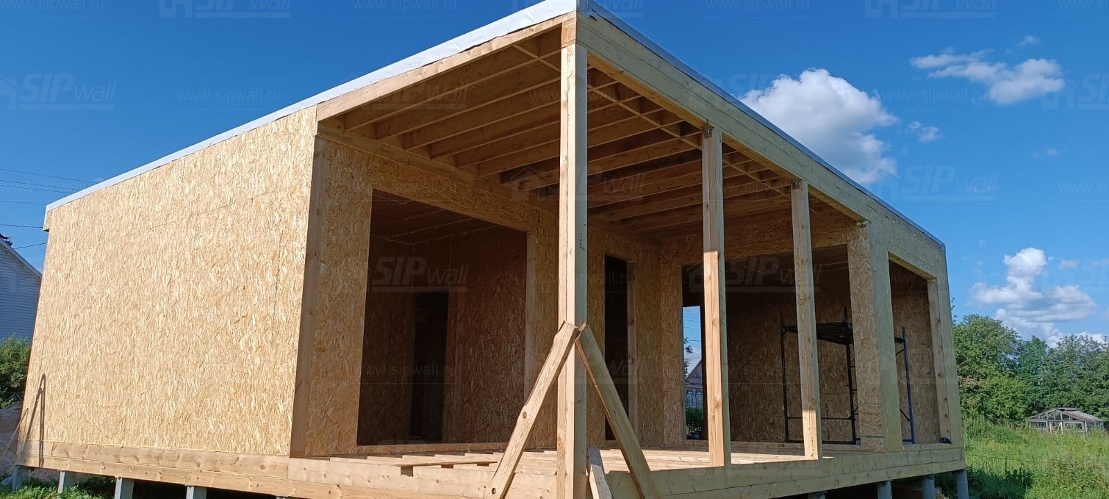 Все СИП панели SIPwall толщиной 224/174/124 мм (плиты OSB-3 толщиной 12 мм "Калевала" Россия и фасадный пенополистирол ППС-14 толщиной 200/150/100 мм производства, Россия) нарезаны и обрусованы сухим строганным брусом камерной сушки в соответствии с проектной документацией.