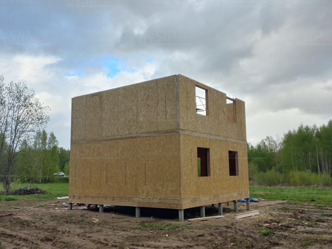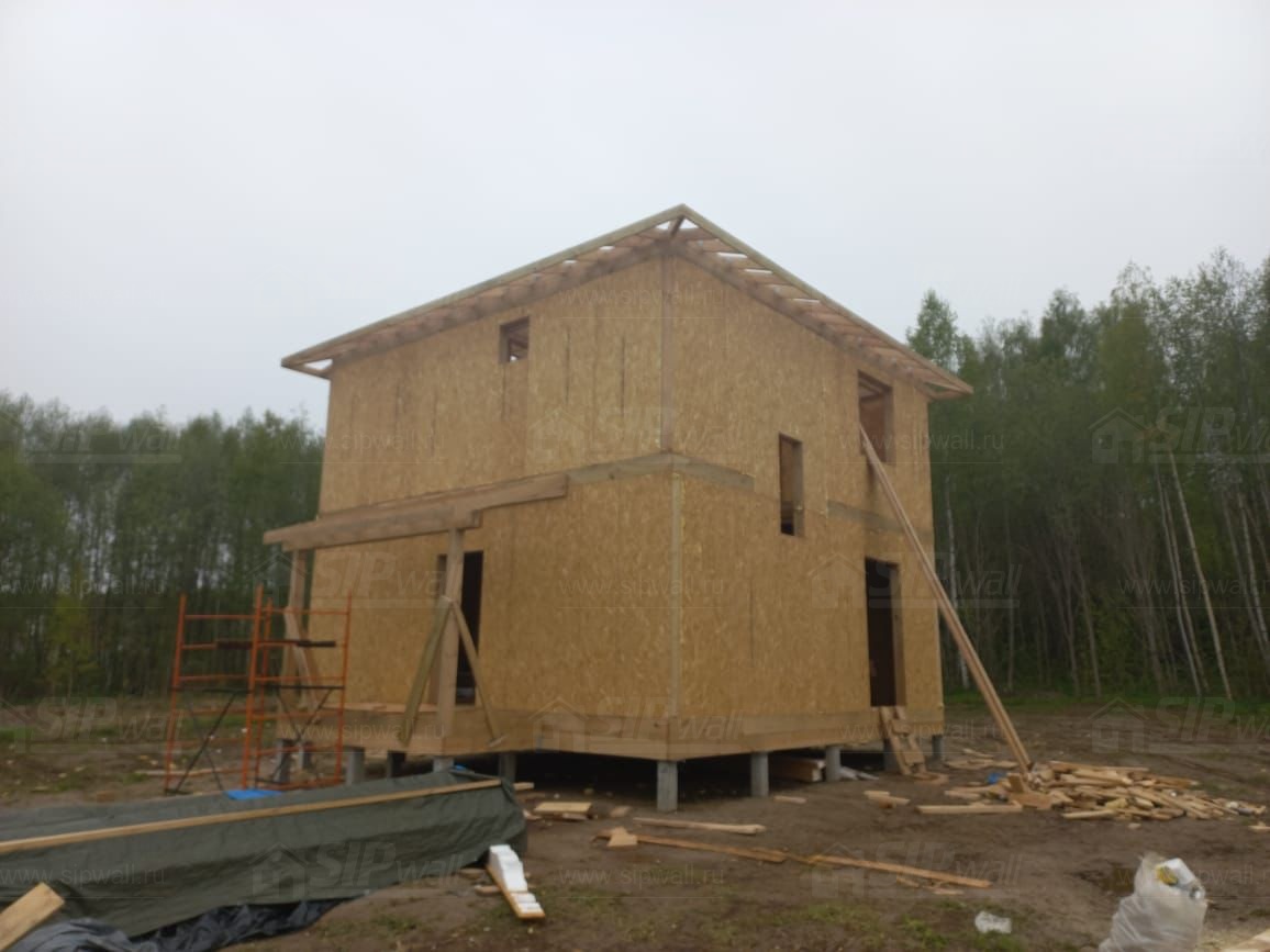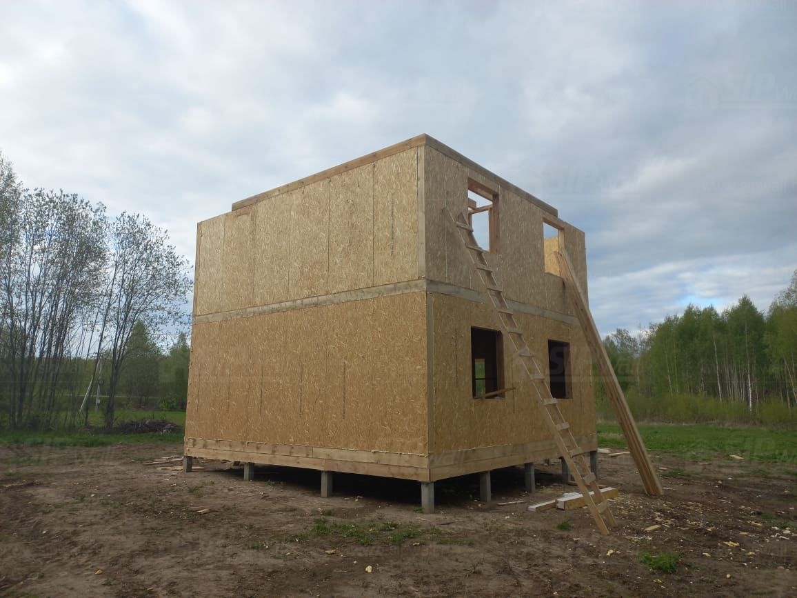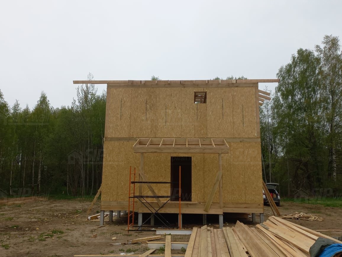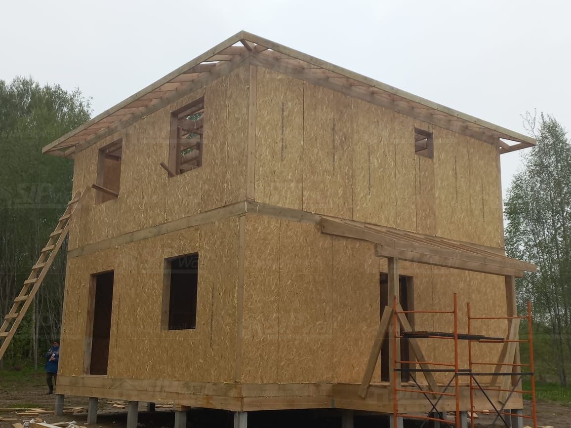 Все СИП панели SIPwall толщиной 224/174/124 мм (плиты OSB-3 толщиной 12 мм "Калевала" Россия и фасадный пенополистирол ППС-14 толщиной 200/150/100 мм производства, Россия) нарезаны и обрусованы сухим строганным брусом камерной сушки в соответствии с проектной документацией.