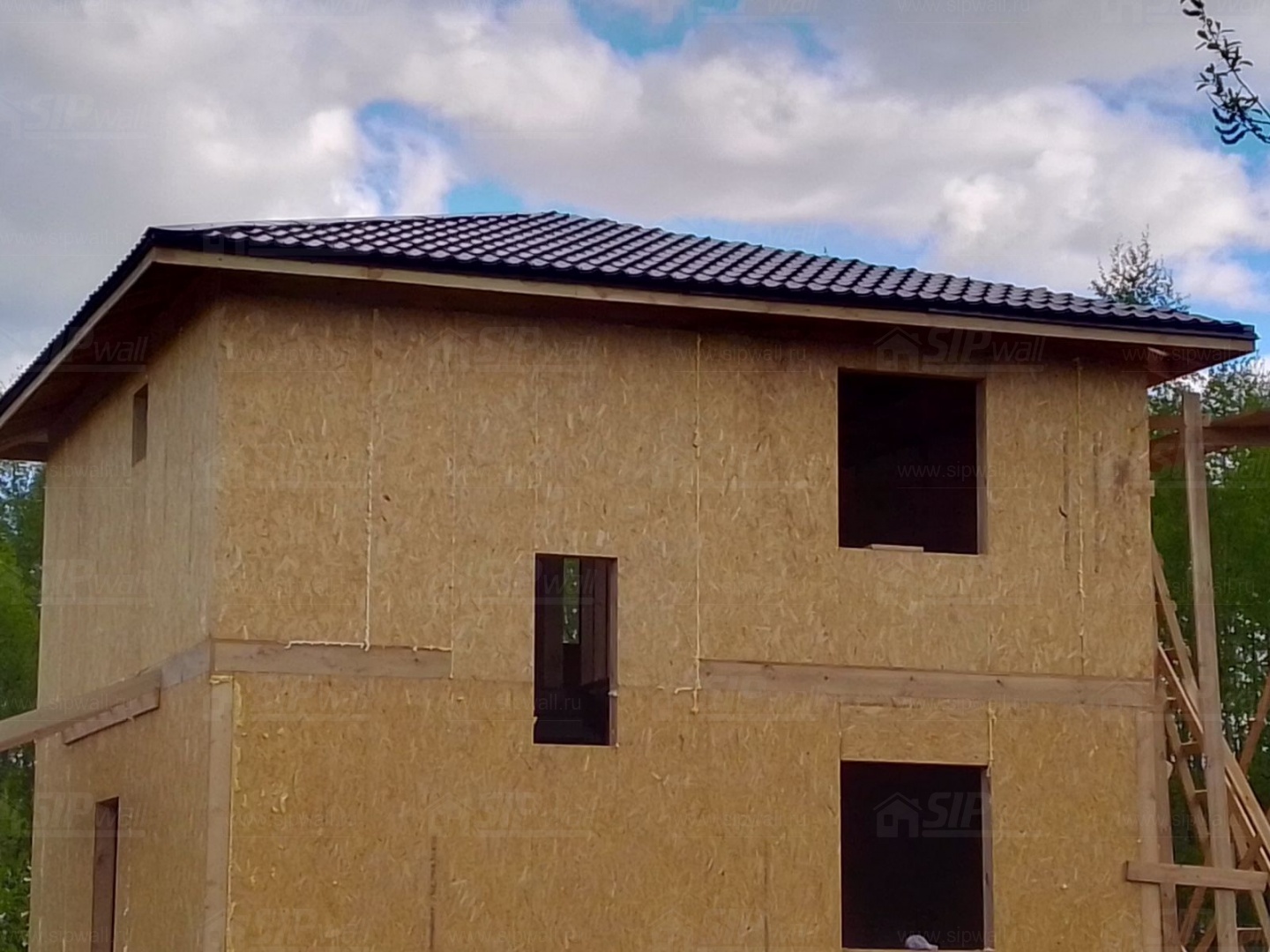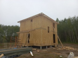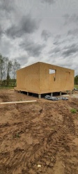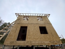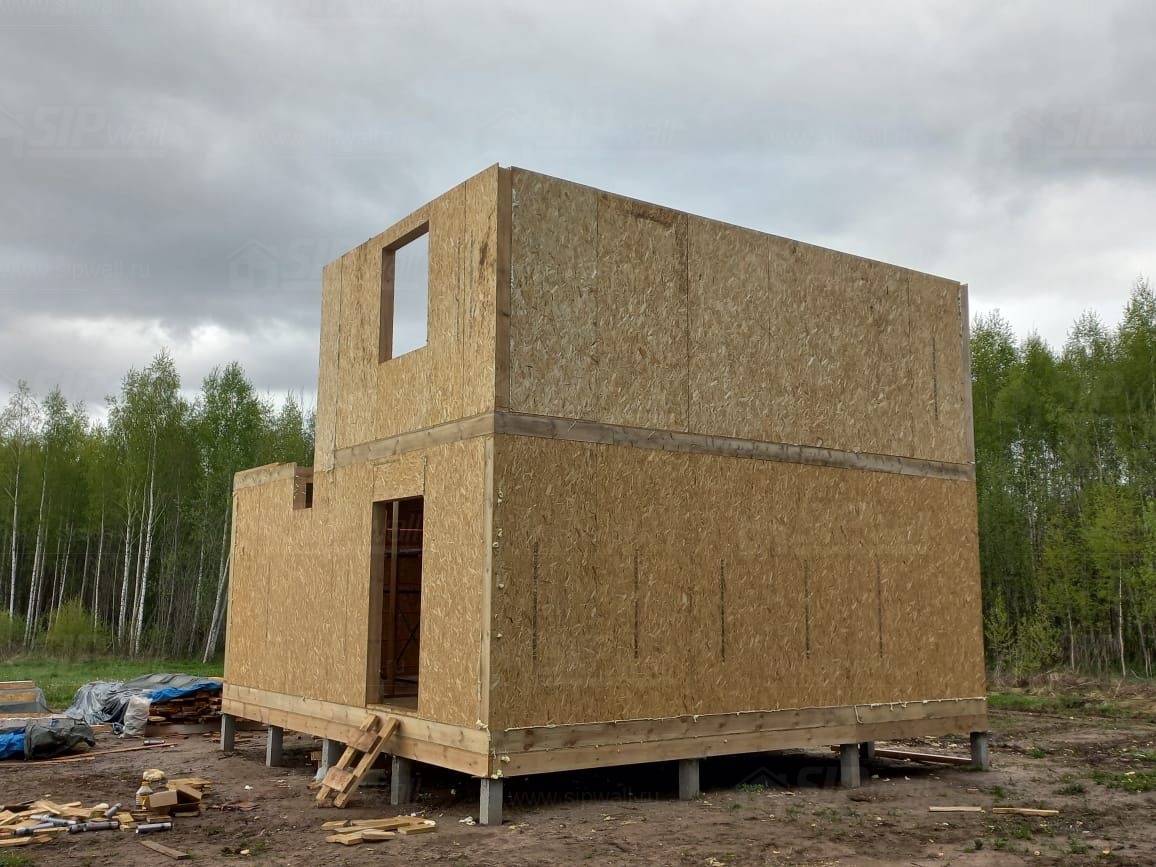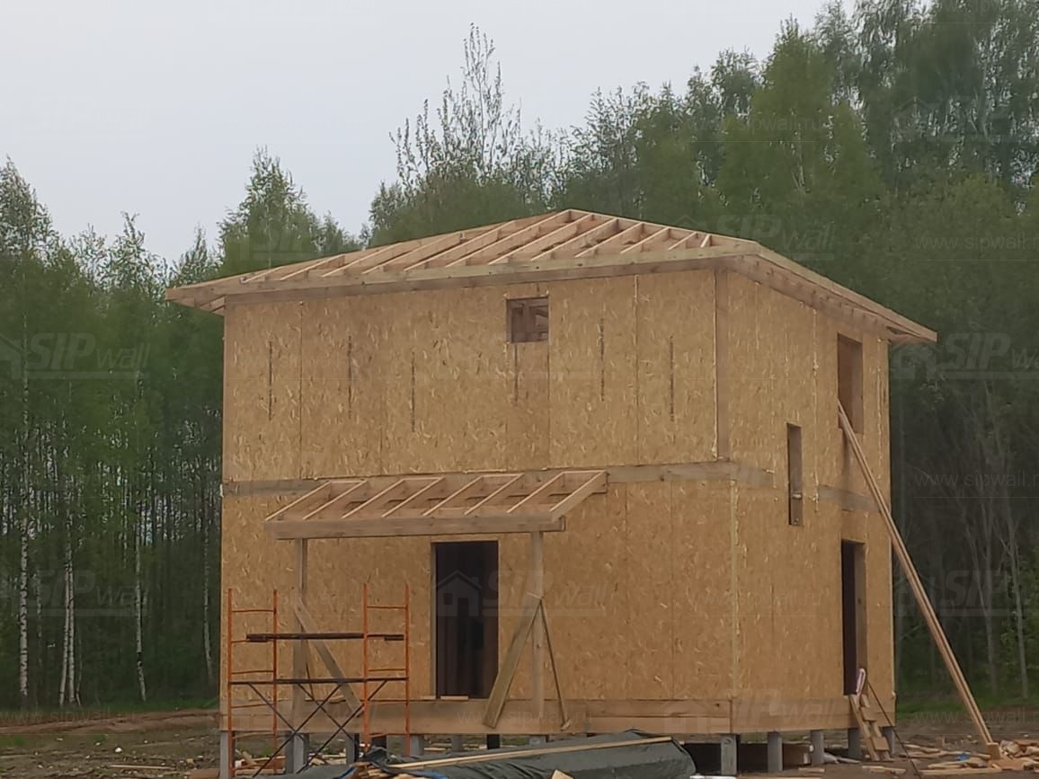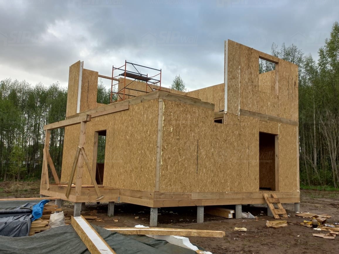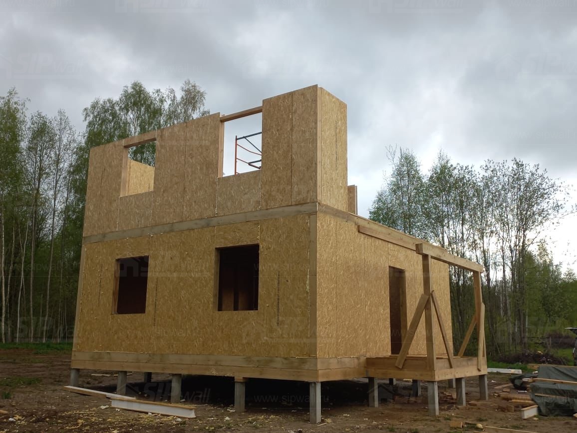 Все СИП панели SIPwall толщиной 224/174/124 мм (плиты OSB-3 толщиной 12 мм "Калевала" Россия и фасадный пенополистирол ППС-14 толщиной 200/150/100 мм производства, Россия) нарезаны и обрусованы сухим строганным брусом камерной сушки в соответствии с проектной документацией.