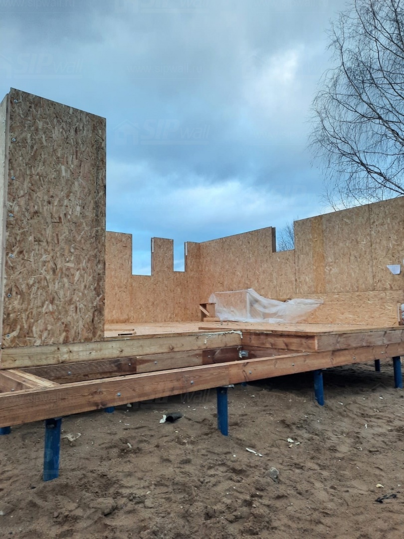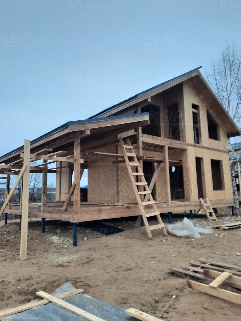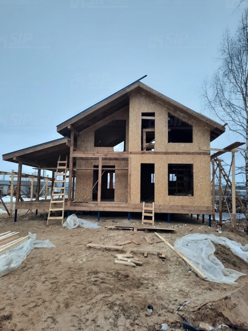 Комплектация домокомплекта: перекрытие на отметке +0.000 - СИП - 174У мм, несущие стены дома выполнены из СИП панелей 174 мм, внутренние несущие стены - СИП 174 мм, не несущие стены - СИП 124 мм Кровля - СИП 174У.