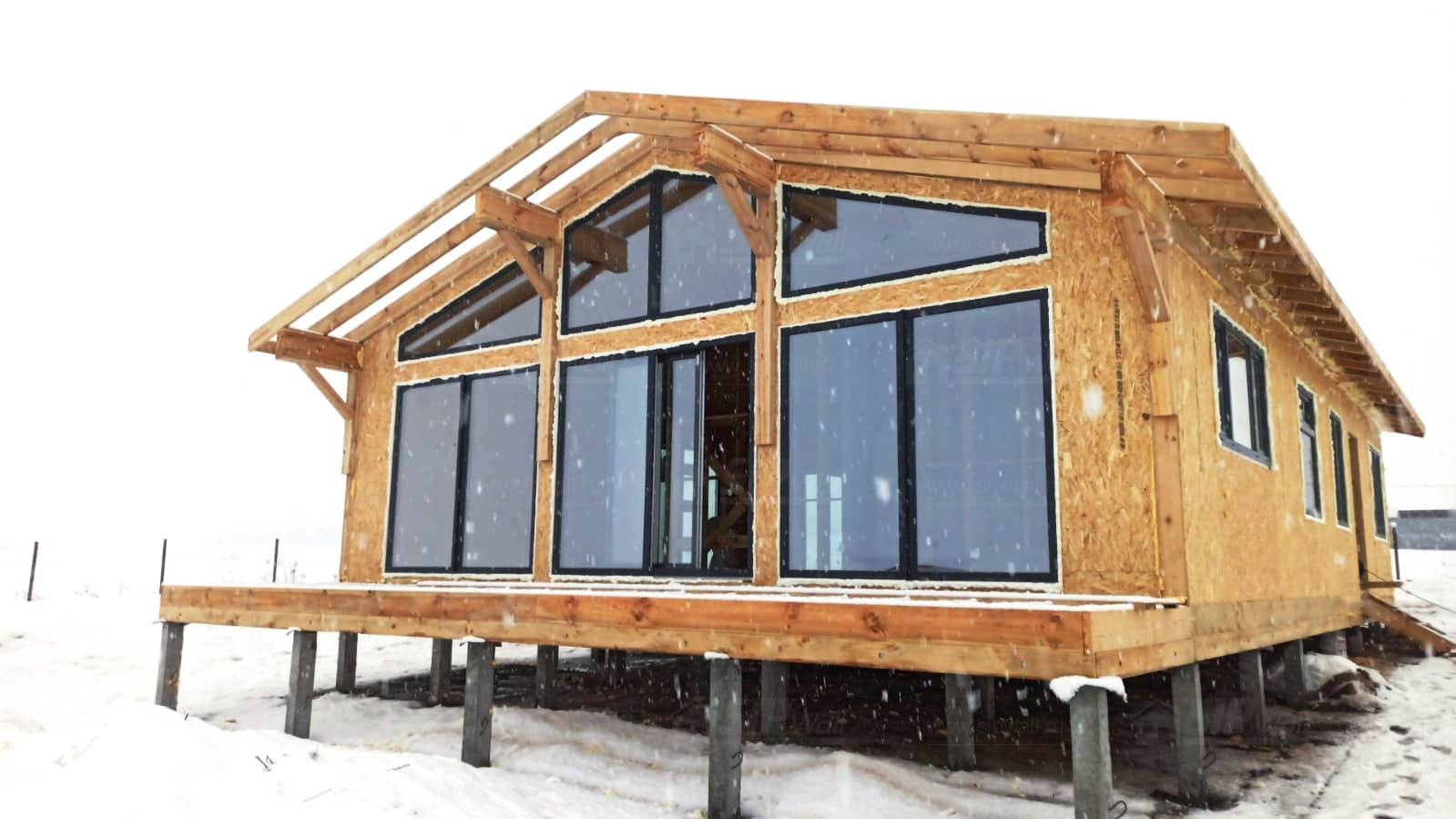 Комплектация домокомплекта: перекрытие на отметке +0.000 - СИП - 174У мм, несущие стены дома выполнены из СИП панелей 174 мм, внутренние несущие стены - СИП 174 мм, не несущие стены - СИП 124 мм Кровля - СИП 174У.