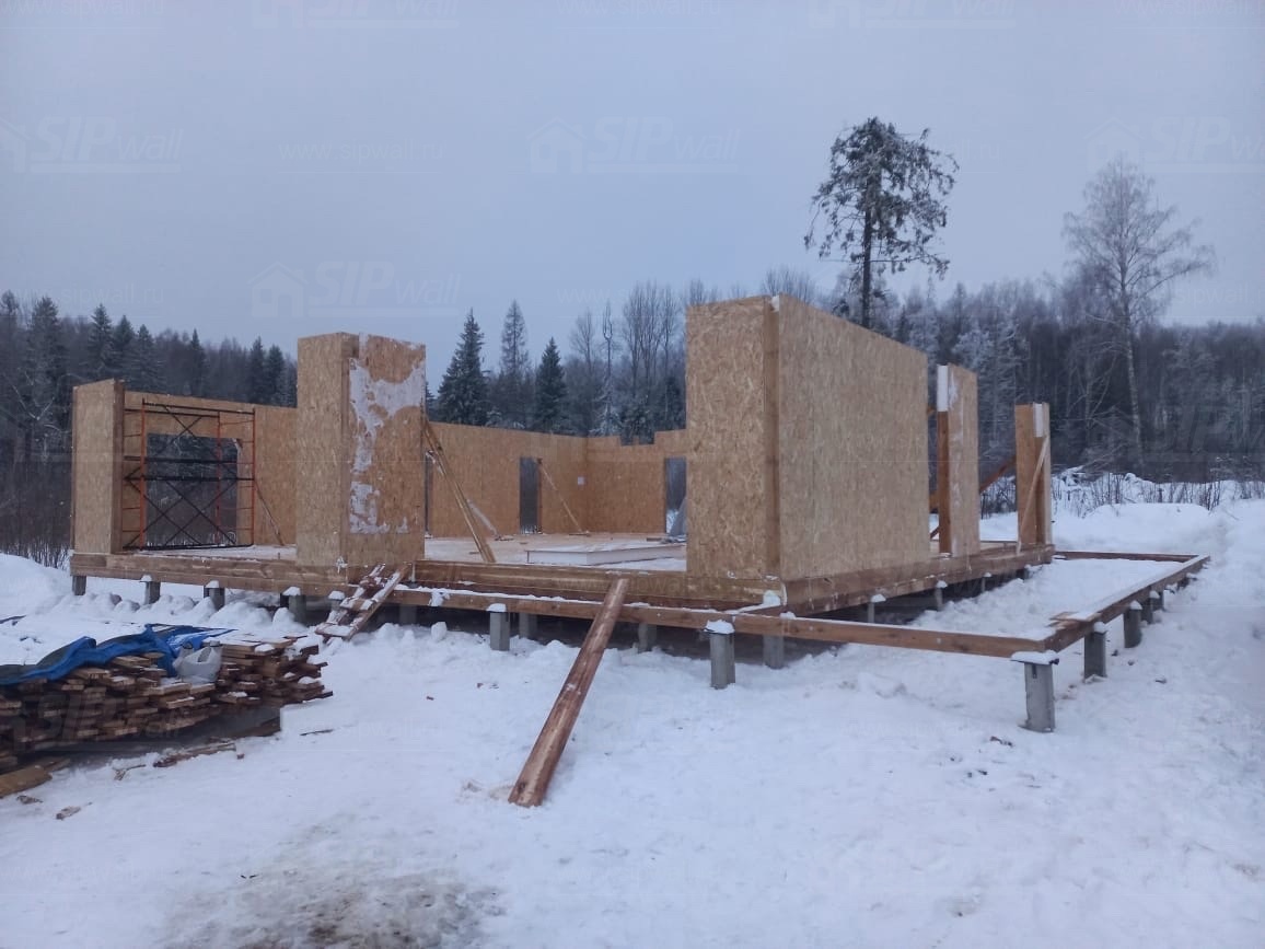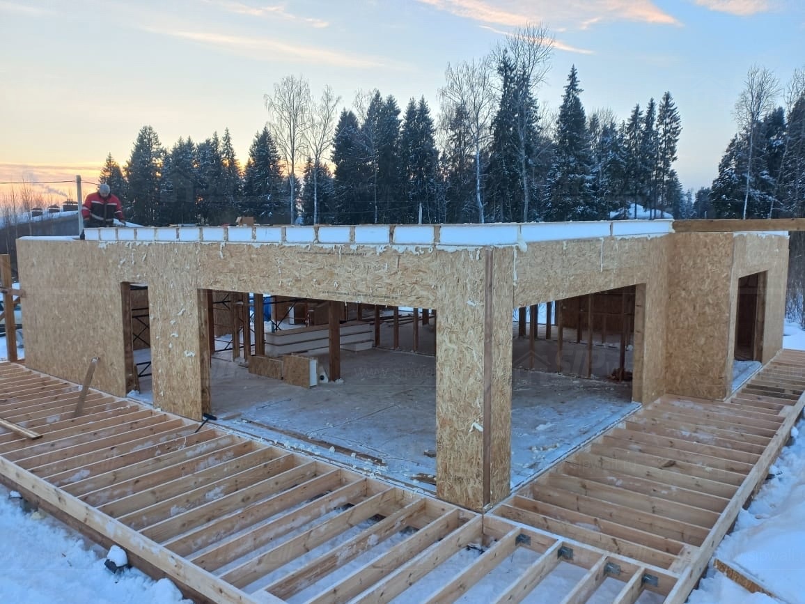 Все СИП панели SIPwall толщиной 224/174/124 мм (плиты OSB-3 толщиной 12 мм "Калевала" Россия и фасадный пенополистирол ППС-14 толщиной 200/150/100 мм производства, Россия) нарезаны и обрусованы сухим строганным брусом камерной сушки в соответствии с проектной документацией.