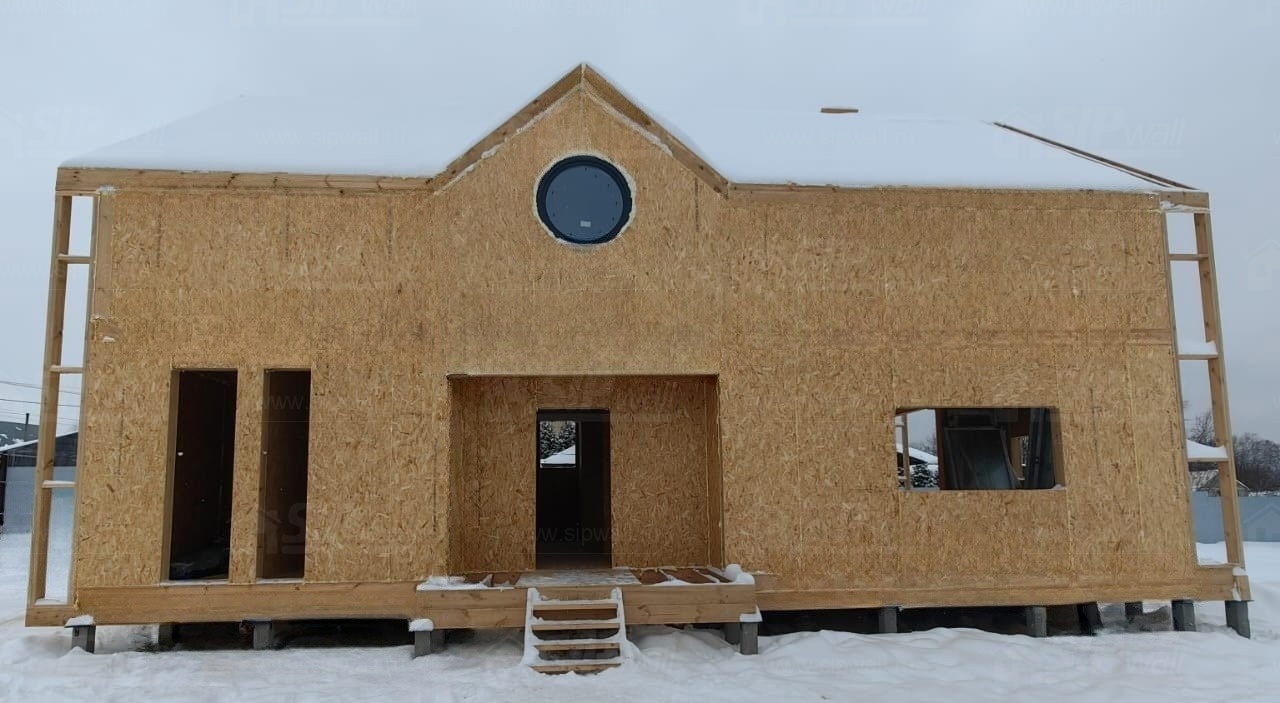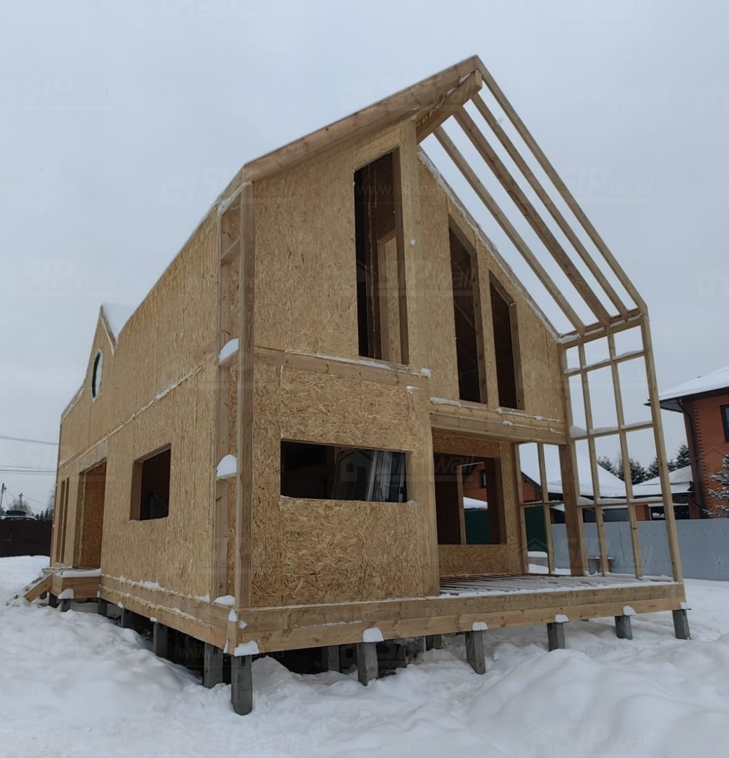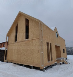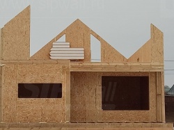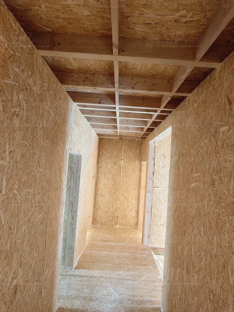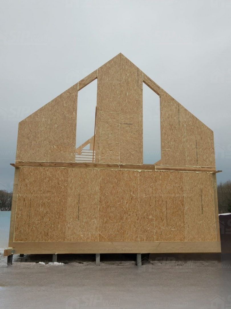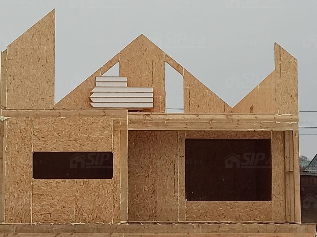 Все СИП панели SIPwall толщиной 224/174/124 мм (плиты OSB-3 толщиной 12 мм "Калевала" Россия и фасадный пенополистирол ППС-14 толщиной 200/150/100 мм производства, Россия) нарезаны и обрусованы сухим строганным брусом камерной сушки в соответствии с проектной документацией.