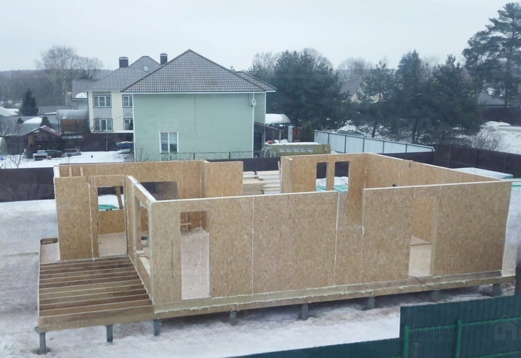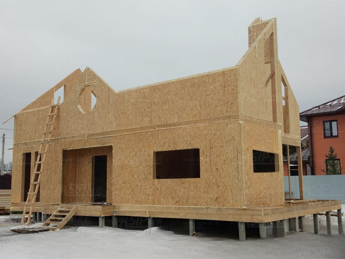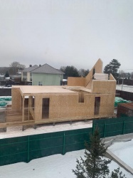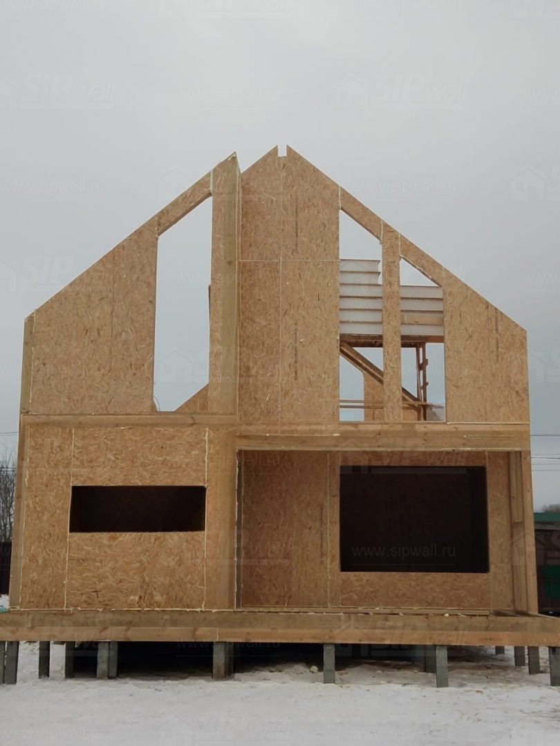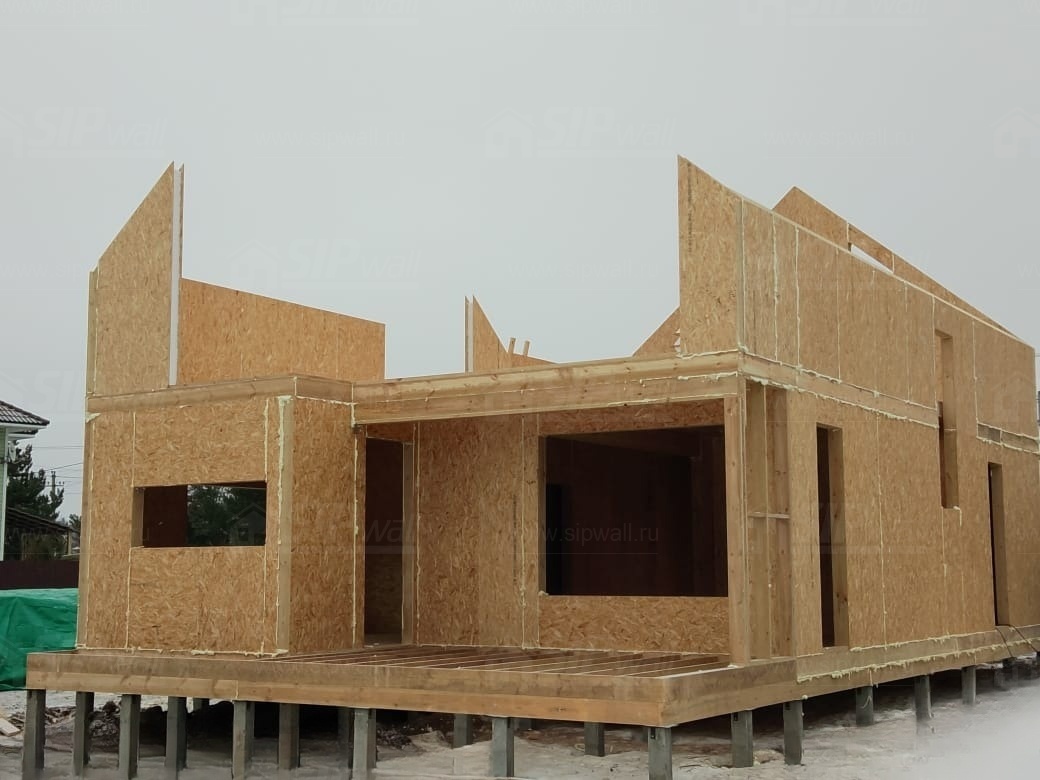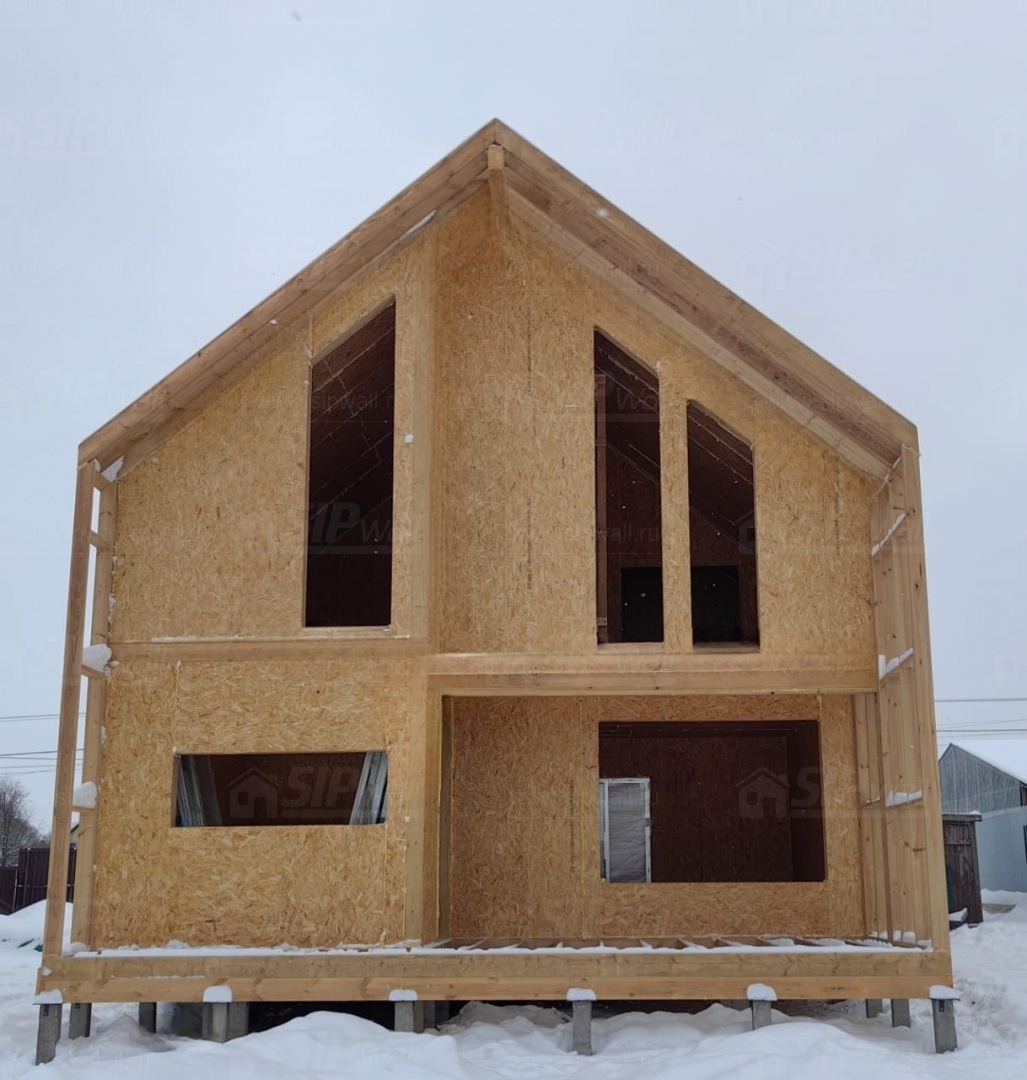 Все СИП панели SIPwall толщиной 224/174/124 мм (плиты OSB-3 толщиной 12 мм "Калевала" Россия и фасадный пенополистирол ППС-14 толщиной 200/150/100 мм производства, Россия) нарезаны и обрусованы сухим строганным брусом камерной сушки в соответствии с проектной документацией.