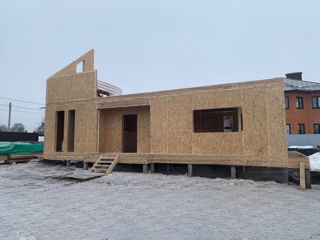 Комплектация домокомплекта: перекрытие на отметке +0.000 - СИП - 174У мм, несущие стены дома выполнены из СИП панелей 174 мм, внутренние несущие стены - СИП 174 мм, не несущие стены - СИП 124 мм Кровля - СИП 174У.