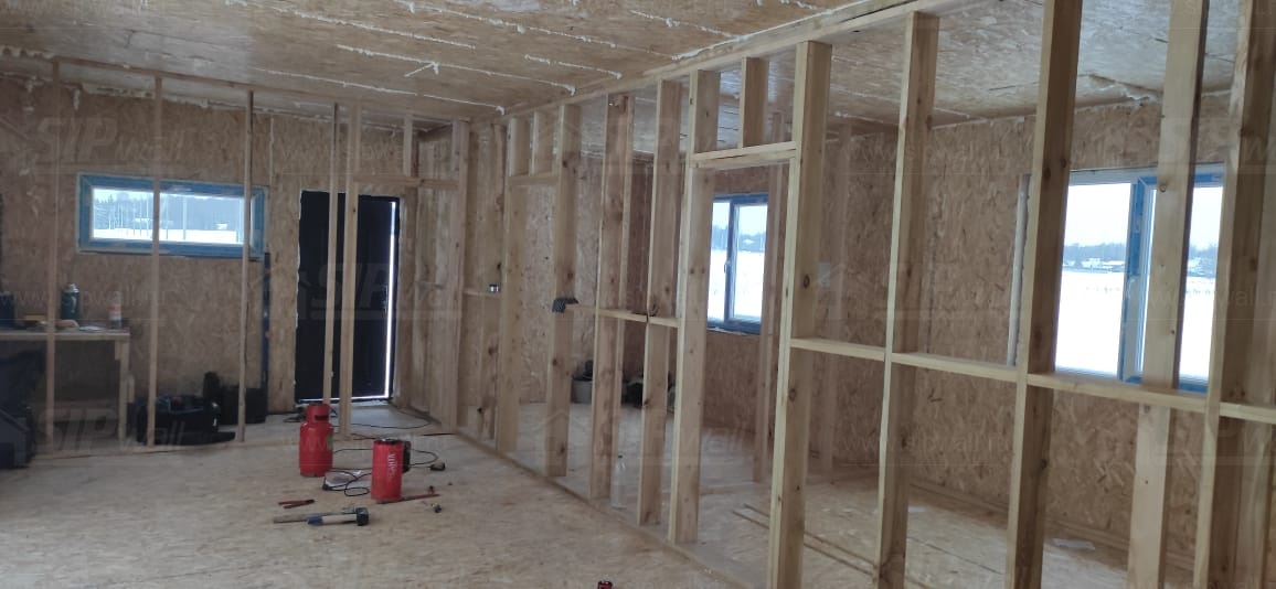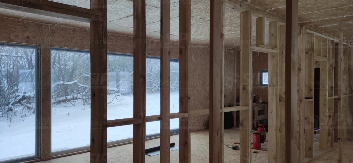 Все СИП панели SIPwall толщиной 224/174/124 мм (плиты OSB-3 толщиной 12 мм "Калевала" Россия и фасадный пенополистирол ППС-14 толщиной 200/150/100 мм производства, Россия) нарезаны и обрусованы сухим строганным брусом камерной сушки в соответствии с проектной документацией.