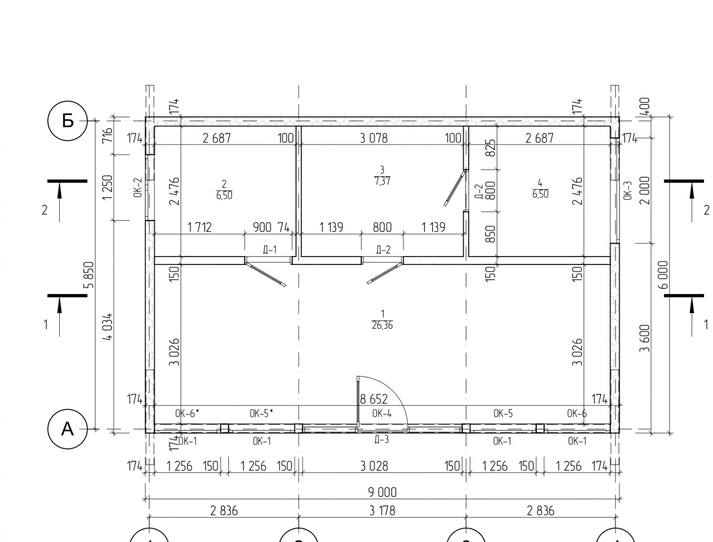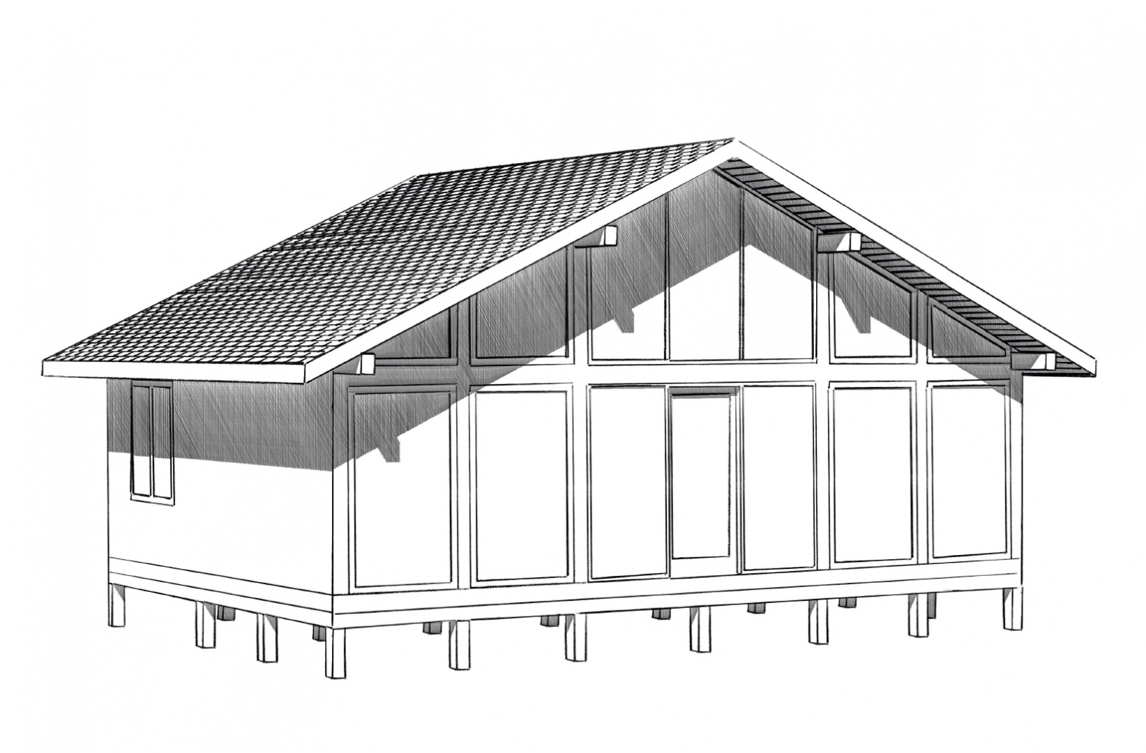 Комплектация домокомплекта: перекрытие на отметке +0.000 - СИП - 174У мм, несущие стены дома выполнены из СИП панелей 174 мм, внутренние несущие стены - СИП 174 мм, не несущие стены - СИП 124 мм Кровля - СИП 174У.