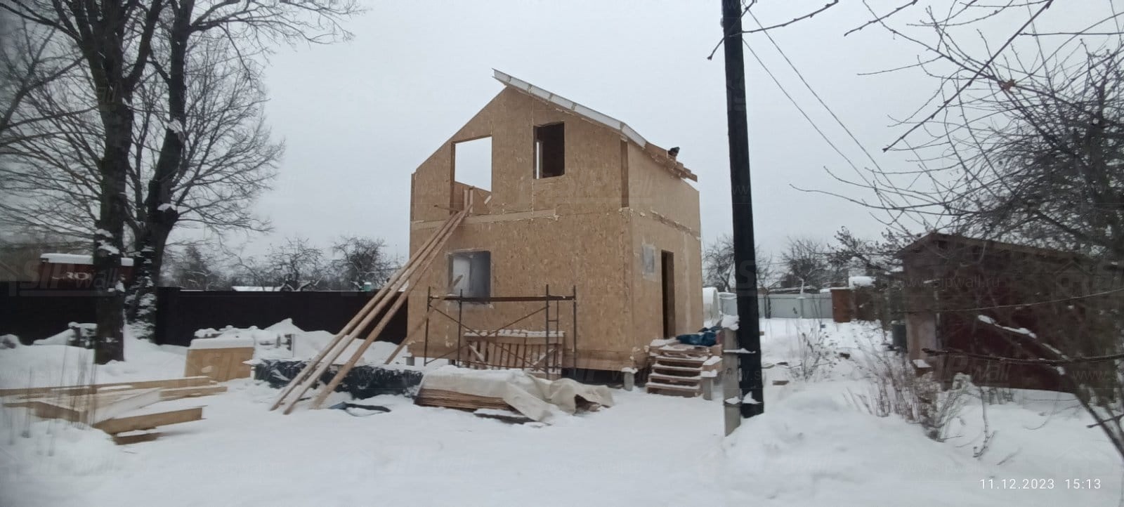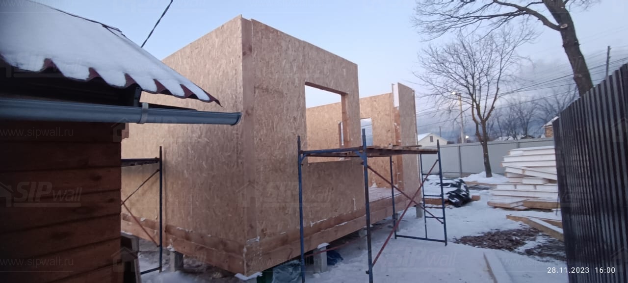Все СИП панели SIPwall толщиной 224/174/124 мм (плиты OSB-3 толщиной 12 мм "Калевала" Россия и фасадный пенополистирол ППС-14 толщиной 200/150/100 мм производства, Россия) нарезаны и обрусованы сухим строганным брусом камерной сушки в соответствии с проектной документацией.