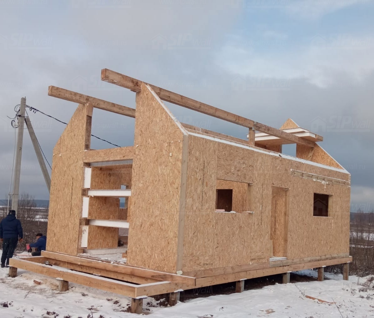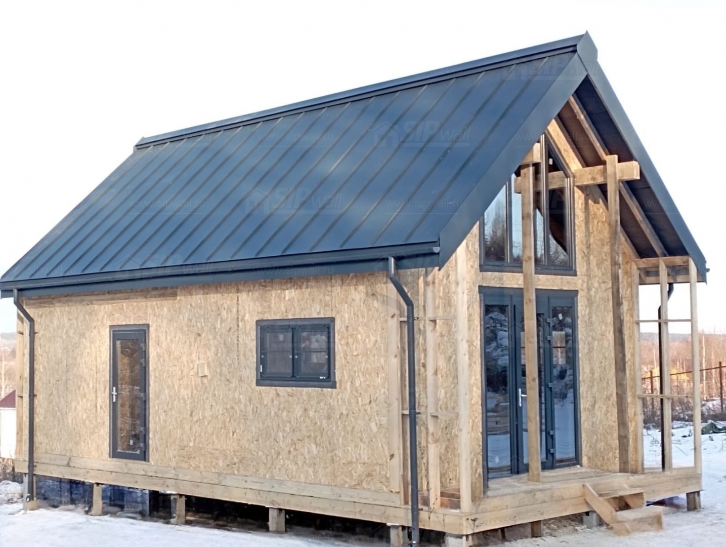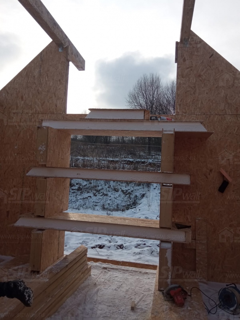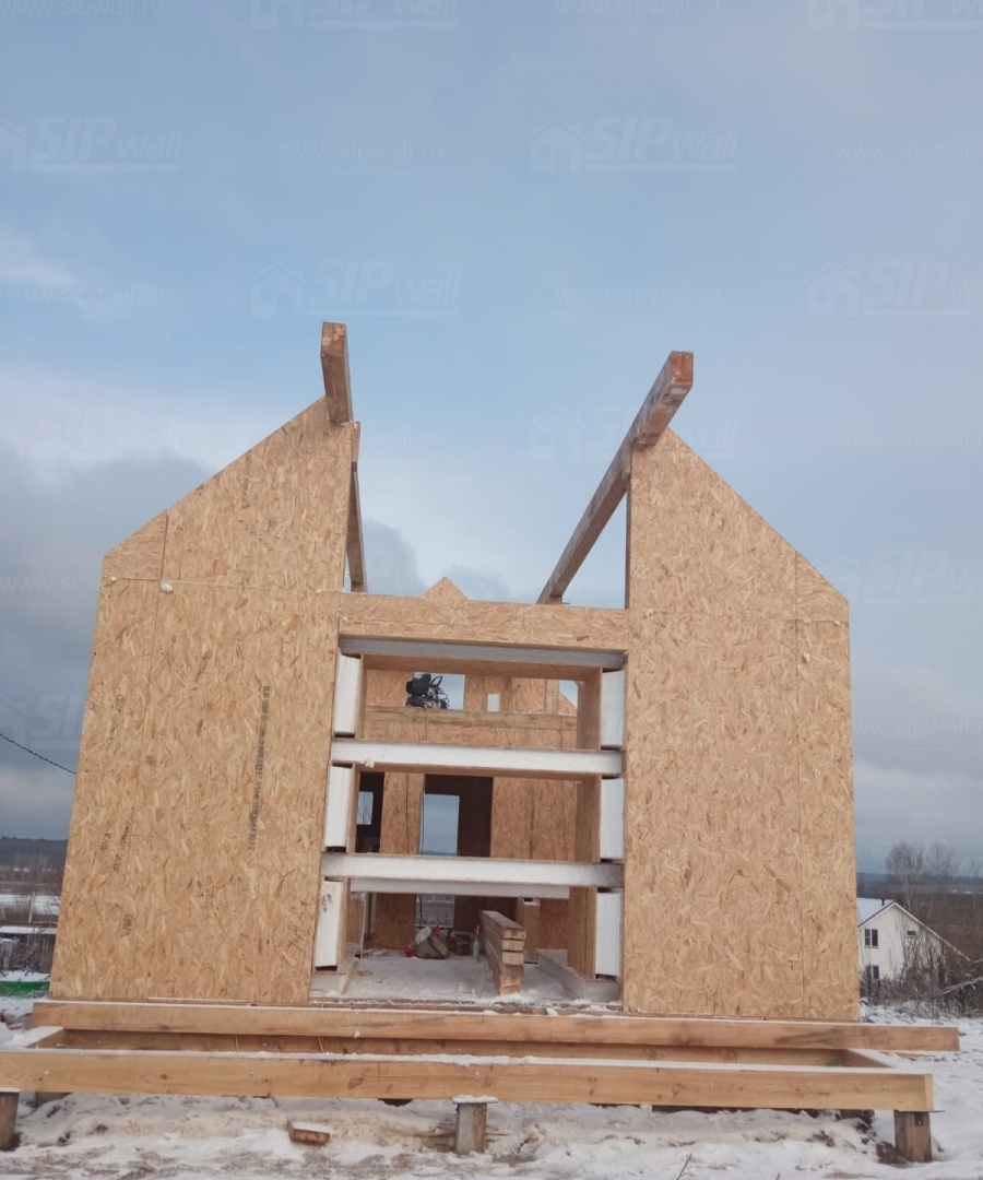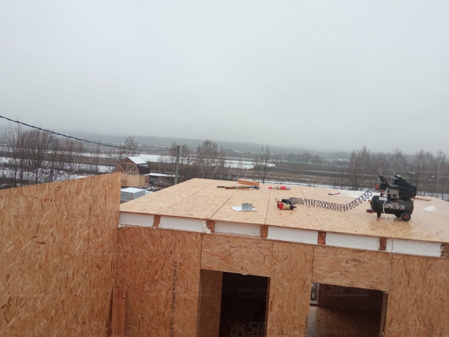 Все СИП панели SIPwall толщиной 224/174/124 мм (плиты OSB-3 толщиной 12 мм, Россия и фасадный пенополистирол ПСБ-С 25Ф по ТУ 22.21.41.110−004 – 44755395 −2017 толщиной 200/150/100 мм производства завода "PolarPlast", Россия) нарезаны и обрусованы сухим строганным брусом камерной сушки в соответствии с проектной документацией.