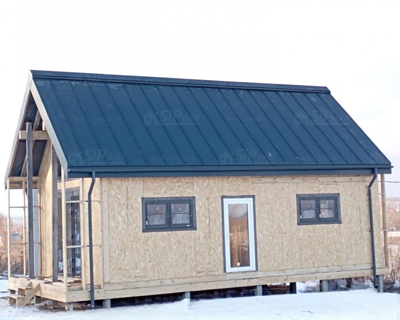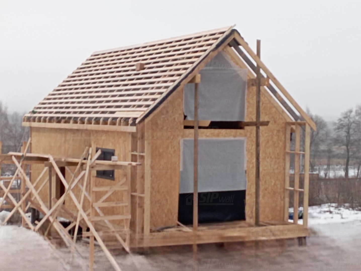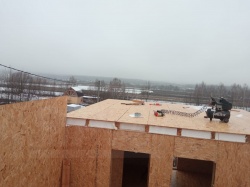 Комплектация домокомплекта: перекрытие на отметке +0.000 - СИП - 174У мм., несущие стены дома выполнены из СИП панелей 174 мм., внутренние несущие стены и внутренние не несущие перегородки выполнены по каркасной технологии. Кровля - СИП - 174У мм.