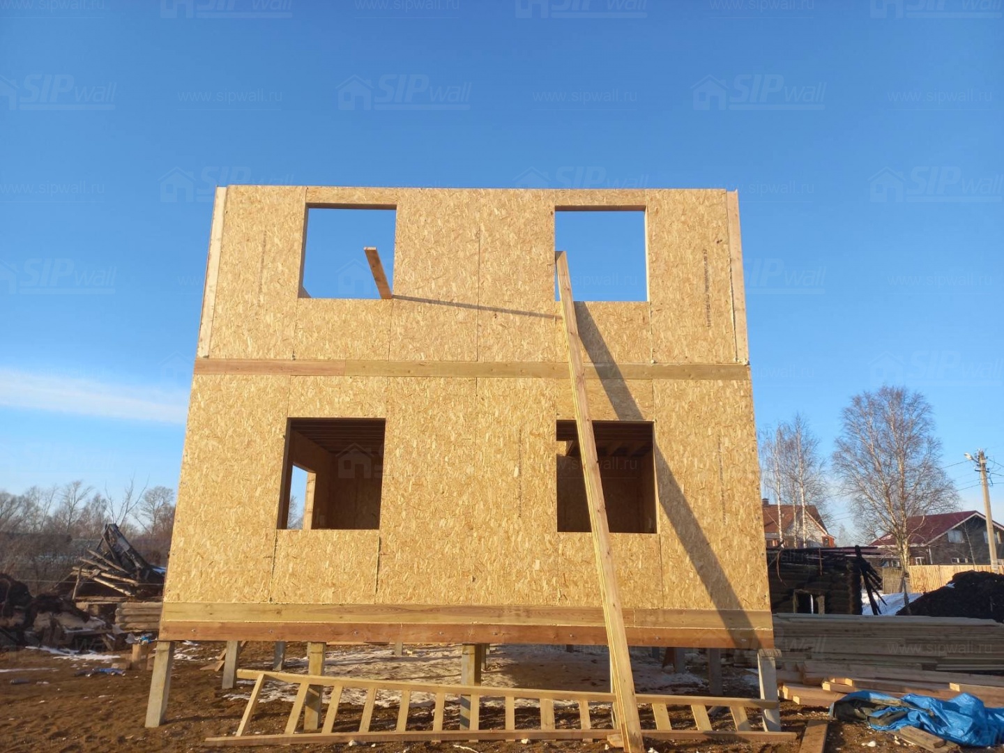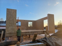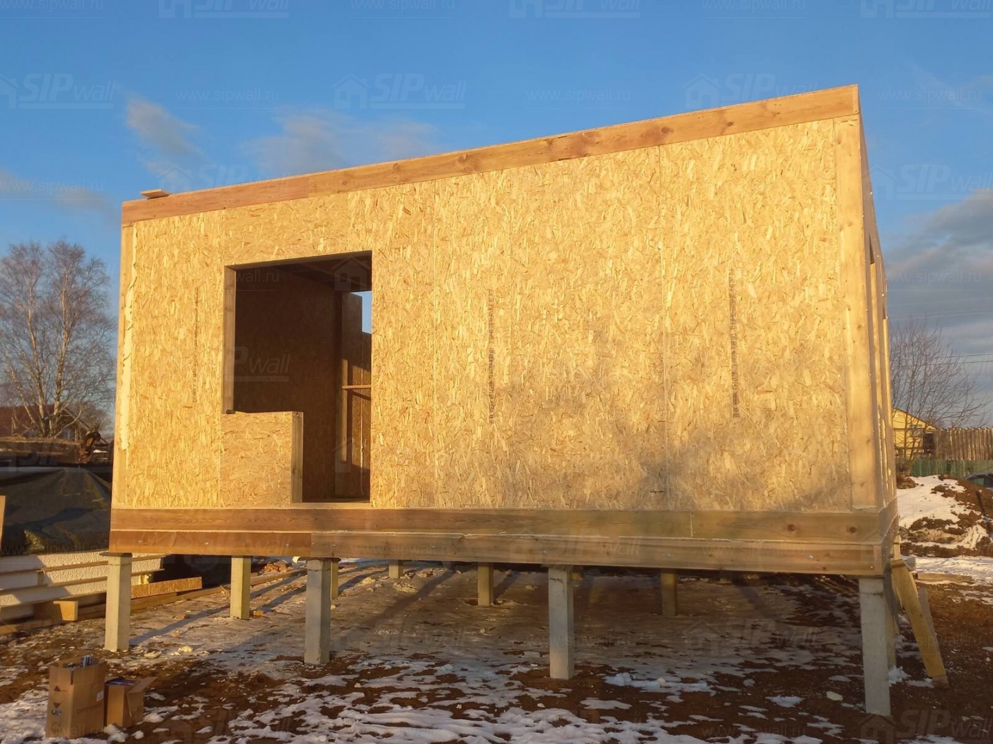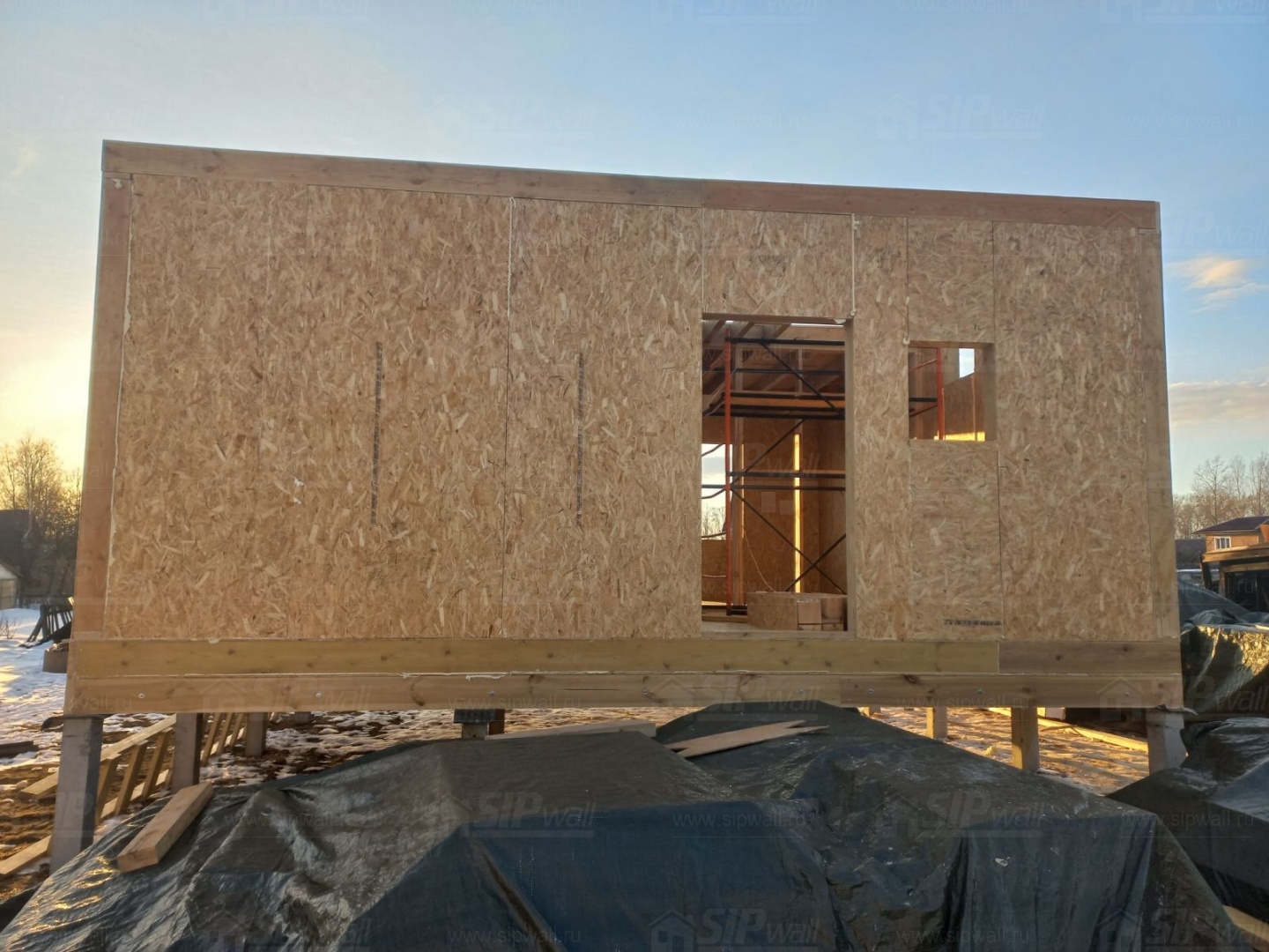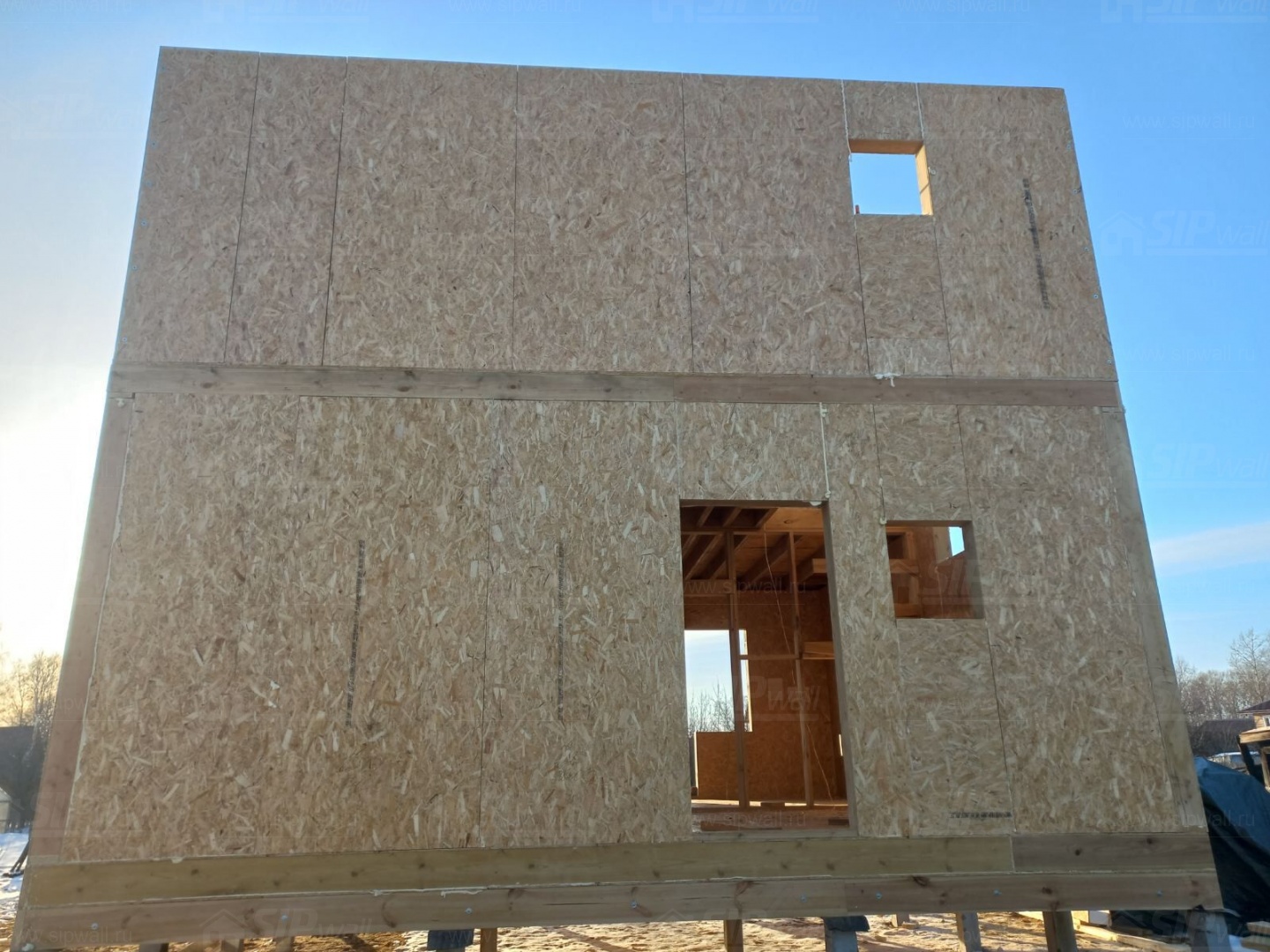 Все СИП панели SIPwall толщиной 224/174/124 мм (плиты OSB-3 толщиной 12 мм "Калевала" Россия и фасадный пенополистирол ППС-14 толщиной 200/150/100 мм производства, Россия) нарезаны и обрусованы сухим строганным брусом камерной сушки в соответствии с проектной документацией.
