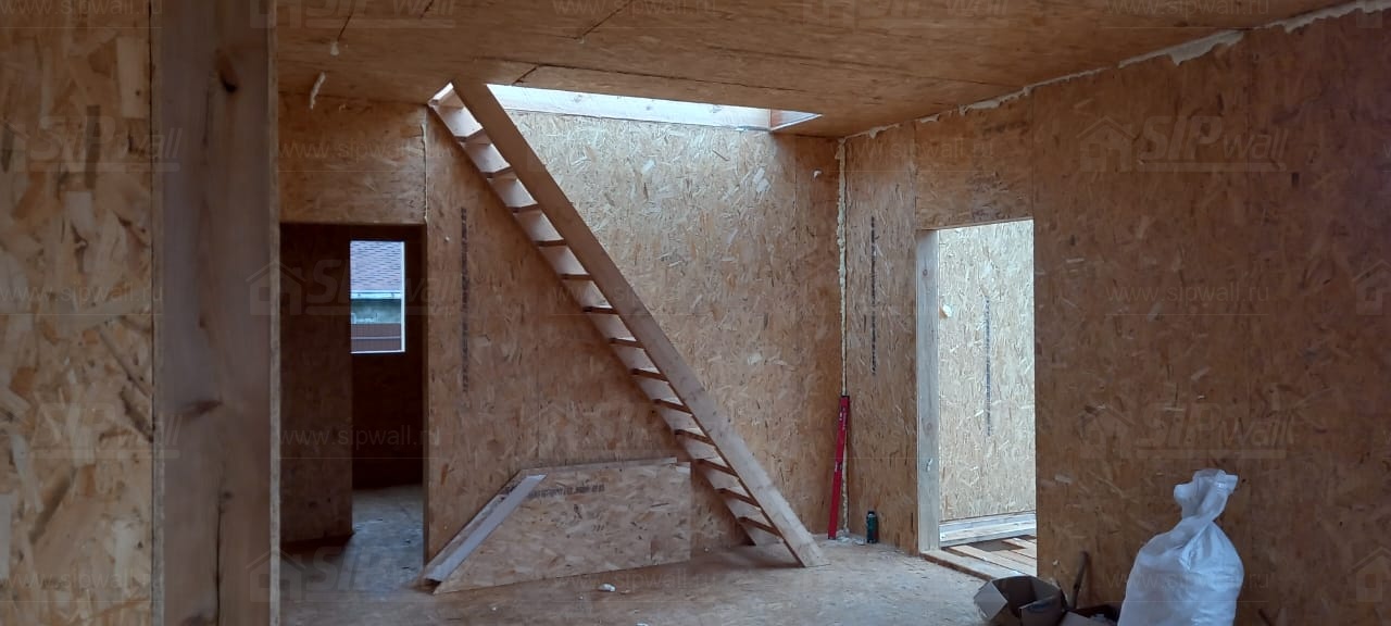 Все СИП панели SIPwall толщиной 224/174/124 мм (плиты OSB-3 толщиной 12 мм "Калевала" Россия и фасадный пенополистирол ППС-14 толщиной 200/150/100 мм производства, Россия) нарезаны и обрусованы сухим строганным брусом камерной сушки в соответствии с проектной документацией.