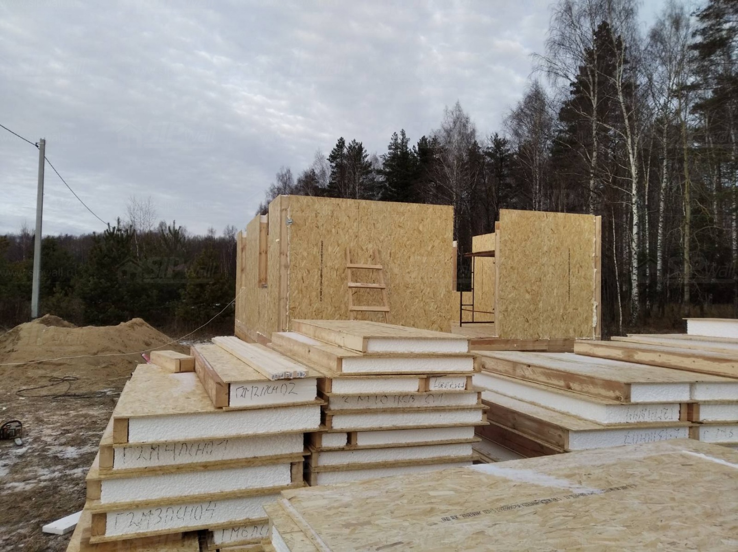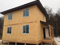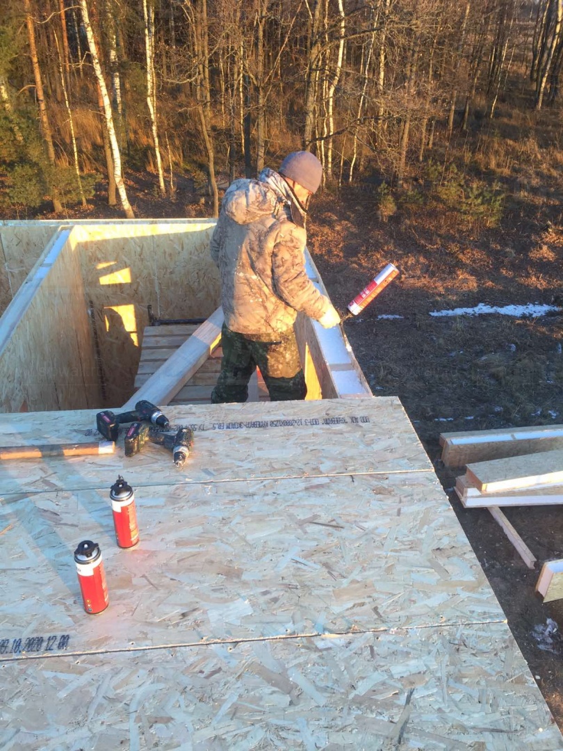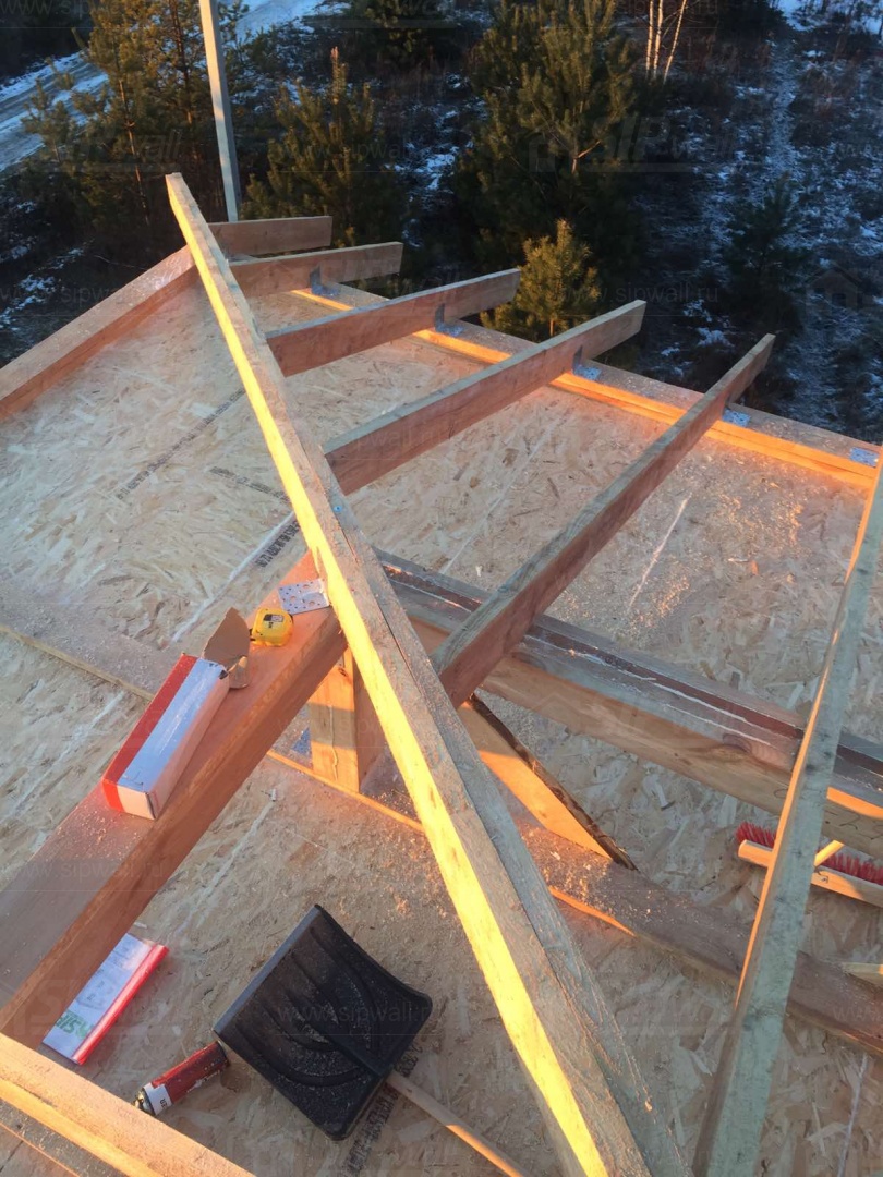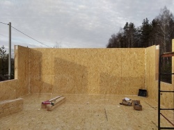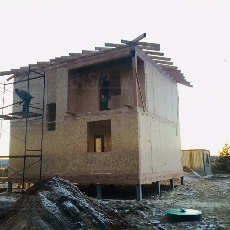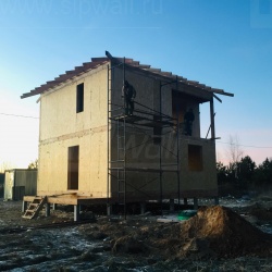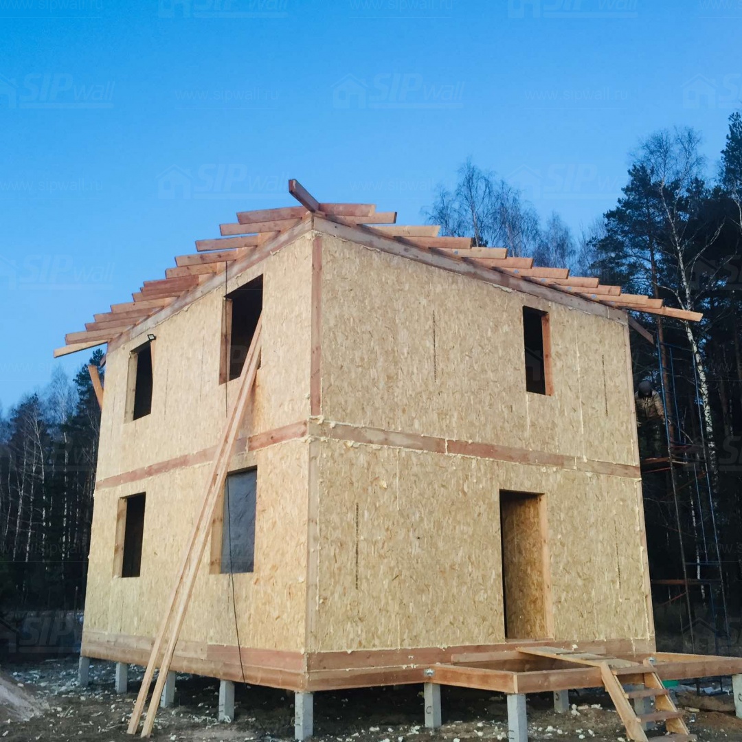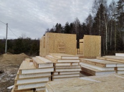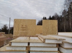 Все СИП панели SIPwall толщиной 224/174/124 мм (плиты OSB-3 толщиной 12 мм "Калевала" Россия и фасадный пенополистирол ППС-14 толщиной 200/150/100 мм производства, Россия) нарезаны и обрусованы сухим строганным брусом камерной сушки в соответствии с проектной документацией.