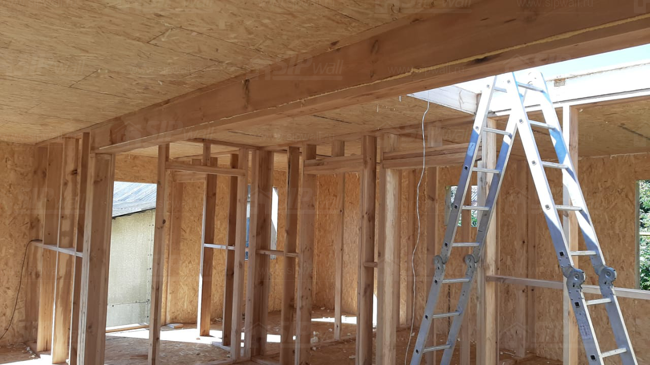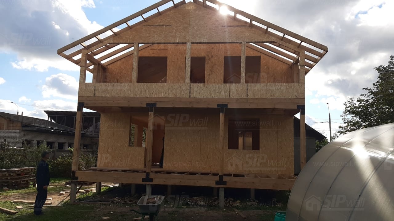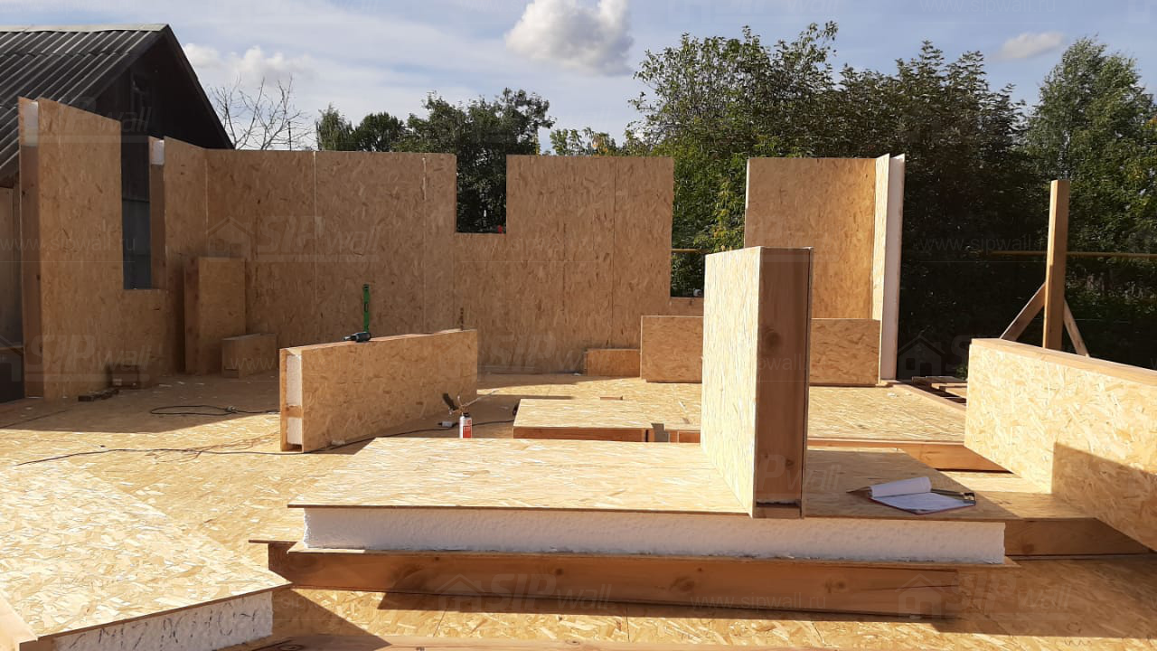 Все СИП панели SIPwall толщиной 224/174/124 мм (плиты OSB-3 толщиной 12 мм "Калевала" Россия и фасадный пенополистирол ППС-14 толщиной 200/150/100 мм производства, Россия) нарезаны и обрусованы сухим строганным брусом камерной сушки в соответствии с проектной документацией.