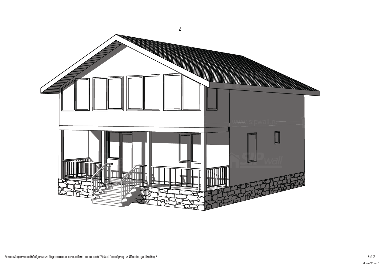 Домокомплект - изготовлен по проекту из СИП панелей произведенный по технологии SIPwall (ЭКОПАН) на собственном заводе расположенном в г. Шуя, Ивановской области. При изготовлении домокомплекта панельно каркасного дома используется только сухой строганный брус камерной сушки, обработанный огнебиозащитным составом.