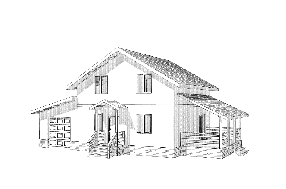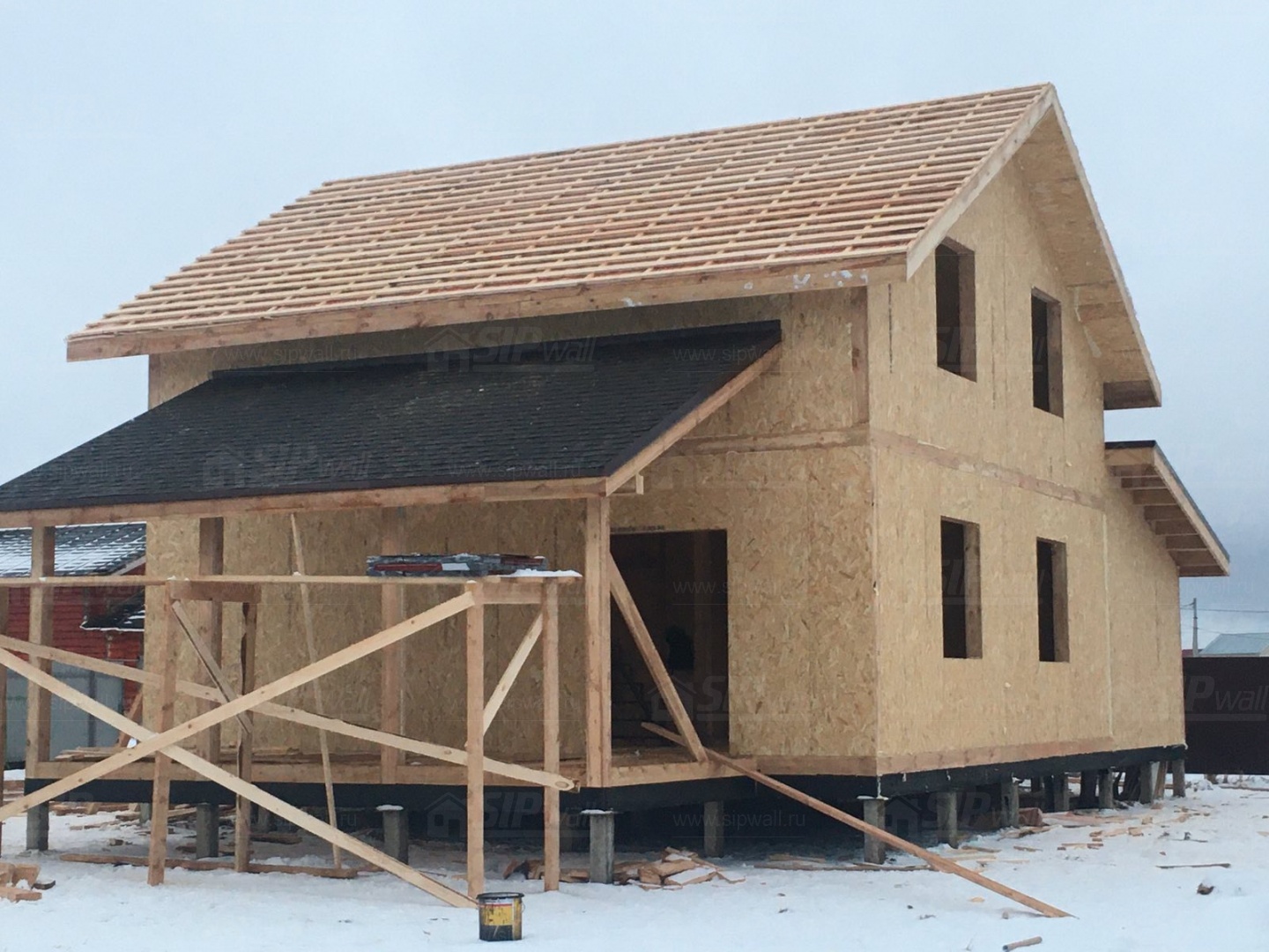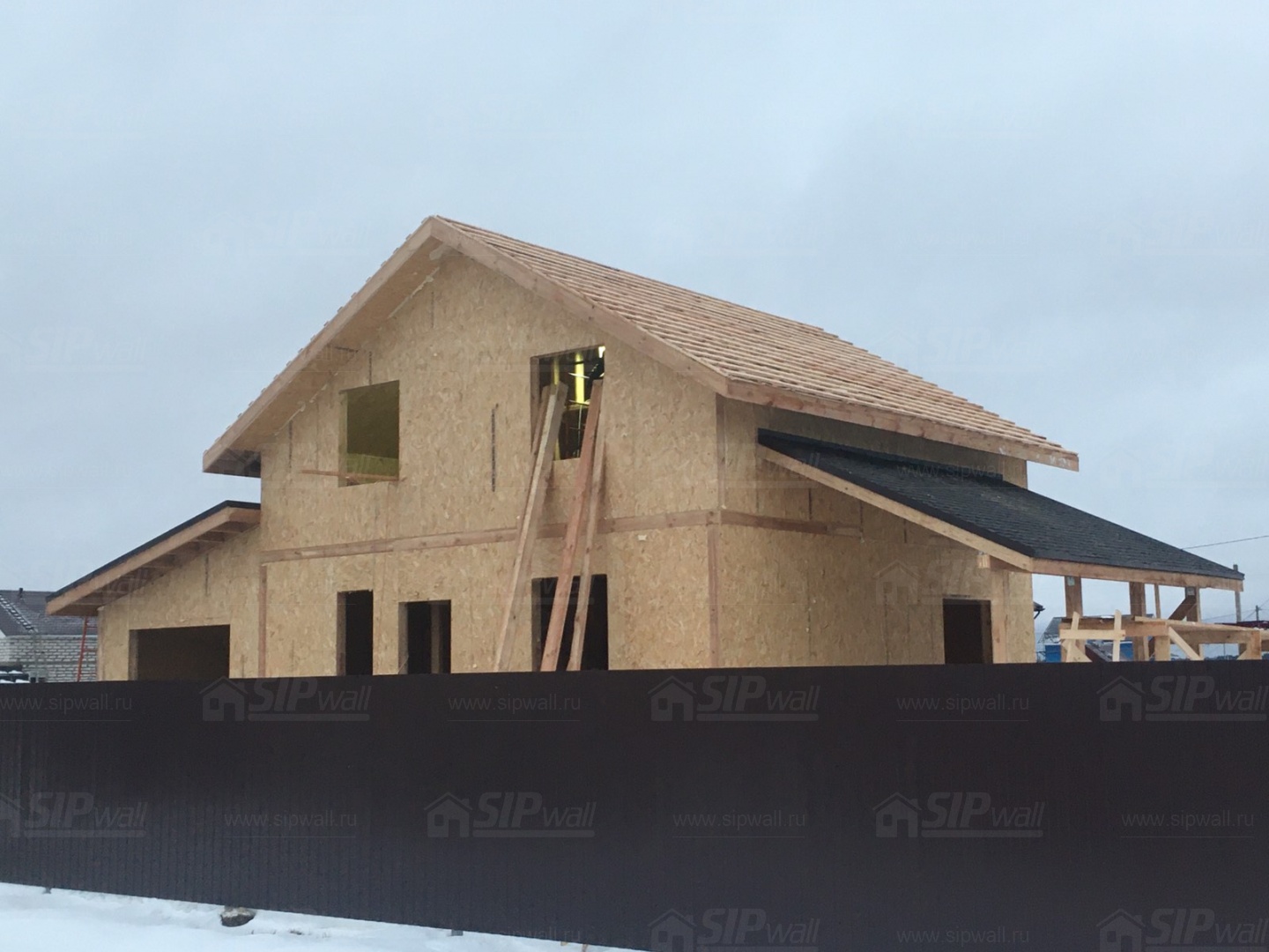 <b>Домокомплект</b> - изготовлен по проекту из СИП панелей произведенный по технологии SIPwall (ЭКОПАН) на собственном заводе расположенном в г. Шуя, Ивановской области. При изготовлении домокомплекта панельно каркасного дома используется только сухой строганный брус камерной сушки, обработанный огнебиозащитным составом.<br>