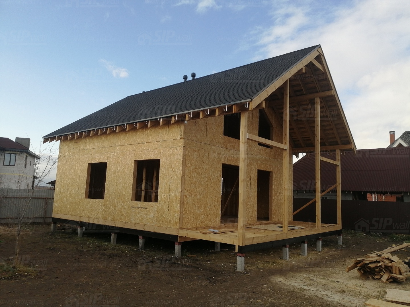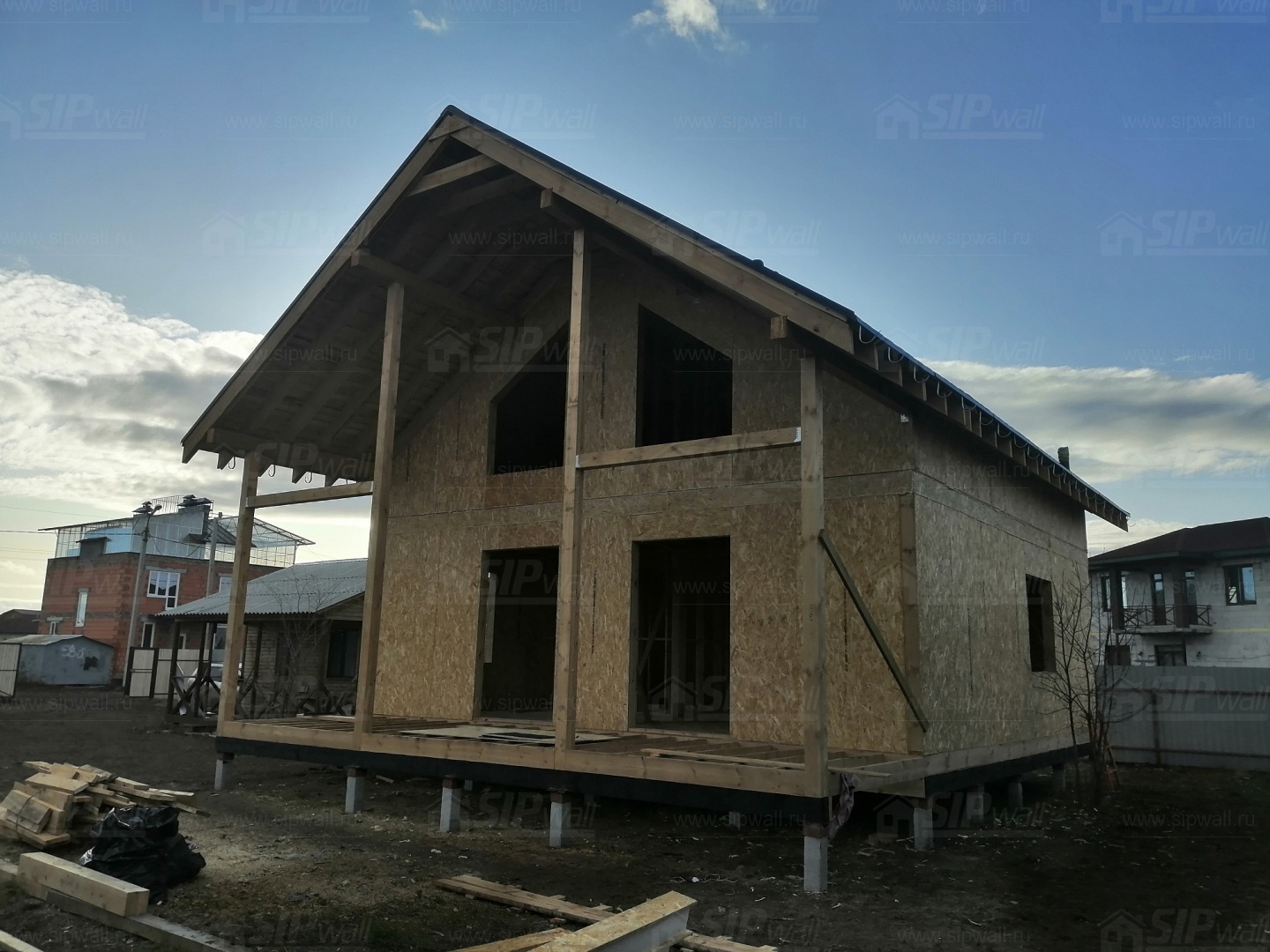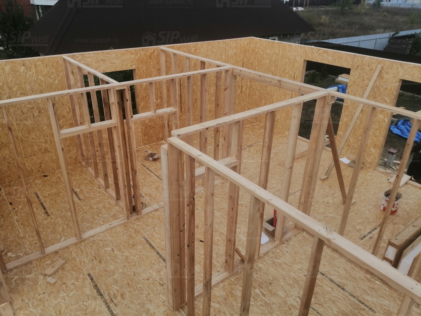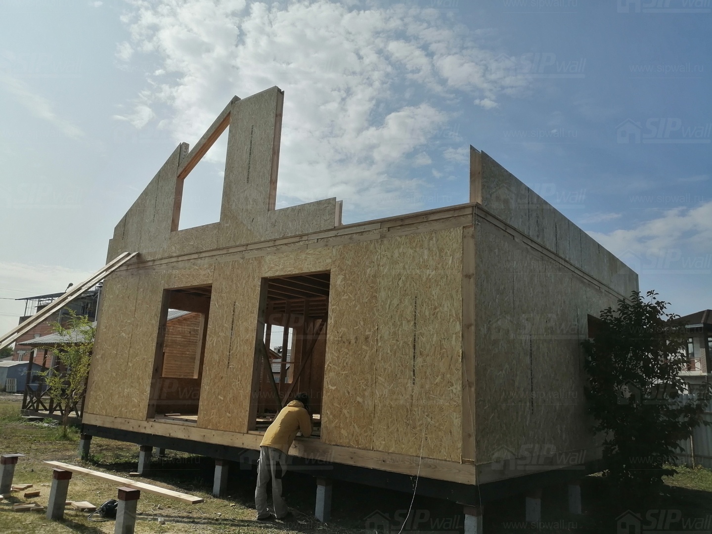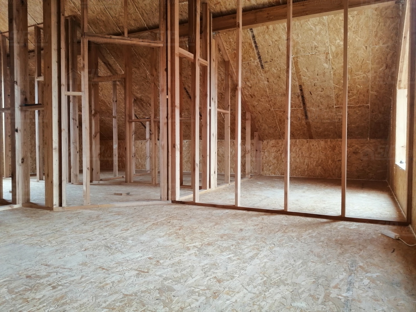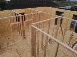 Все СИП панели SIPwall толщиной 224/174/124 мм (плиты OSB-3 толщиной 12 мм "Калевала" Россия и фасадный пенополистирол ПСБ-С 25 по ГОСТ 15588-14 толщиной 200/150/100 мм производства завода "PolarPlast", Россия) нарезаны и обрусованы сухим строганным брусом камерной сушки в соответствии с проектной документацией.