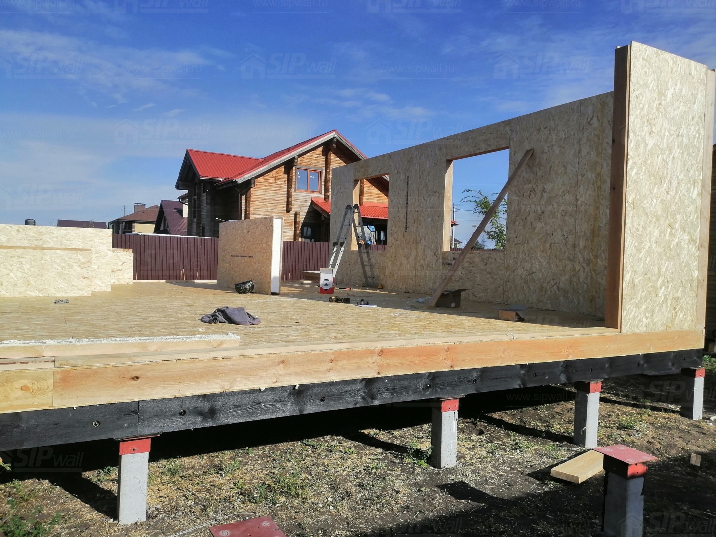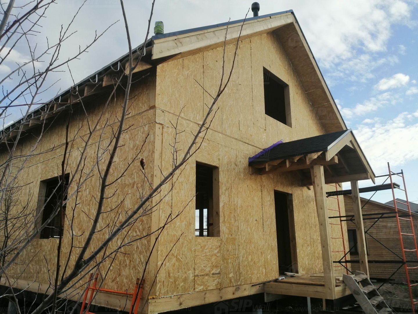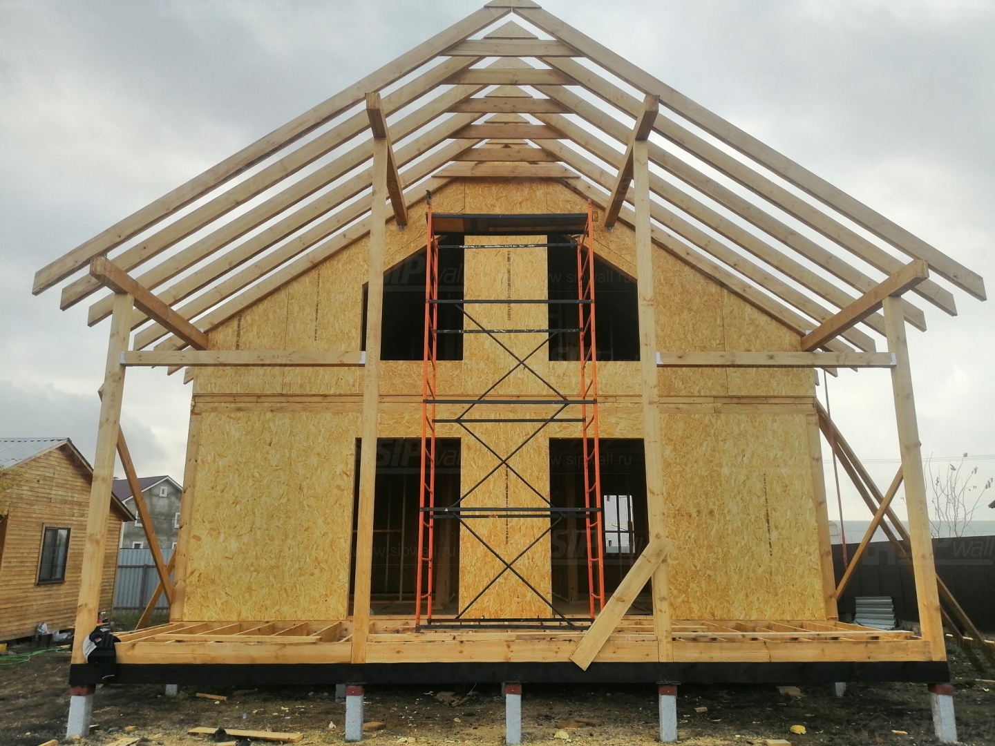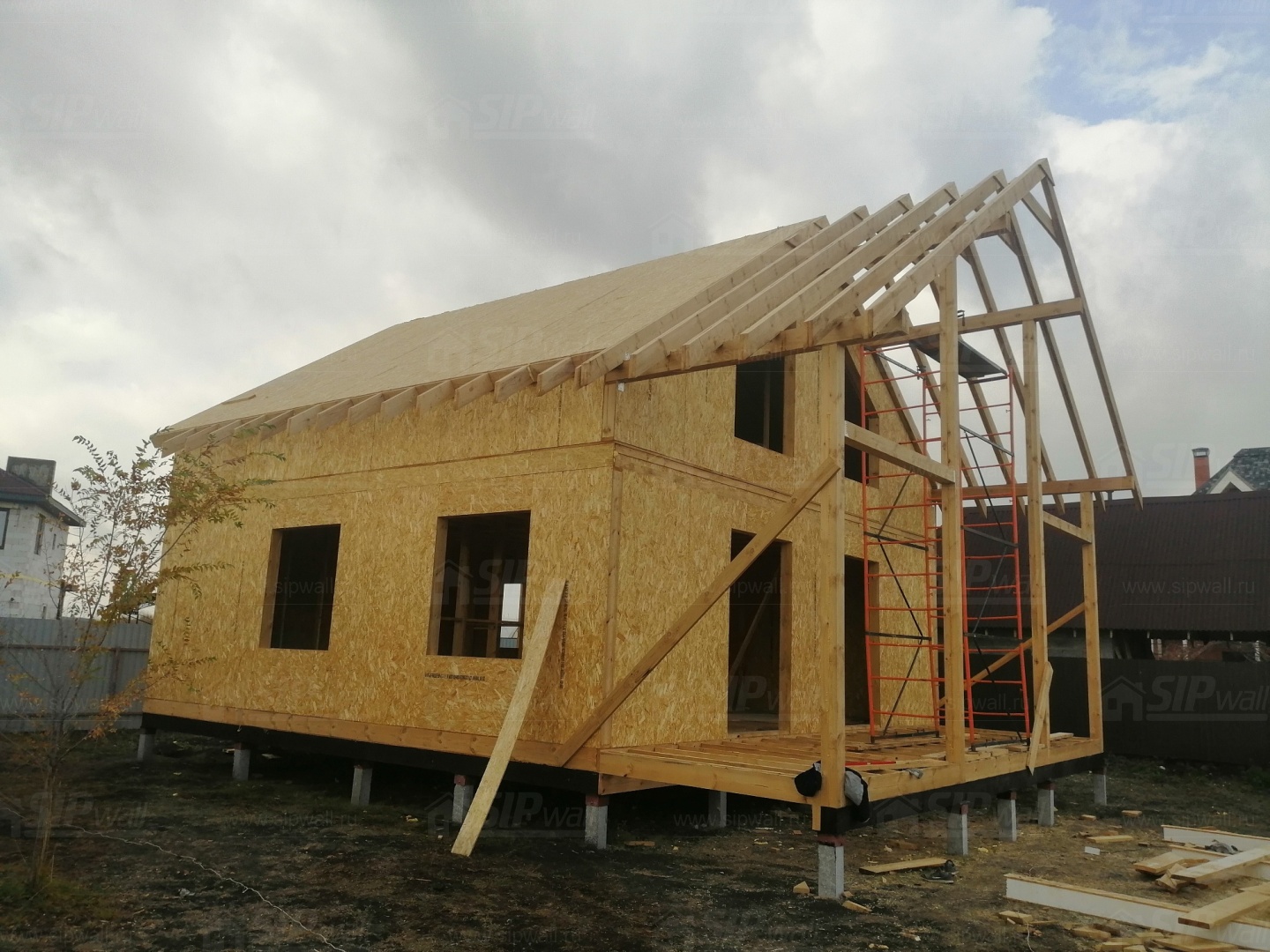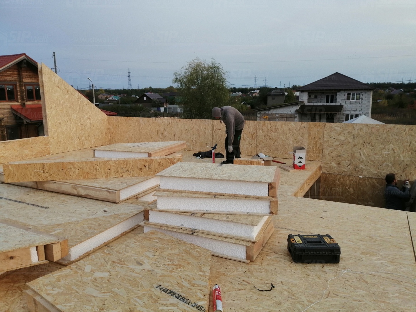 Все СИП панели SIPwall толщиной 224/174/124 мм (плиты OSB-3 толщиной 12 мм "Калевала" Россия и фасадный пенополистирол ПСБ-С 25 по ГОСТ 15588-14 толщиной 200/150/100 мм производства завода "PolarPlast", Россия) нарезаны и обрусованы сухим строганным брусом камерной сушки в соответствии с проектной документацией.
