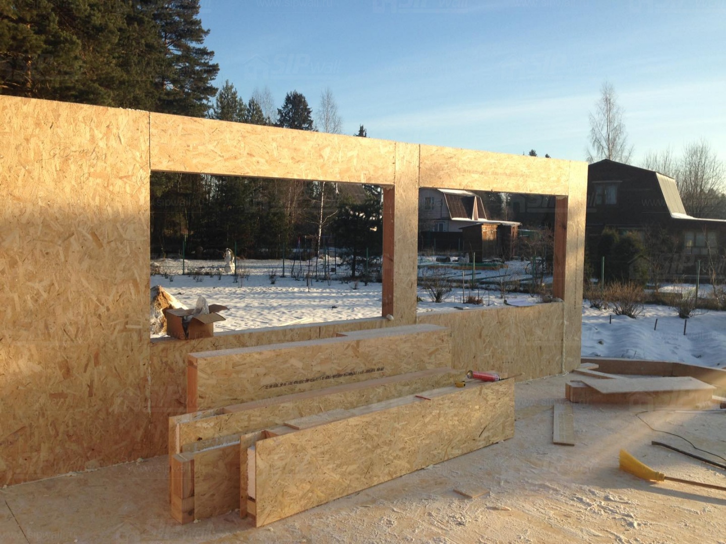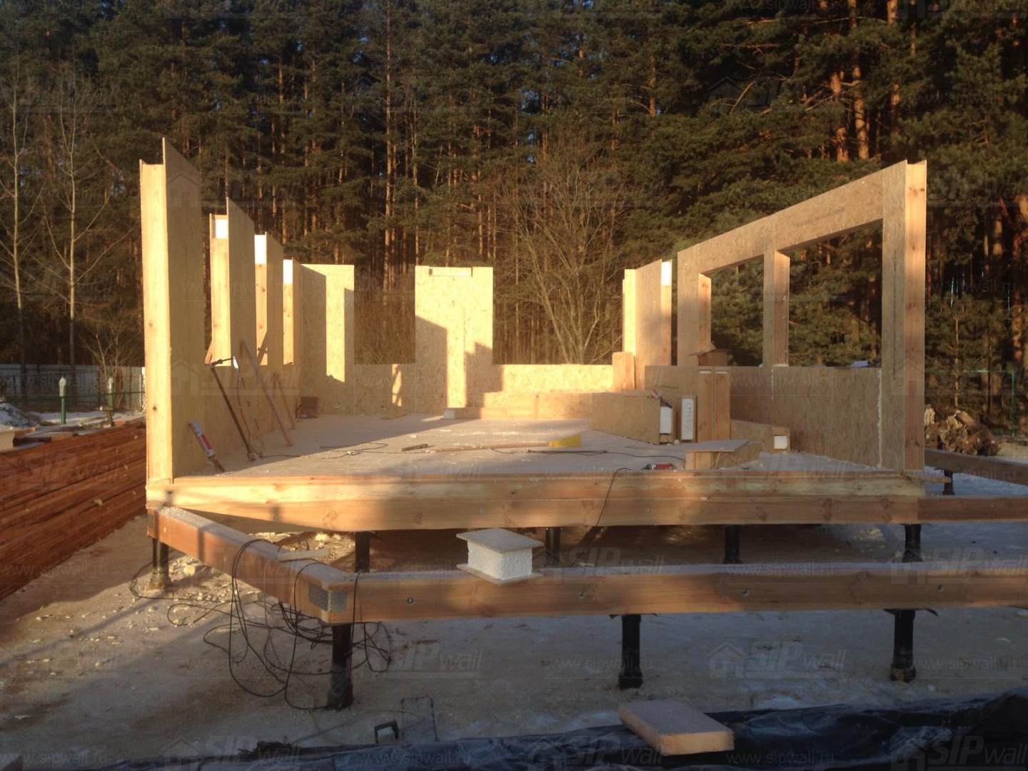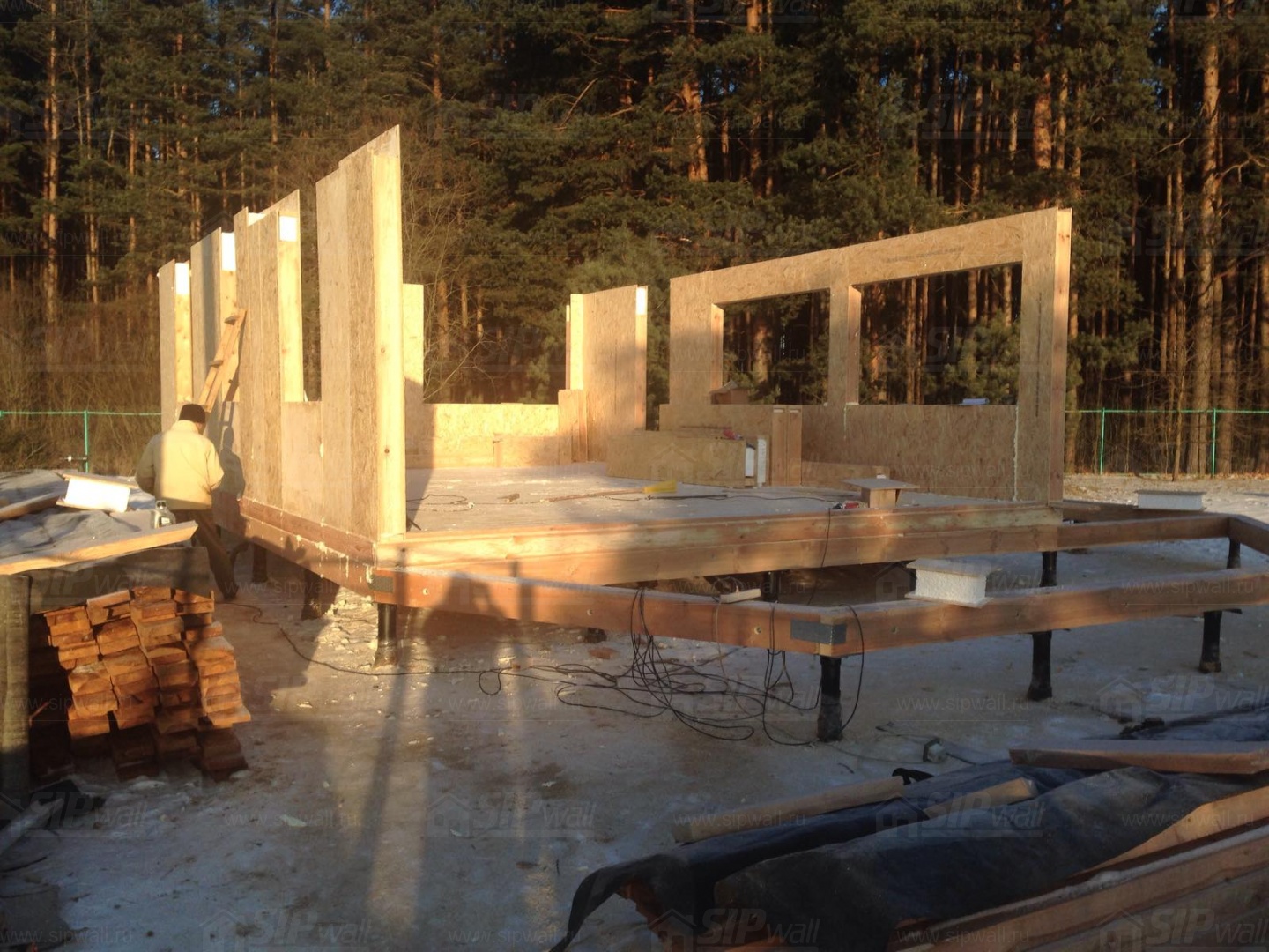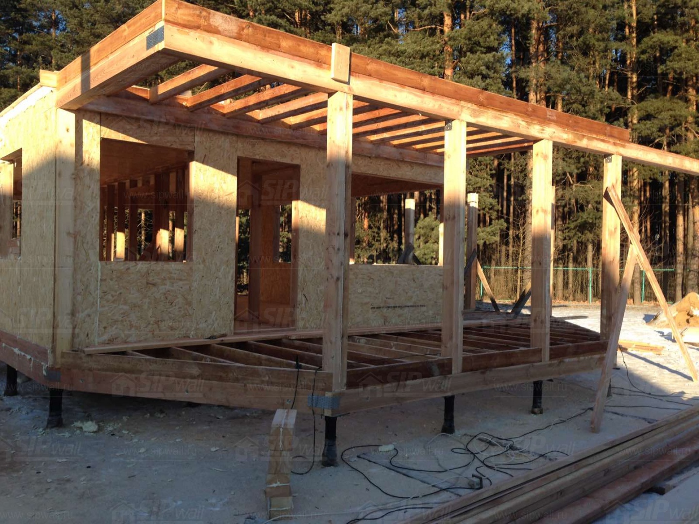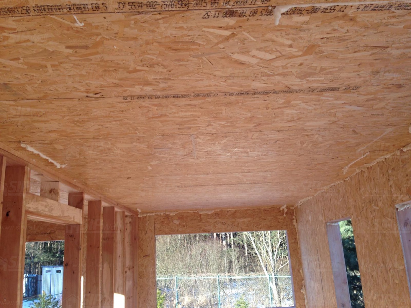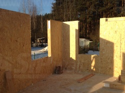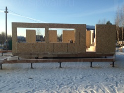 Все СИП панели SIPwall толщиной 224/174/124 мм (плиты OSB-3 толщиной 12 мм "Калевала" Россия и фасадный пенополистирол ППС-14 толщиной 200/150/100 мм производства, Россия) нарезаны и обрусованы сухим строганным брусом камерной сушки в соответствии с проектной документацией.