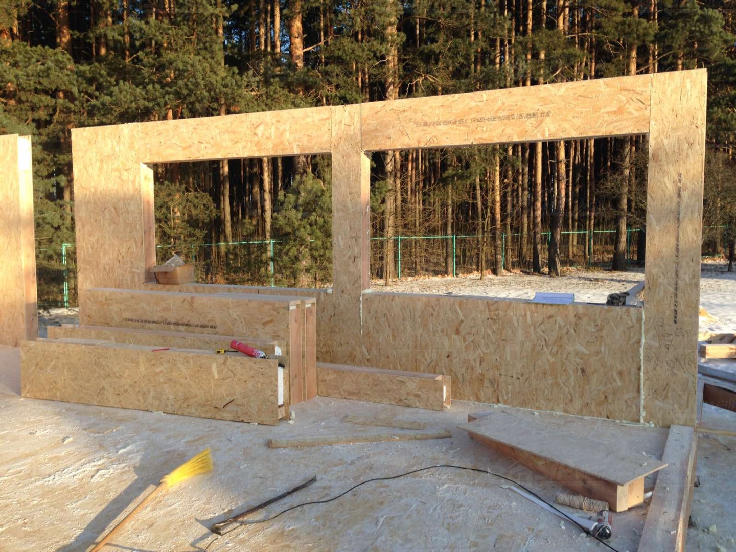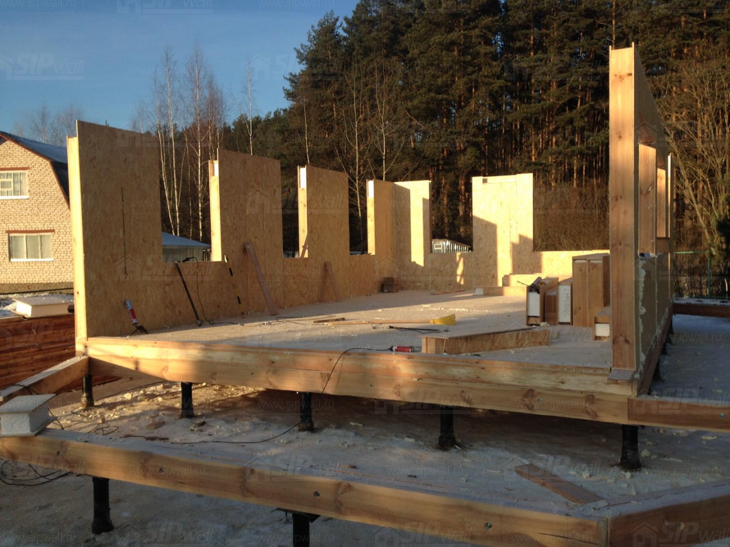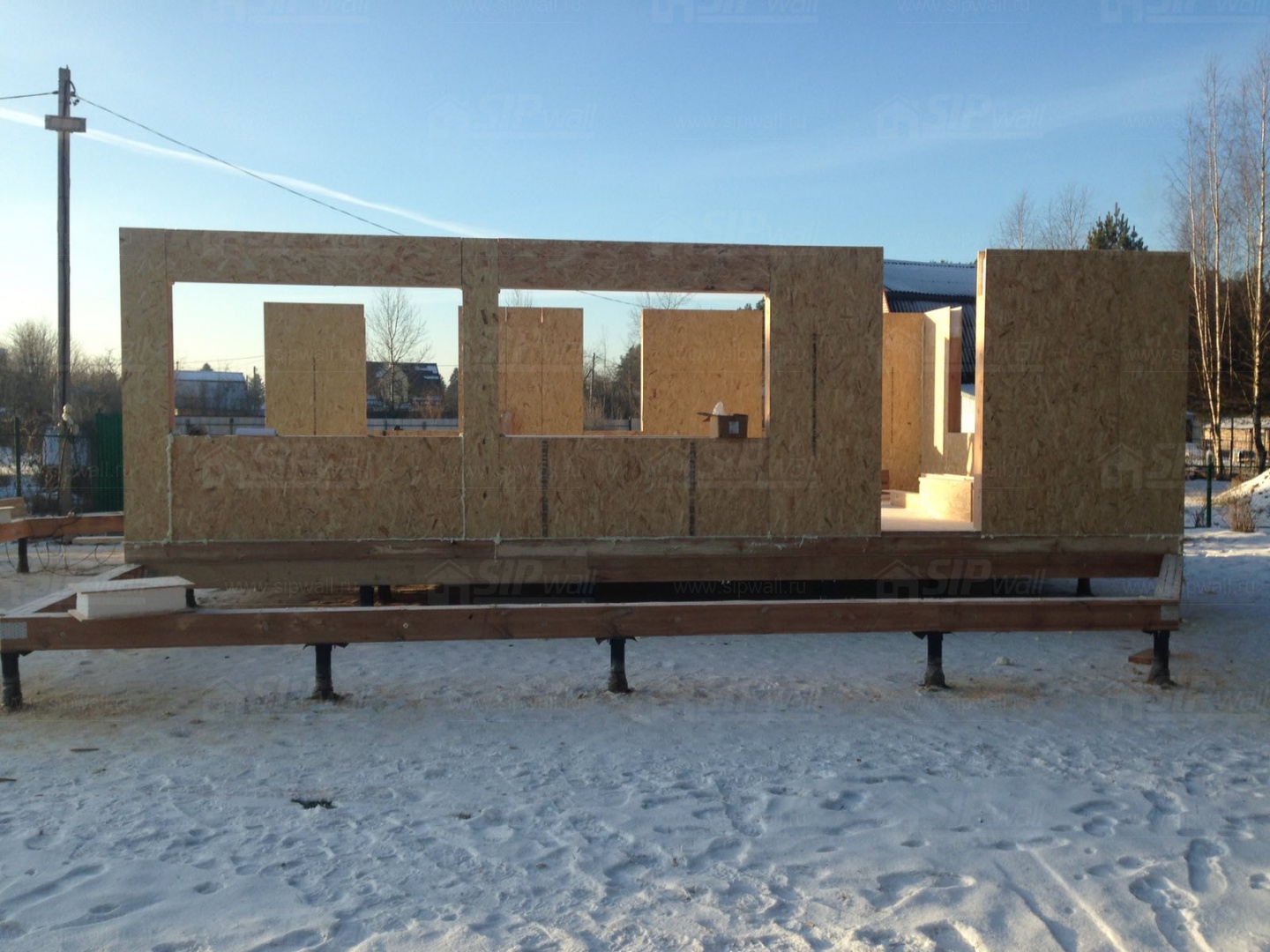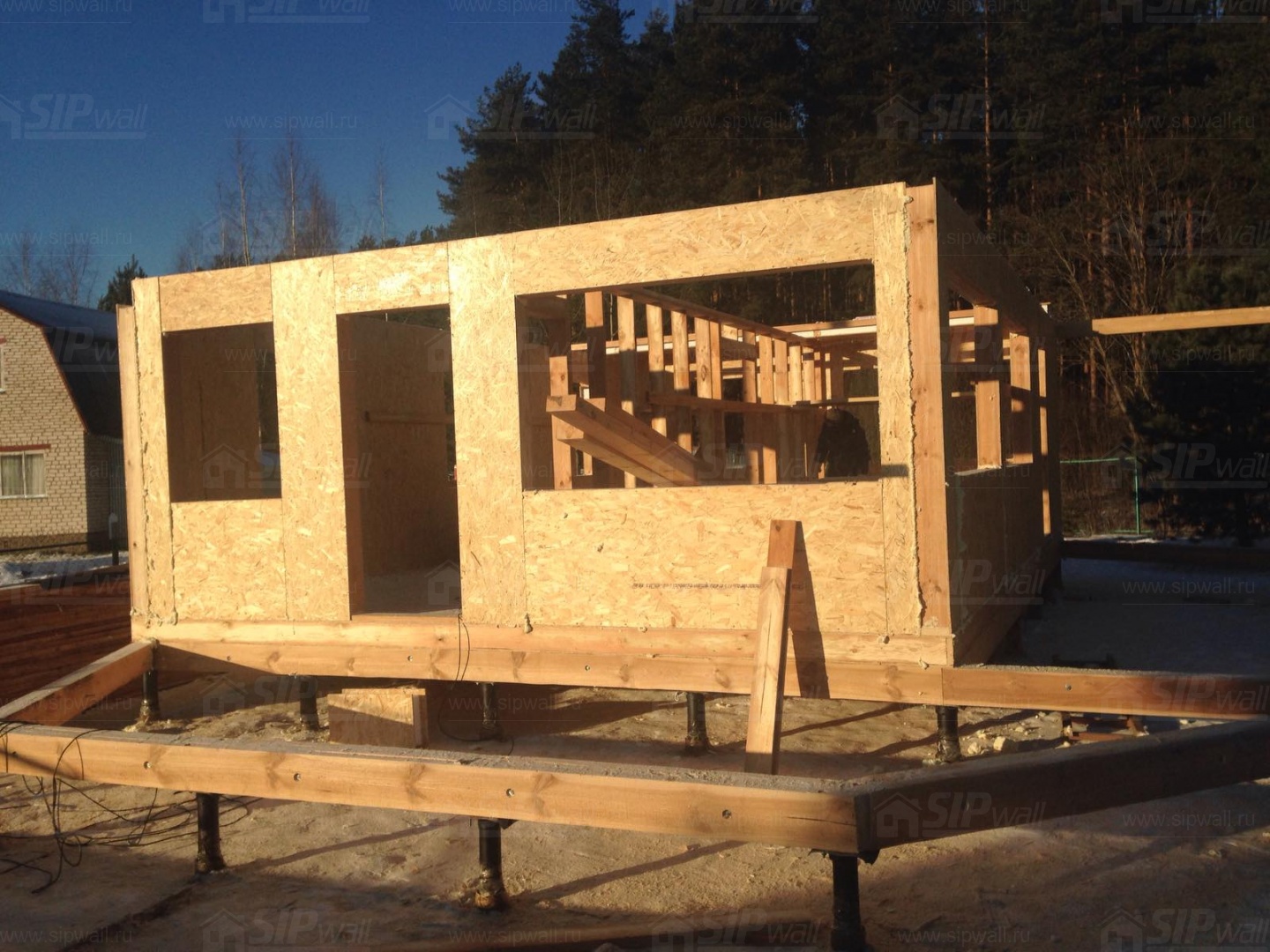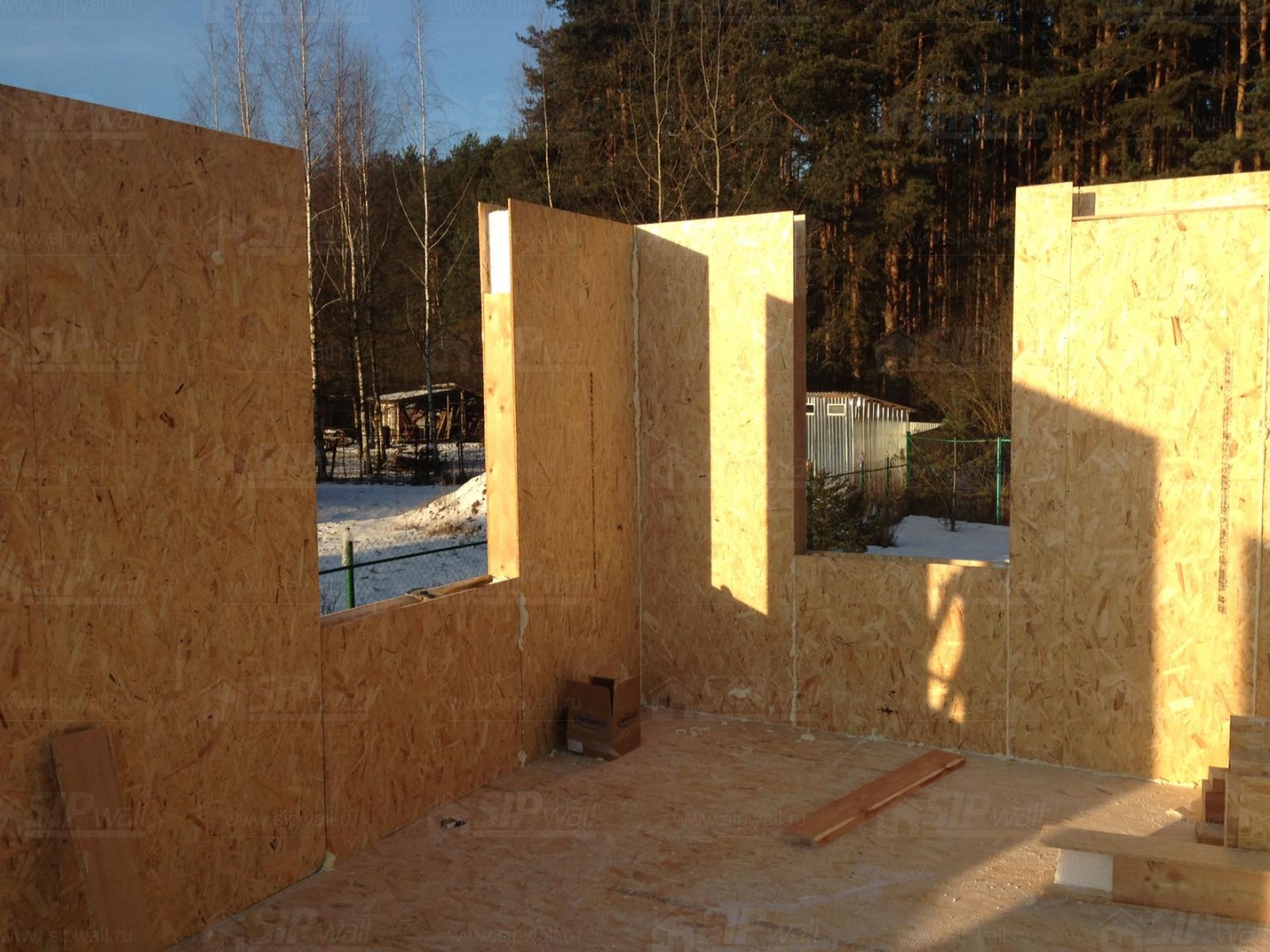 Все СИП панели SIPwall толщиной 224/174/124 мм (плиты OSB-3 толщиной 12 мм "Калевала" Россия и фасадный пенополистирол ППС-14 толщиной 200/150/100 мм производства, Россия) нарезаны и обрусованы сухим строганным брусом камерной сушки в соответствии с проектной документацией.