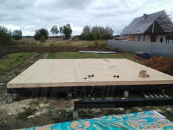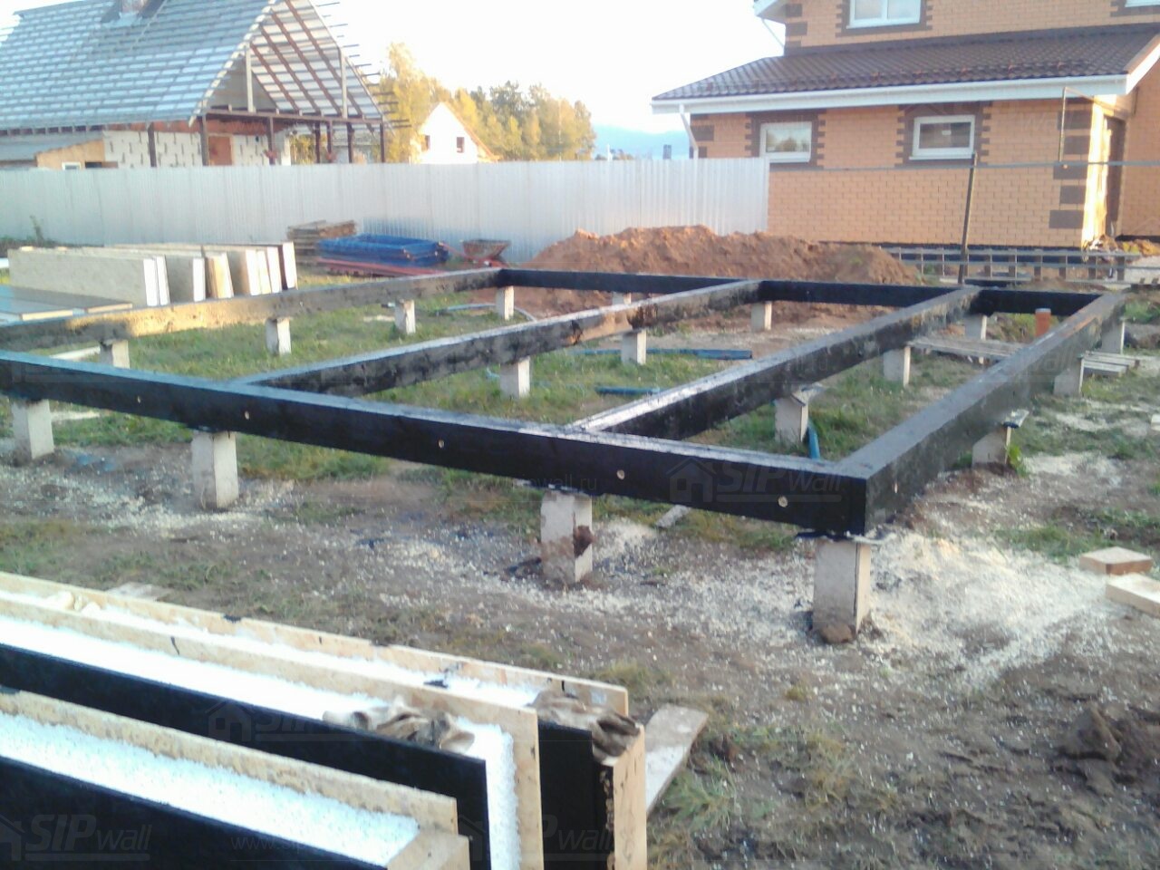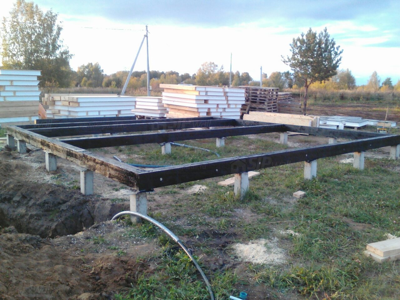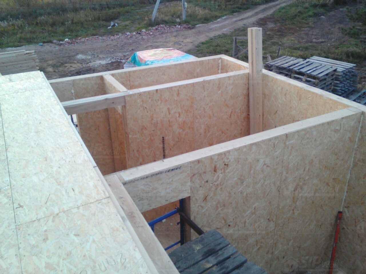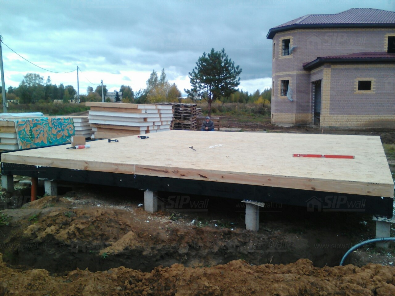 Комплектация домокомплекта: перекрытие на отметке +0.000 - СИП - 174У мм., несущие стены дома выполнены из СИП панелей 174 мм., внутренние несущие стены из СИП панелей 174 мм. и внутренние не несущие перегородки выполнены из СИП панелей 124 мм. Кровля - СИП - 174У мм.