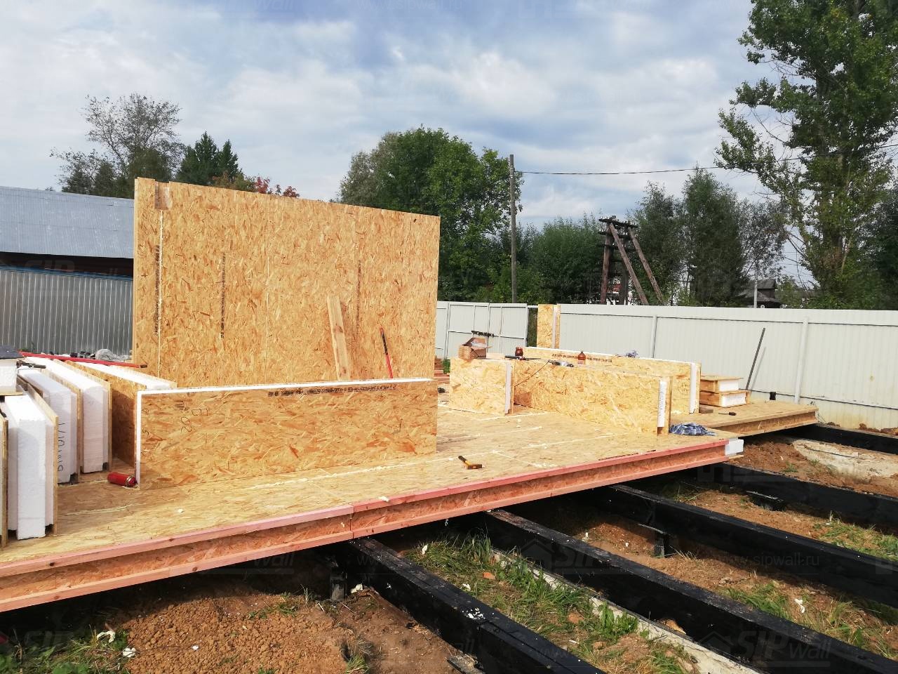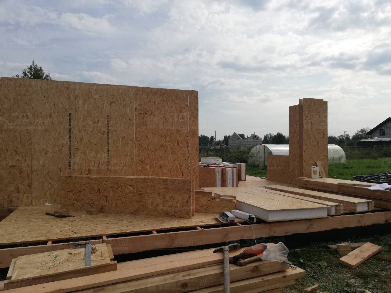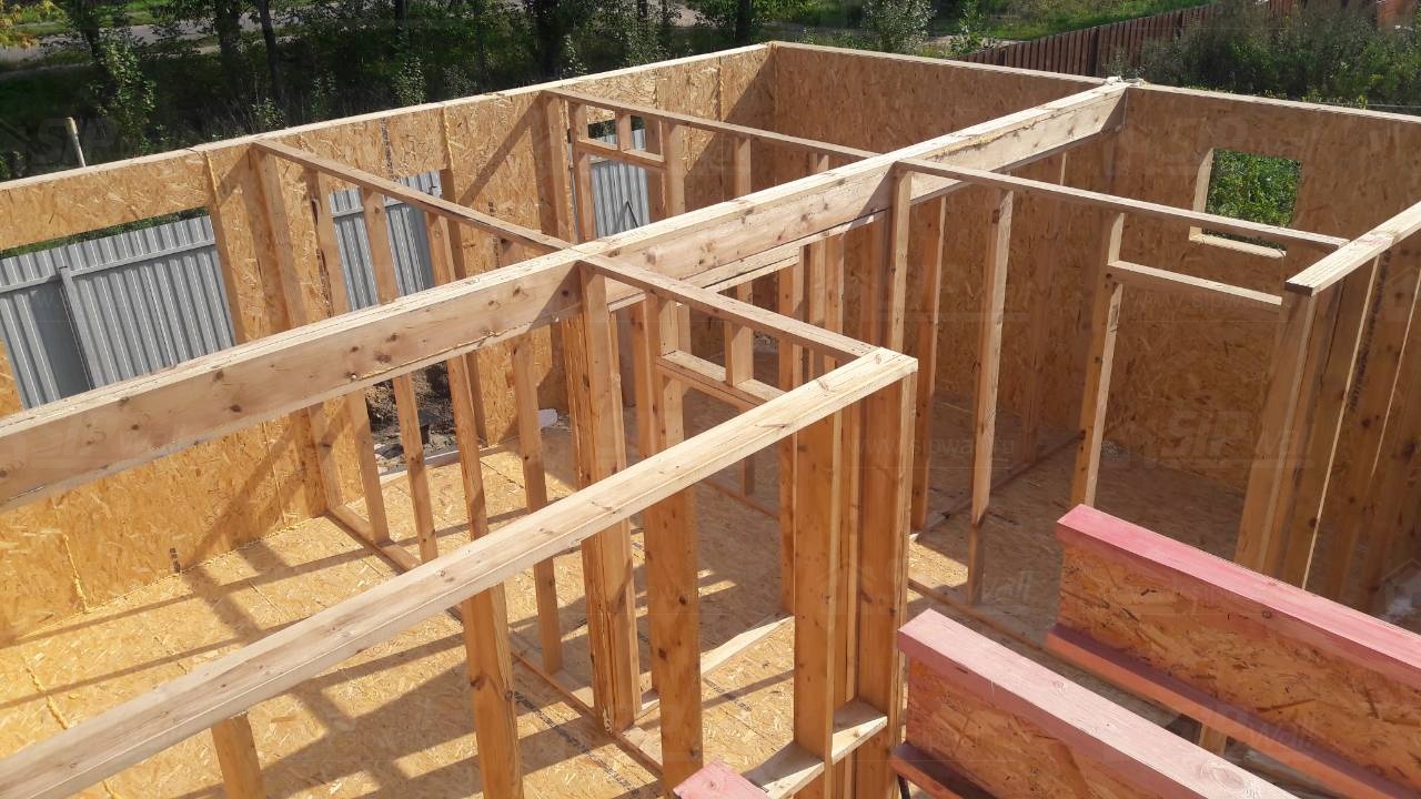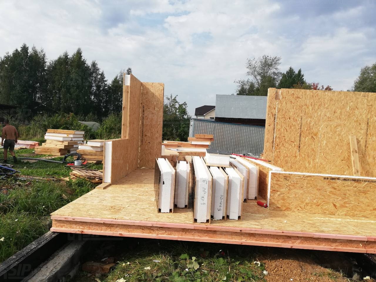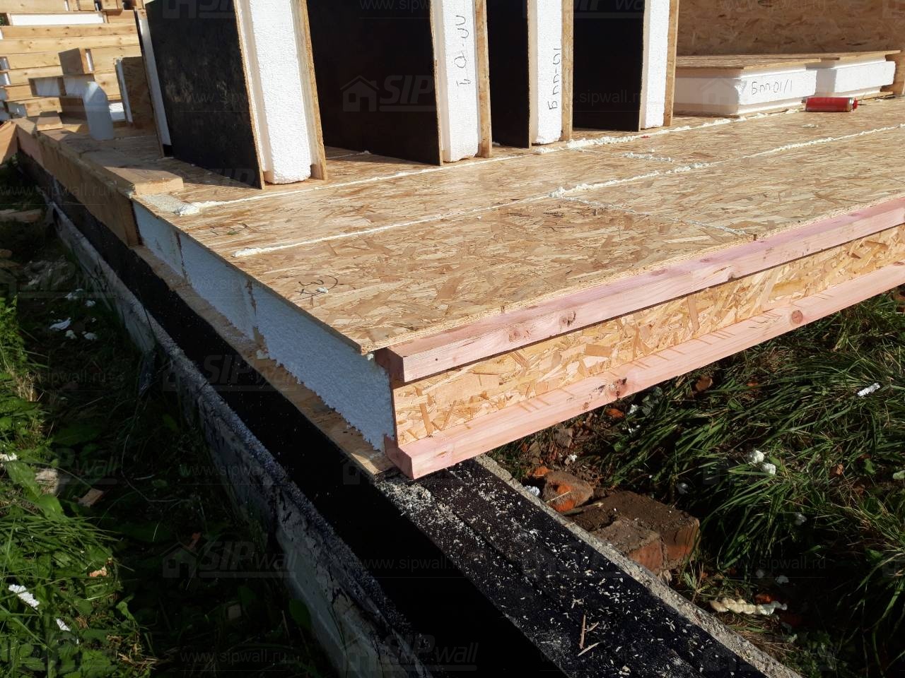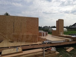 Все СИП панели SIPwall толщиной 224/174/124 мм (плиты OSB-3 толщиной 12 мм "Калевала" Россия и фасадный пенополистирол ПСБ-С 25 по ГОСТ 15588-14 толщиной 200/150/100 мм производства завода "PolarPlast", Россия) нарезаны и обрусованы сухим строганным брусом камерной сушки в соответствии с проектной документацией.