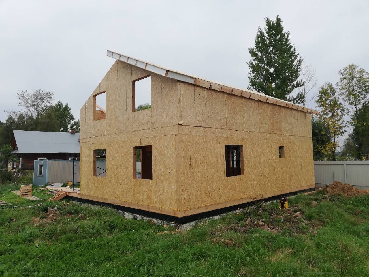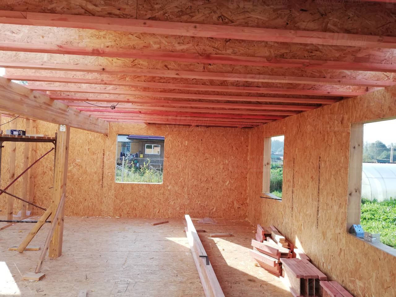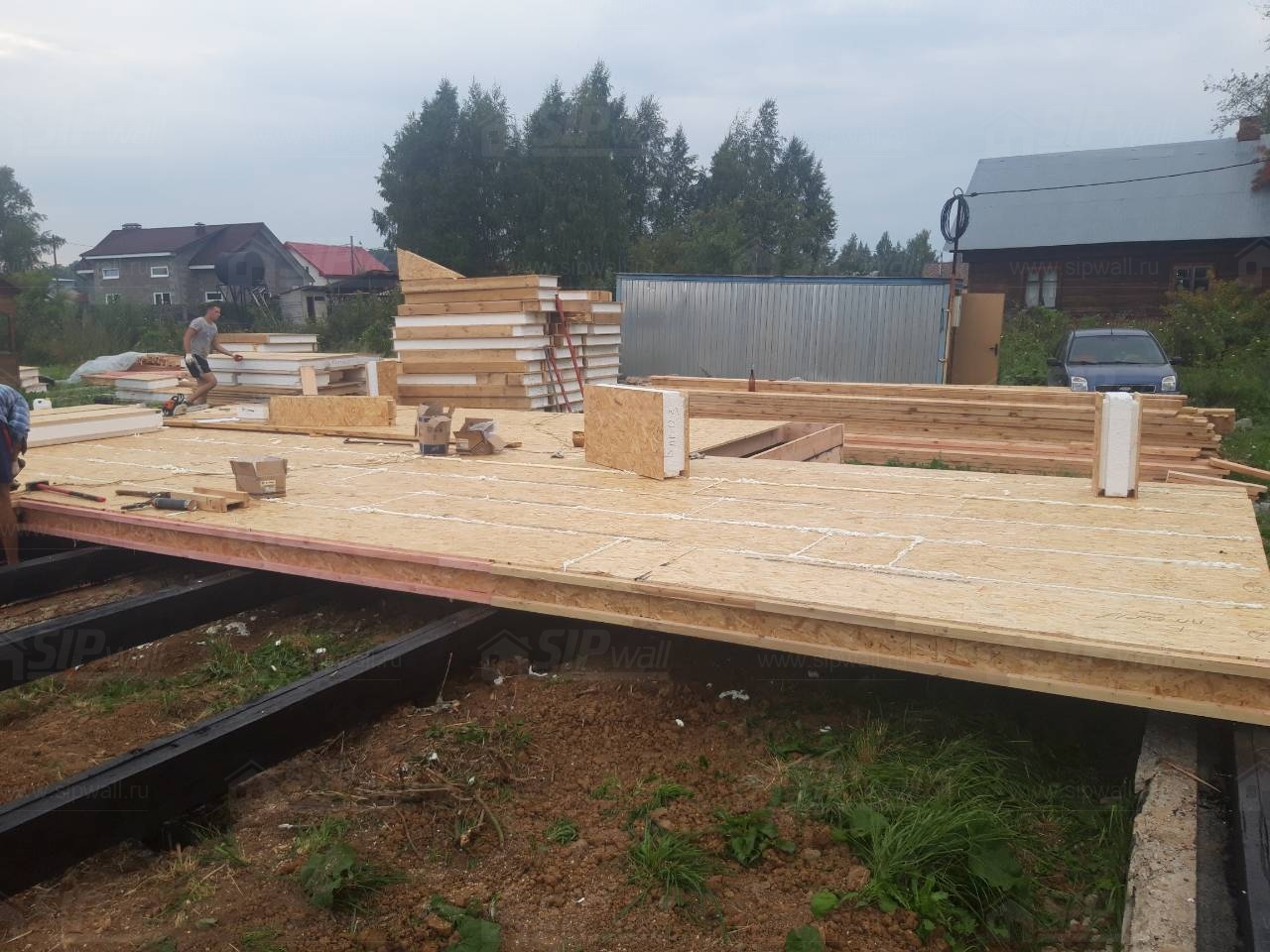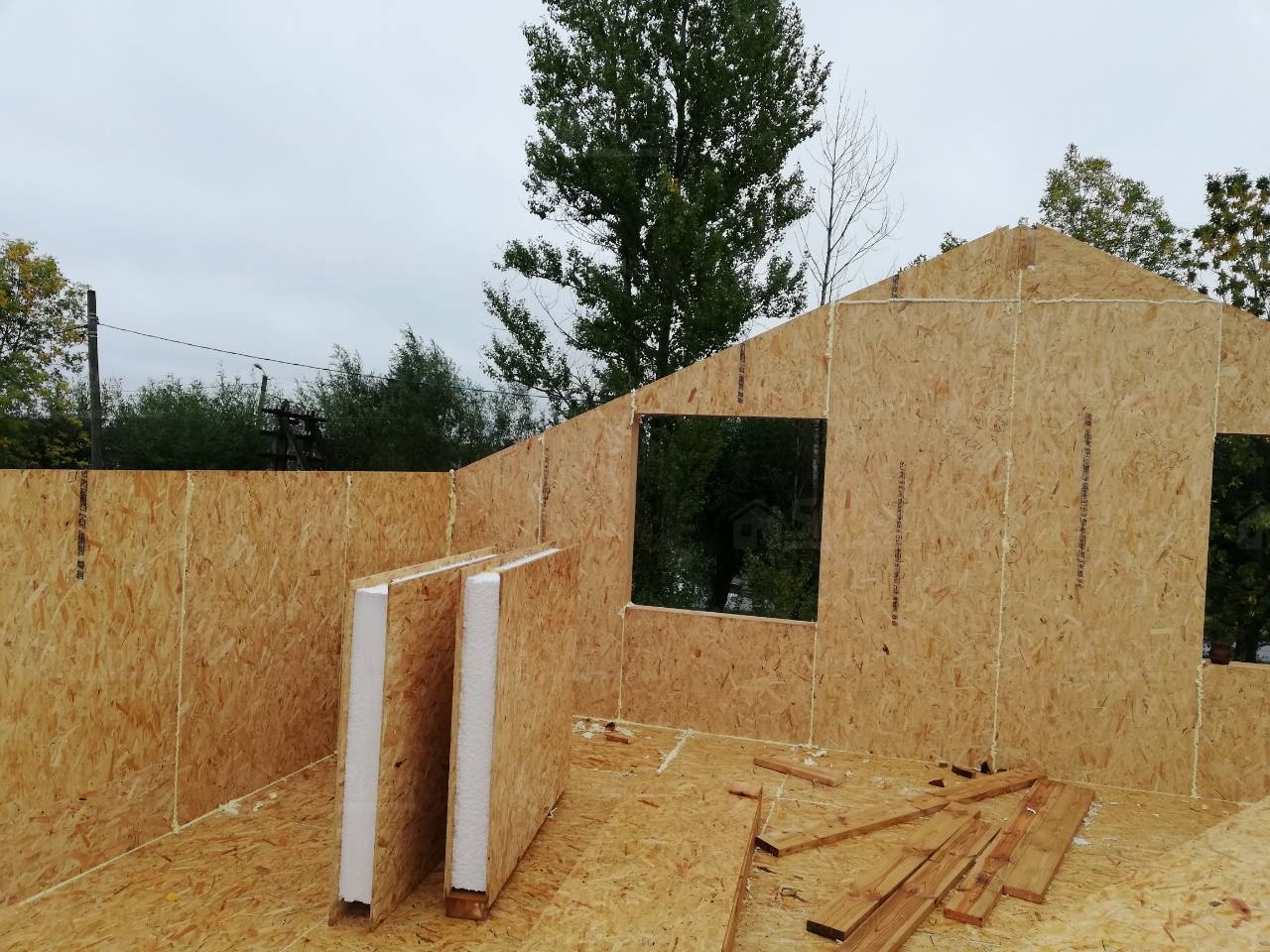 Все СИП панели SIPwall толщиной 224/174/124 мм (плиты OSB-3 толщиной 12 мм "Калевала" Россия и фасадный пенополистирол ПСБ-С 25 по ГОСТ 15588-14 толщиной 200/150/100 мм производства завода "PolarPlast", Россия) нарезаны и обрусованы сухим строганным брусом камерной сушки в соответствии с проектной документацией.