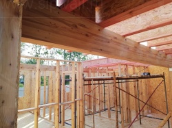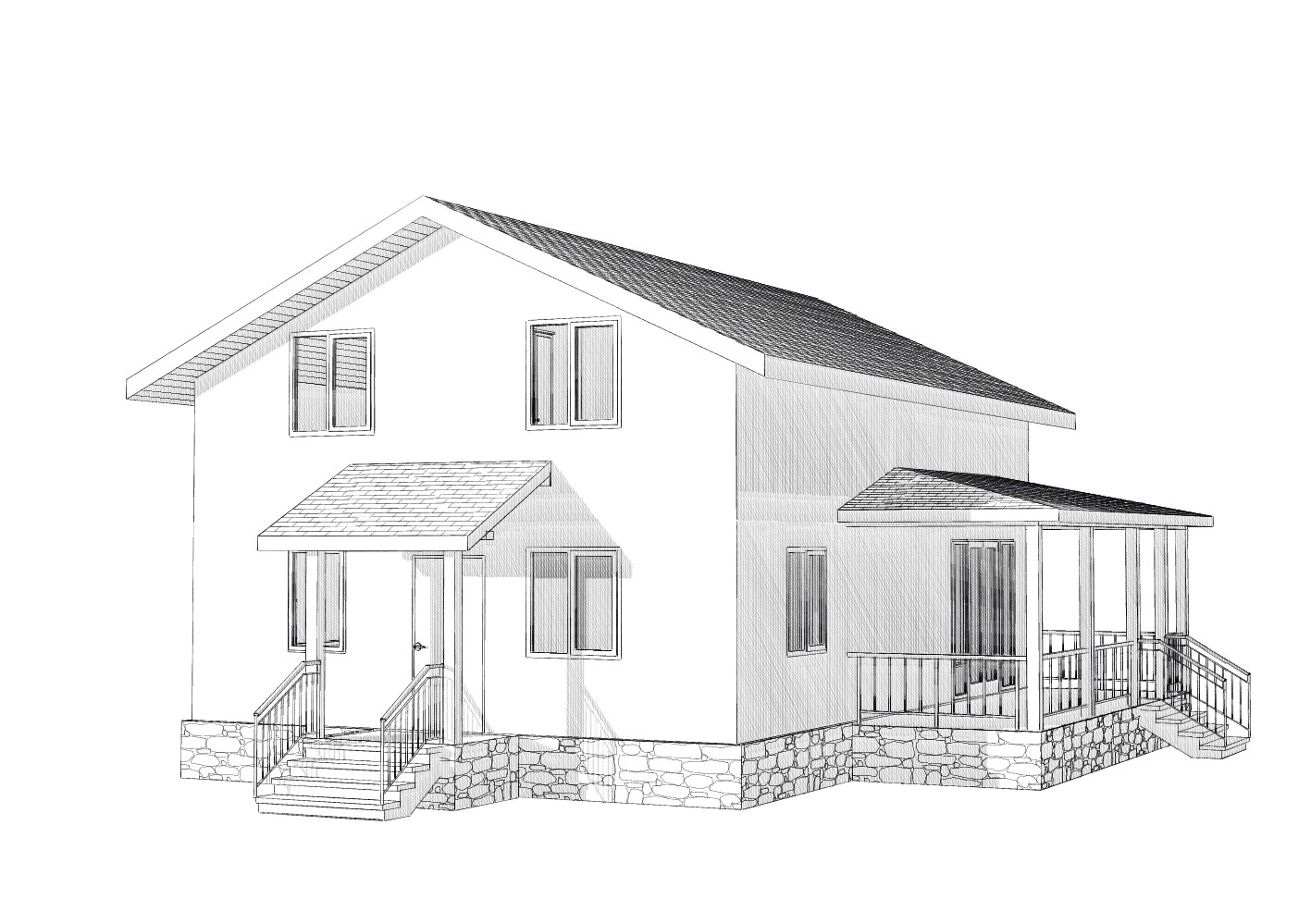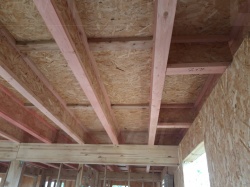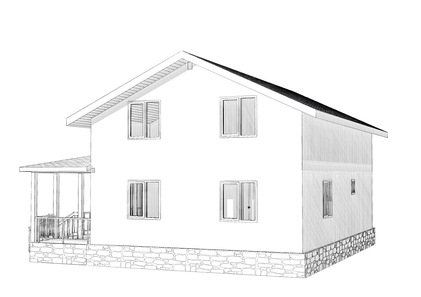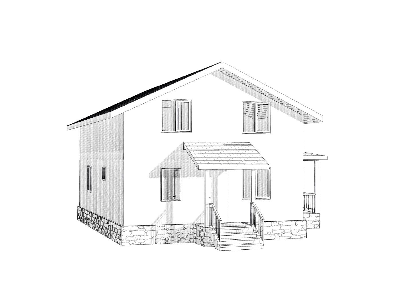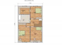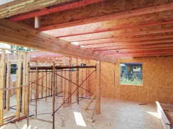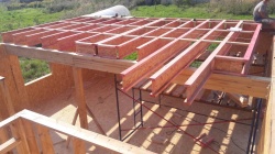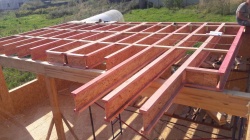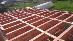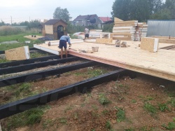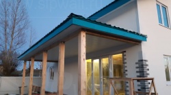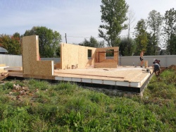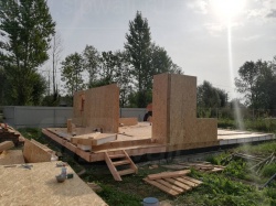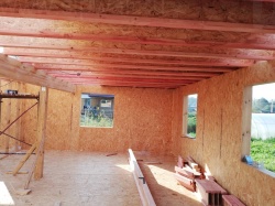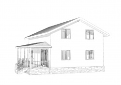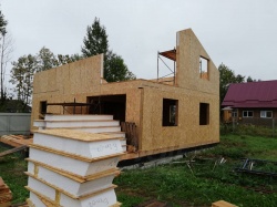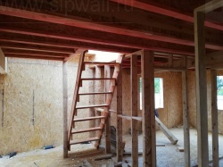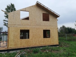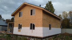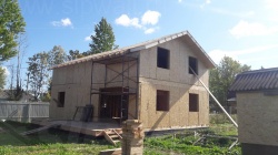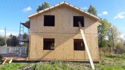 Комплектация домокомплекта: перекрытие на отметке +0.000 - СИП - 224У мм., несущие стены дома выполнены из СИП панелей 174 мм., внутренние несущие стены и внутренние не несущие перегородки выполнены по каркасной технологии. Перекрытие межэтажное - выполнено из деревянных двутавровых балок. Кровля - выполнена из СИП панелей 224У мм.