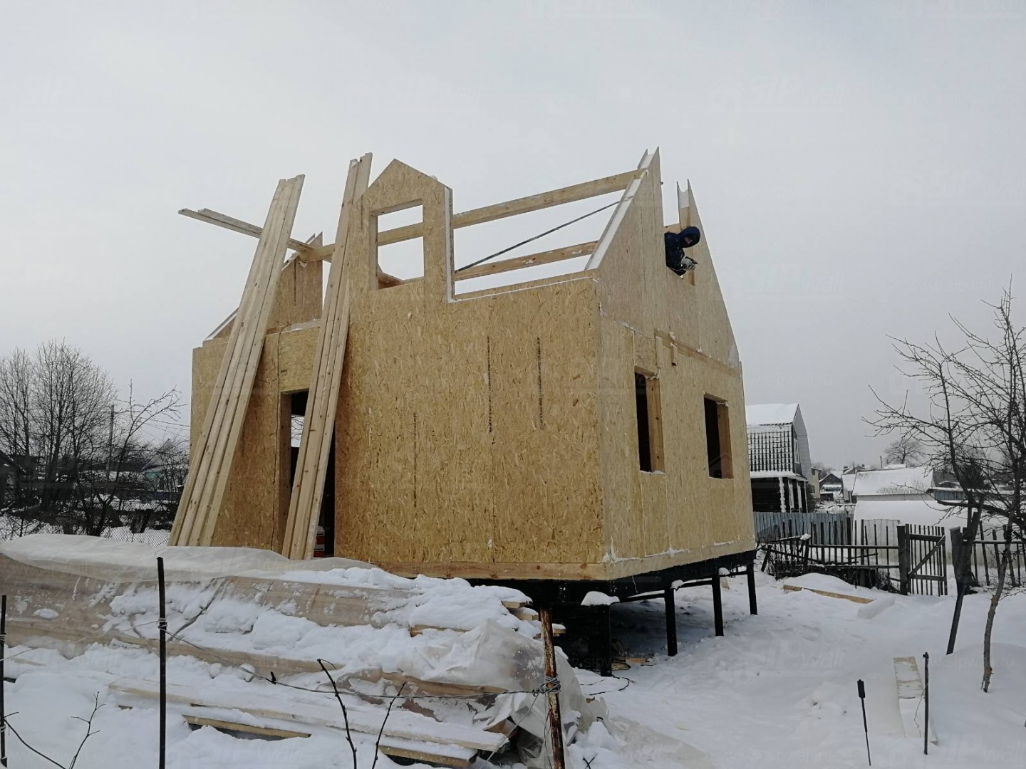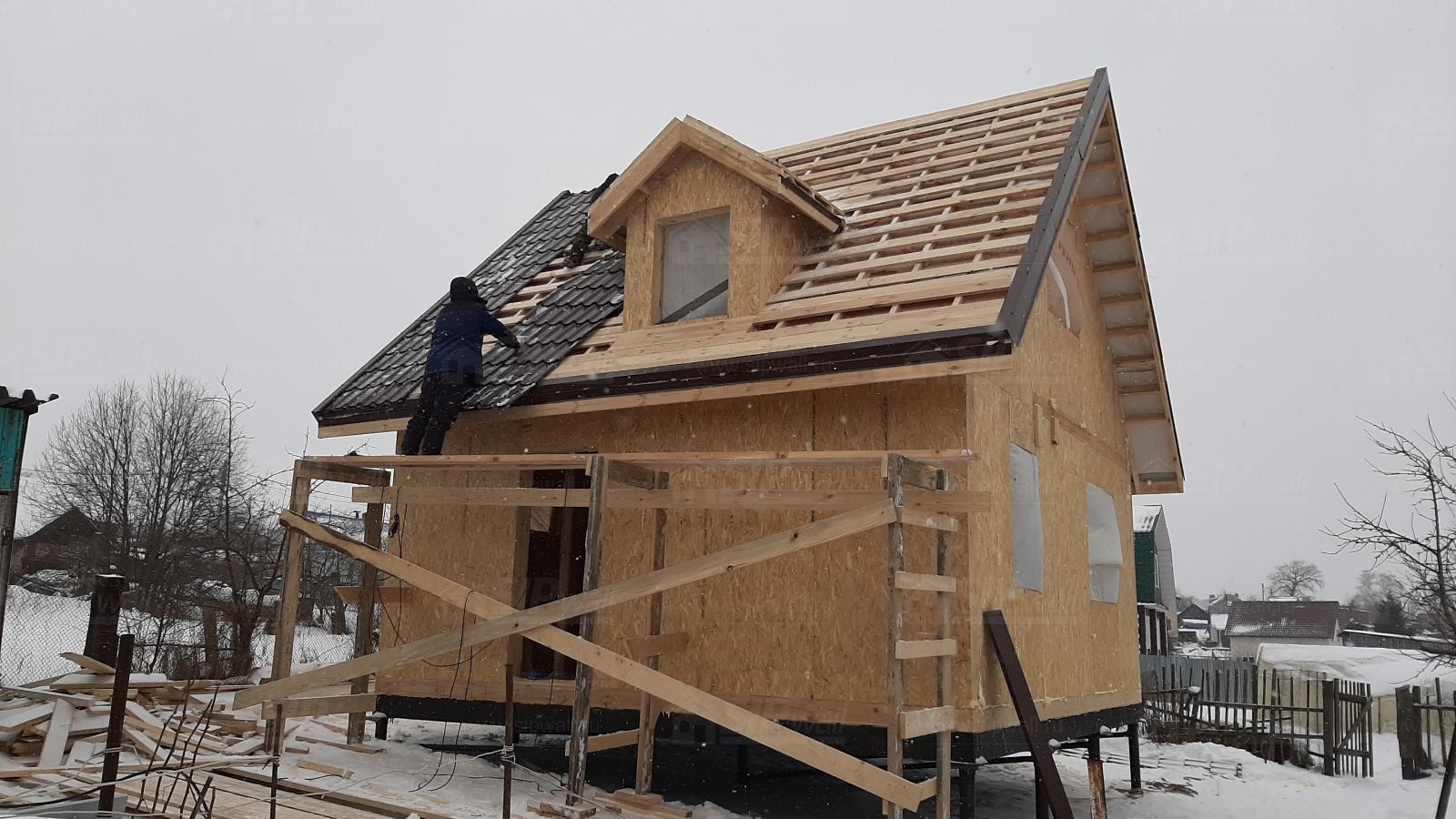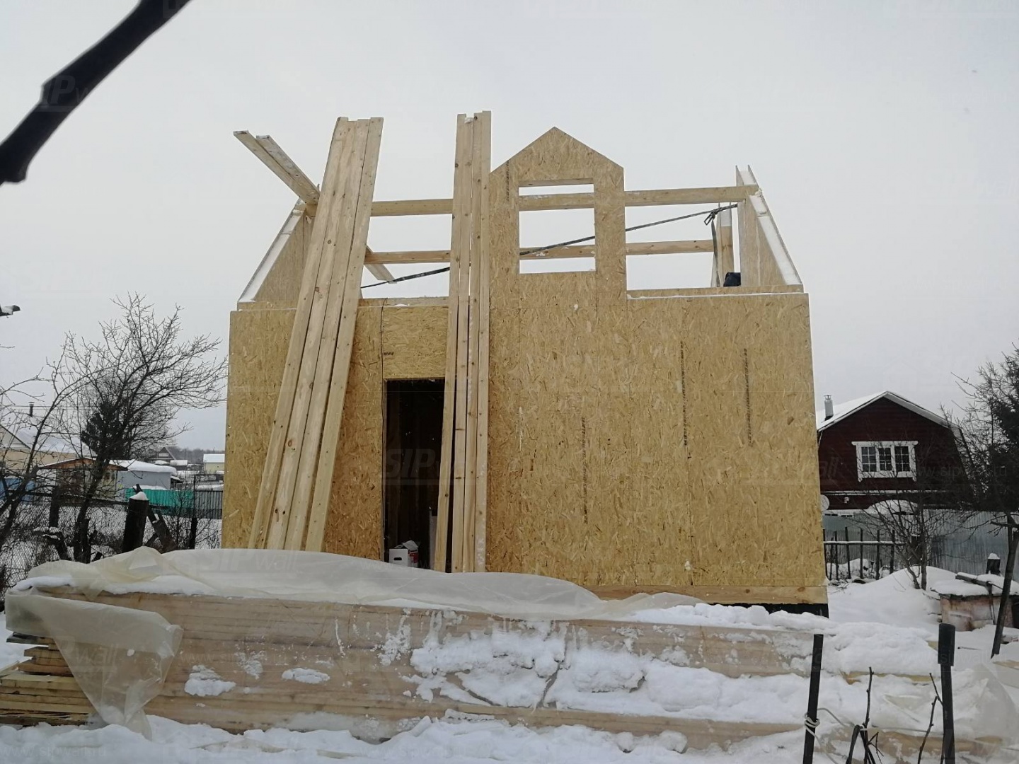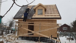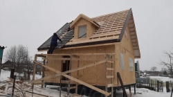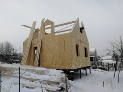 Комплектация домокомплекта: перекрытие на отметке +0.000 - СИП - 174У мм., несущие стены дома выполнены из СИП панелей 174 мм, внутренние несущие и не несущие стены выполнены по каркасной технологии. Кровля - стропильная сиситема.