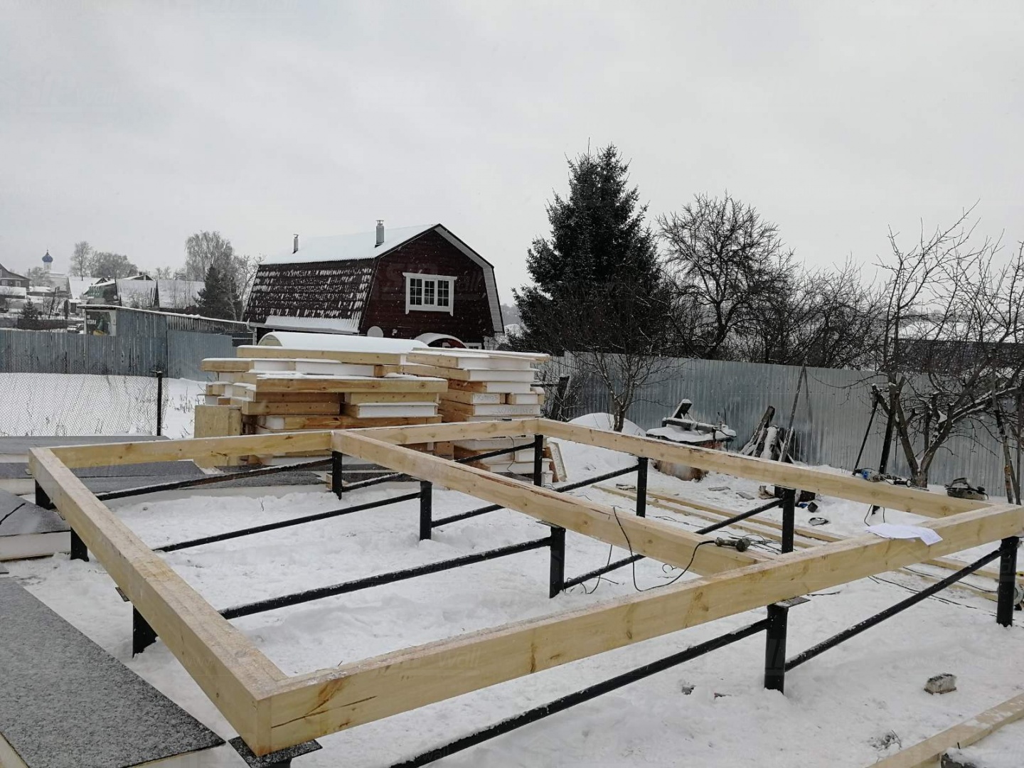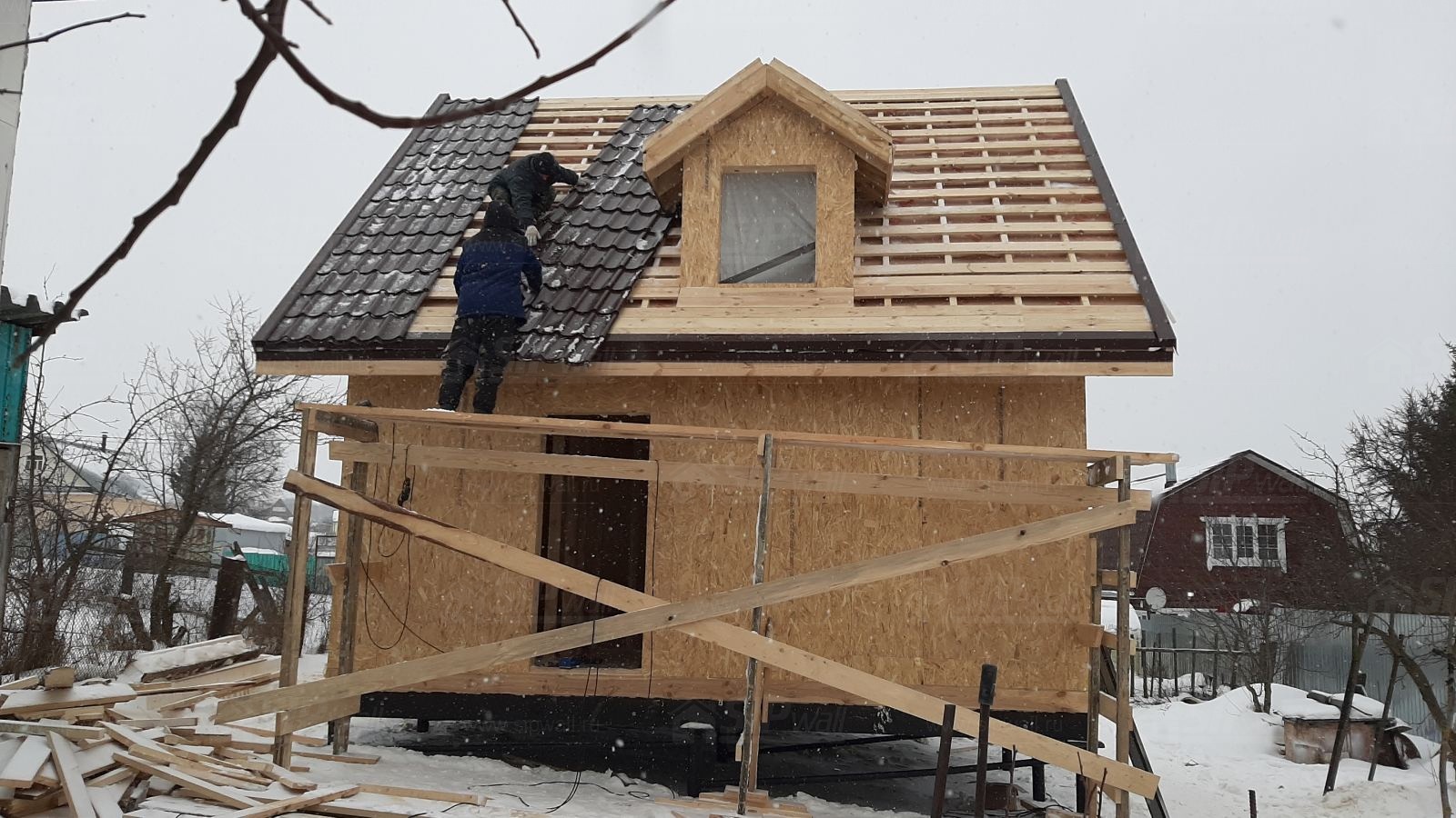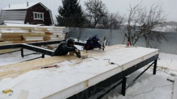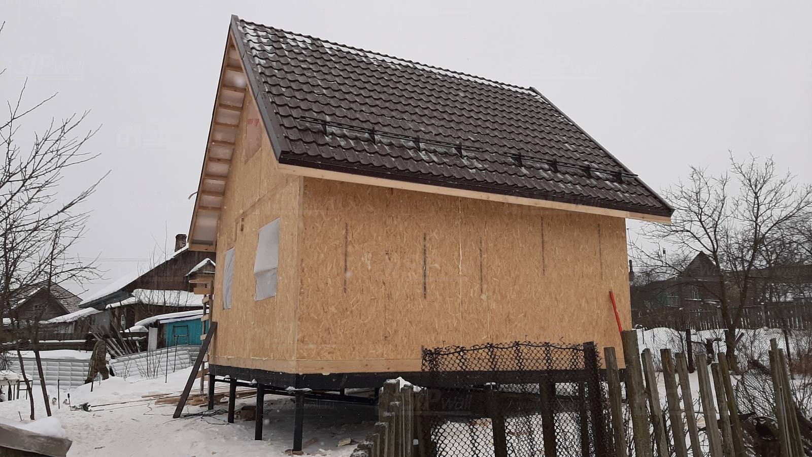 Комплектация домокомплекта: перекрытие на отметке +0.000 - СИП - 174У мм., несущие стены дома выполнены из СИП панелей 174 мм, внутренние несущие и не несущие стены выполнены по каркасной технологии. Кровля - стропильная сиситема.