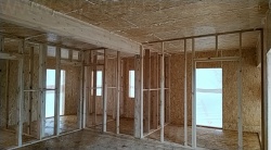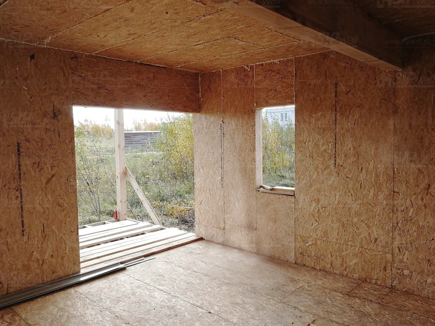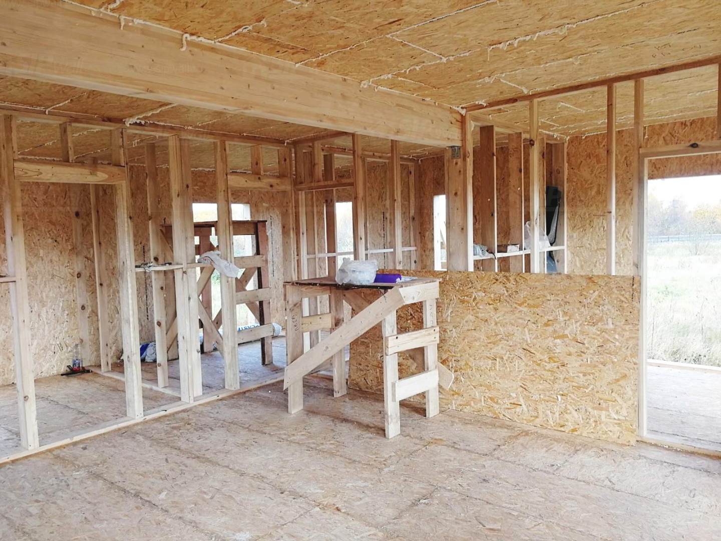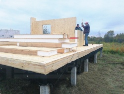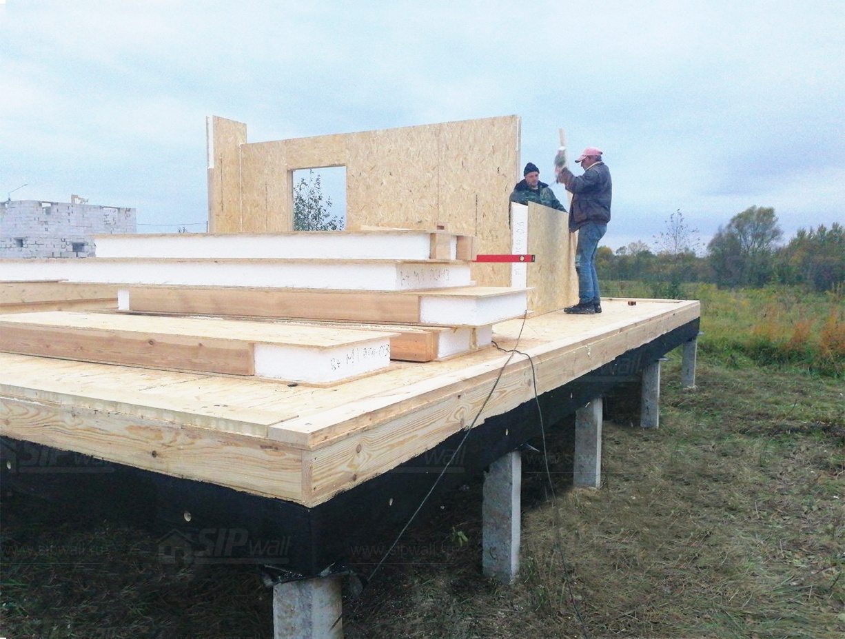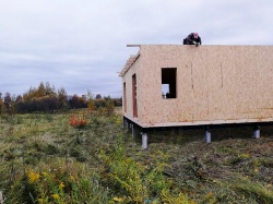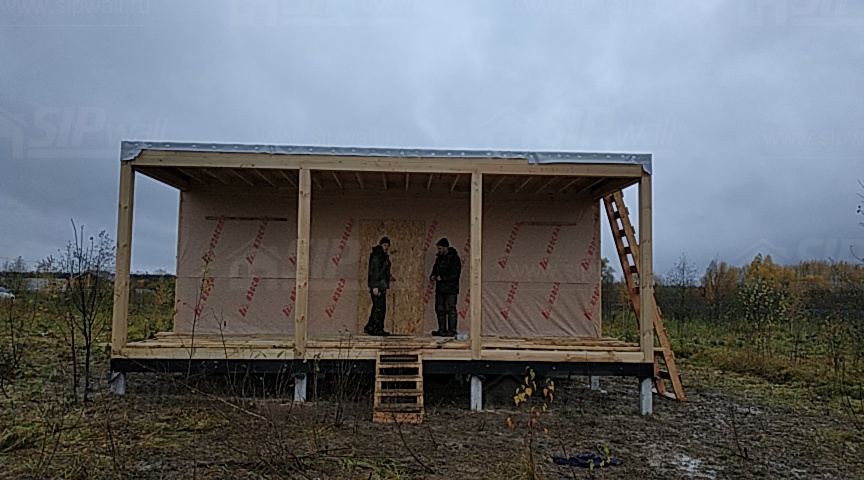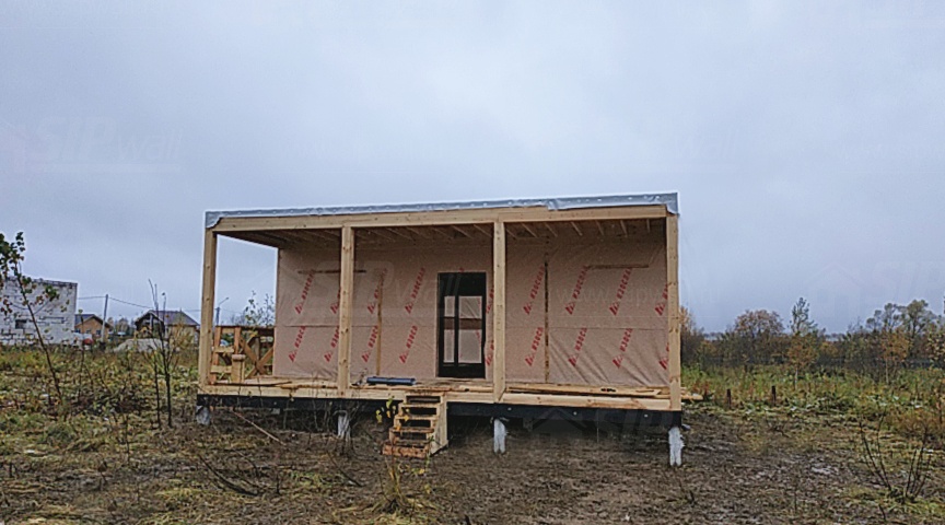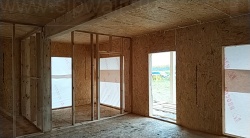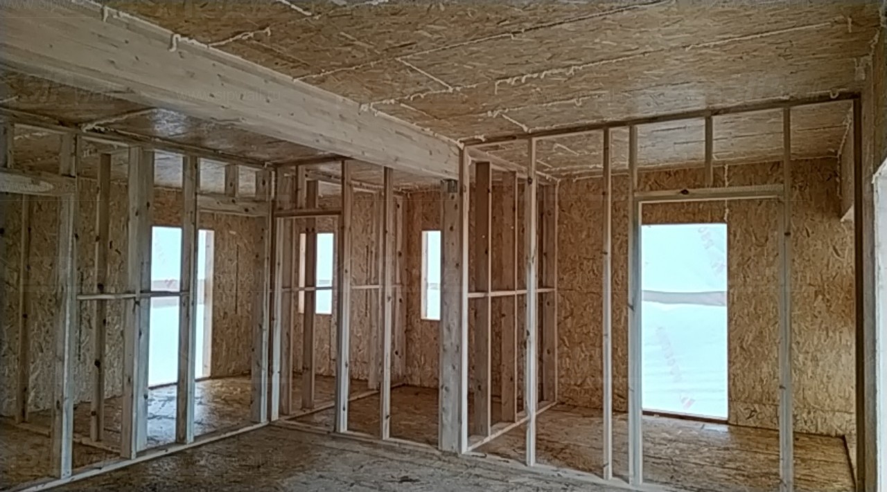 Комплектация домокомплекта: перекрытие на отметке +0.000 - СИП - 174У мм., несущие стены дома выполнены из СИП панелей 174 мм., внутренние несущие стены и внутренние не несущие перегородки выполнены по каркасной технологии. Кровля - СИП - 174У мм.
