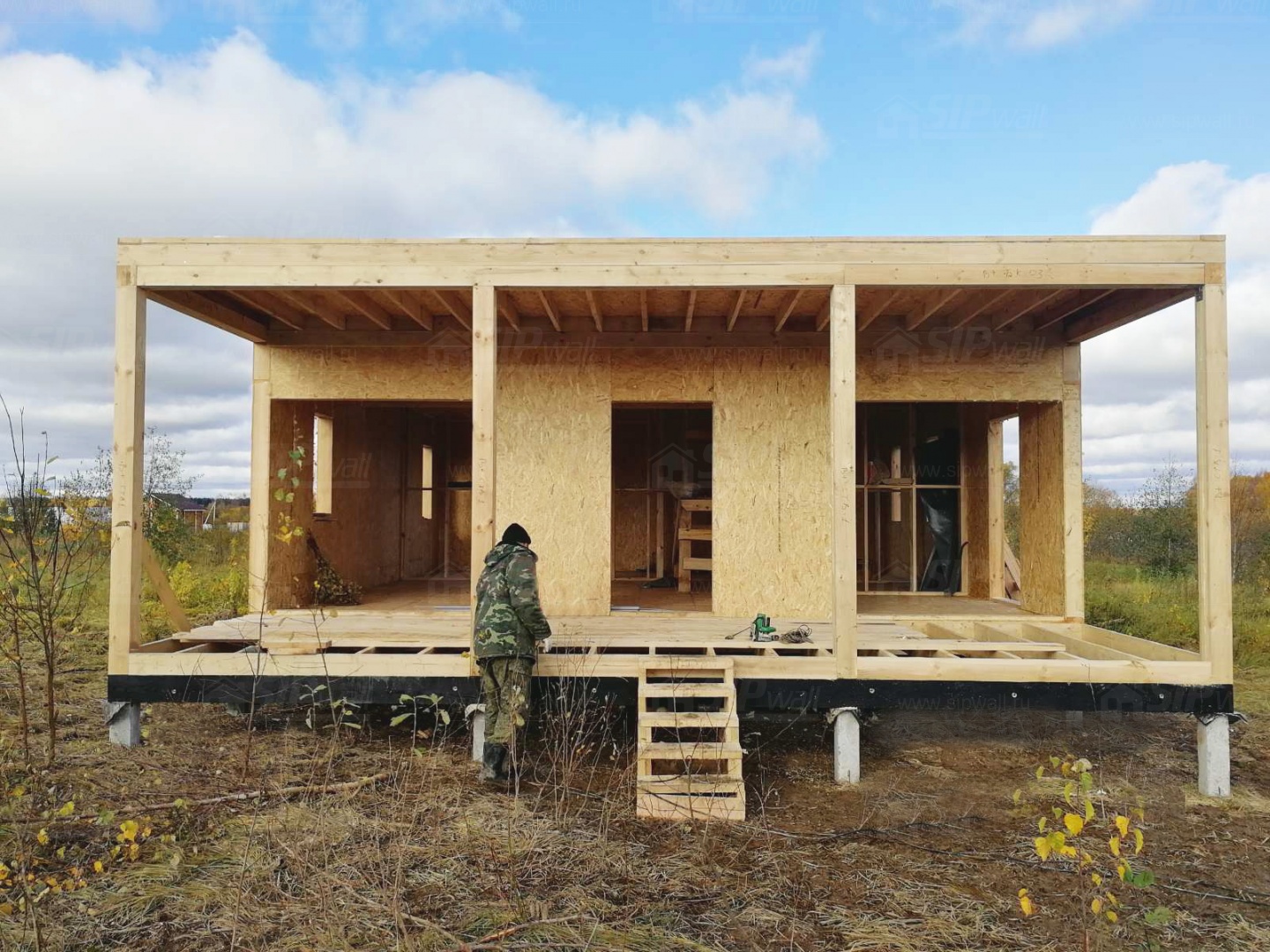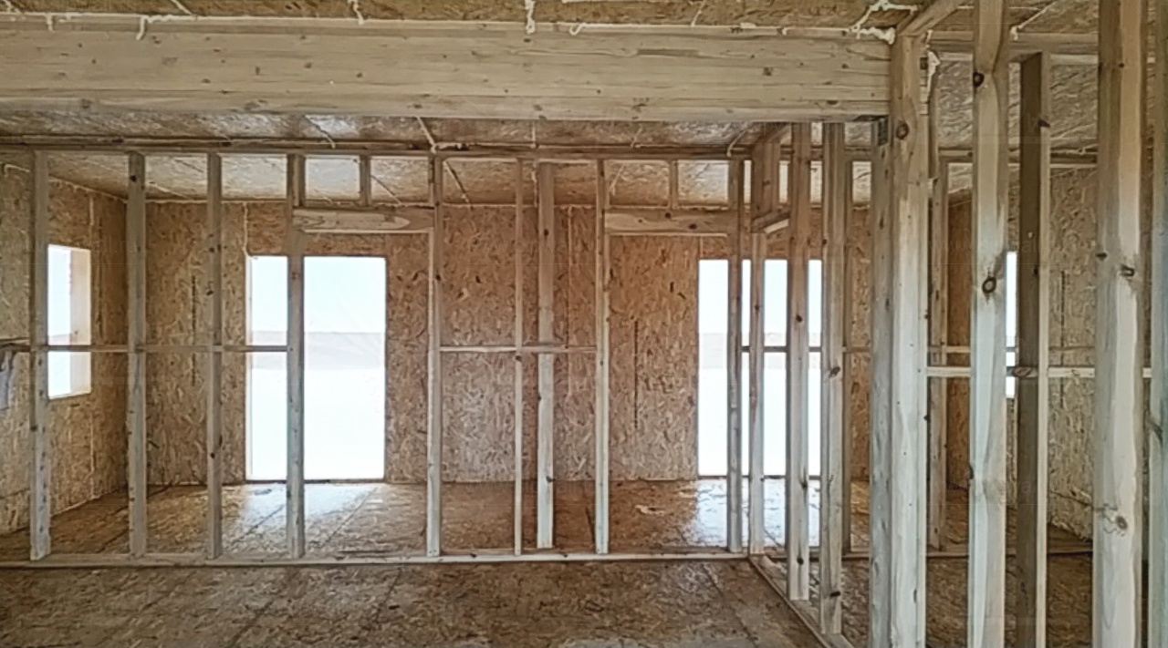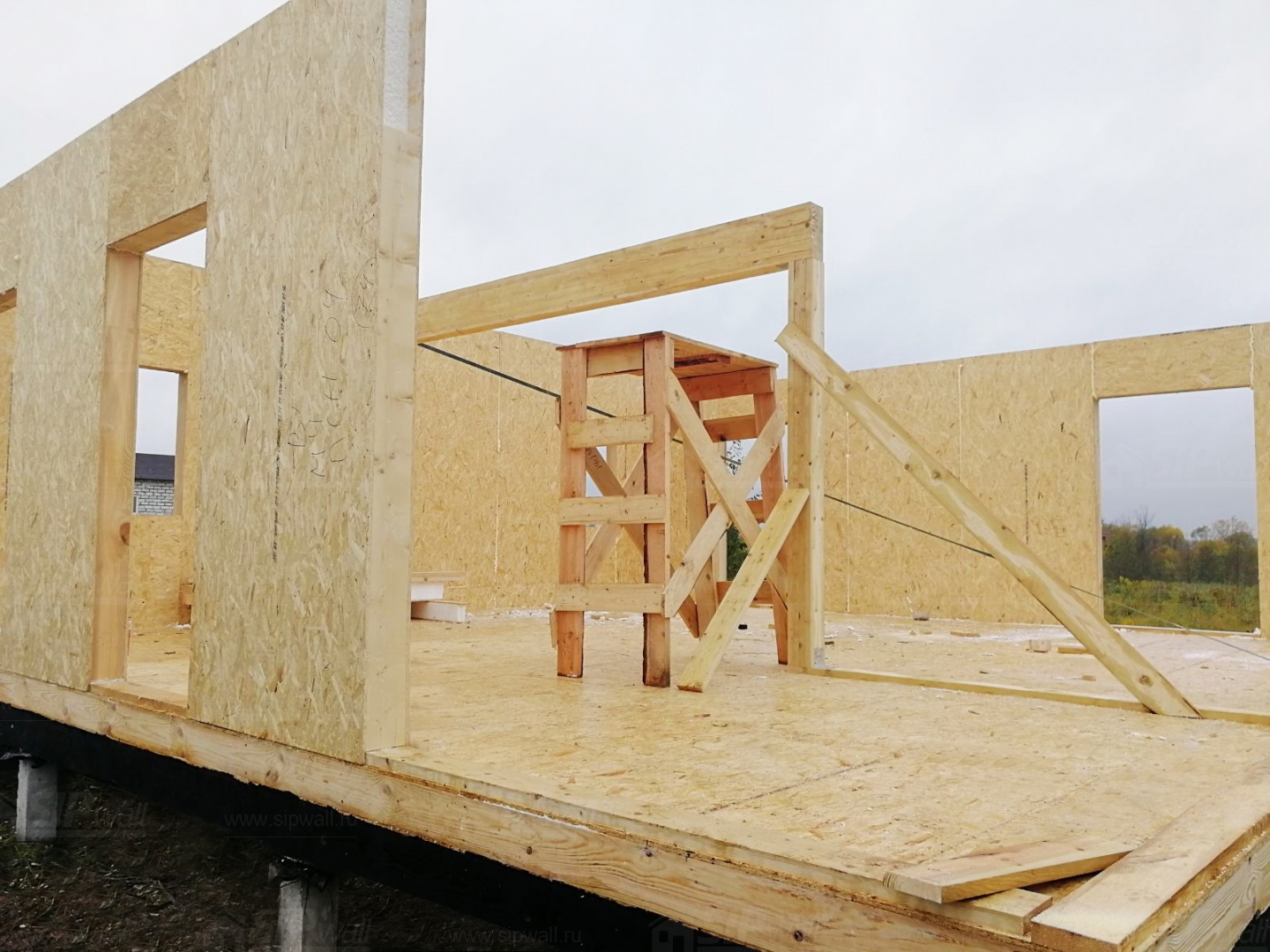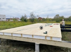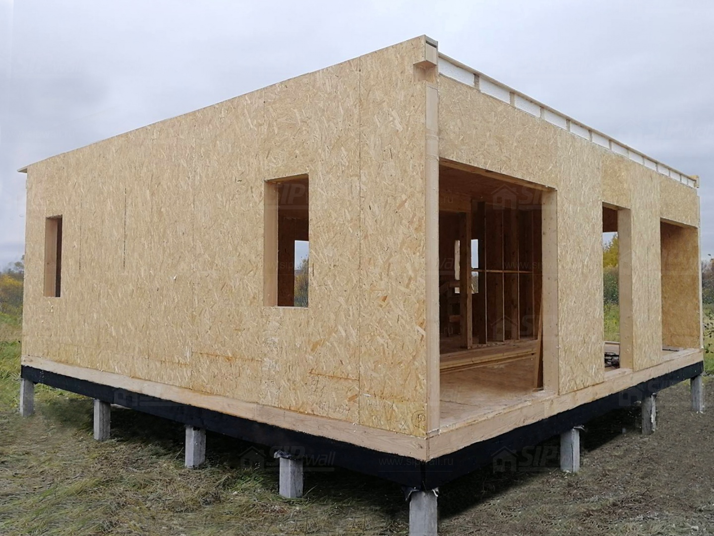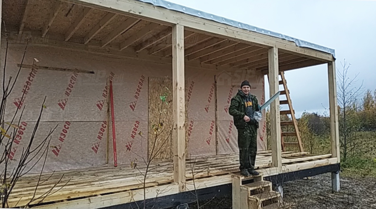 Комплектация домокомплекта: перекрытие на отметке +0.000 - СИП - 174У мм., несущие стены дома выполнены из СИП панелей 174 мм., внутренние несущие стены и внутренние не несущие перегородки выполнены по каркасной технологии. Кровля - СИП - 174У мм.