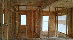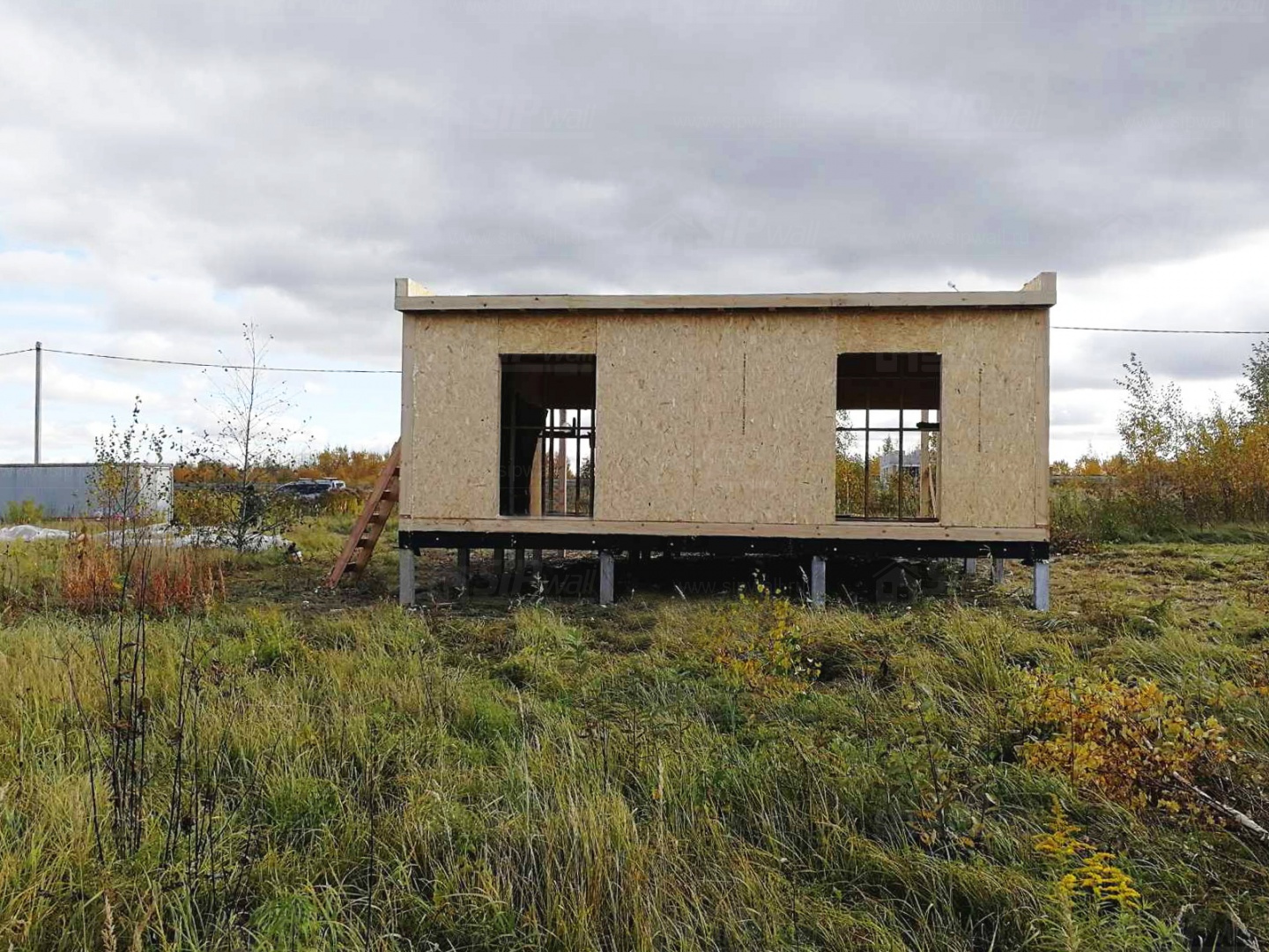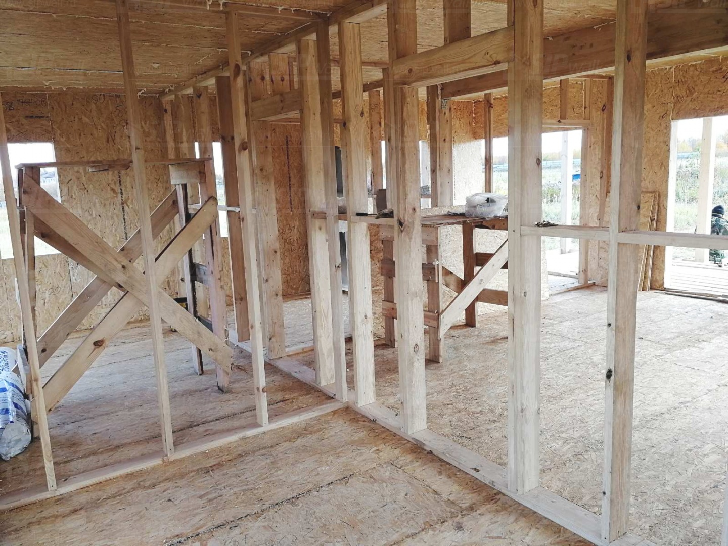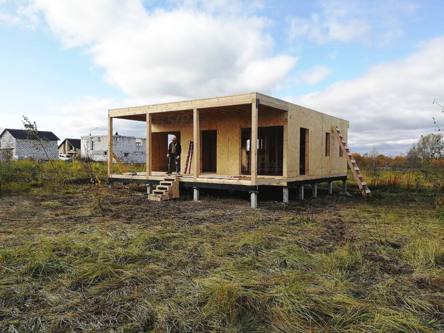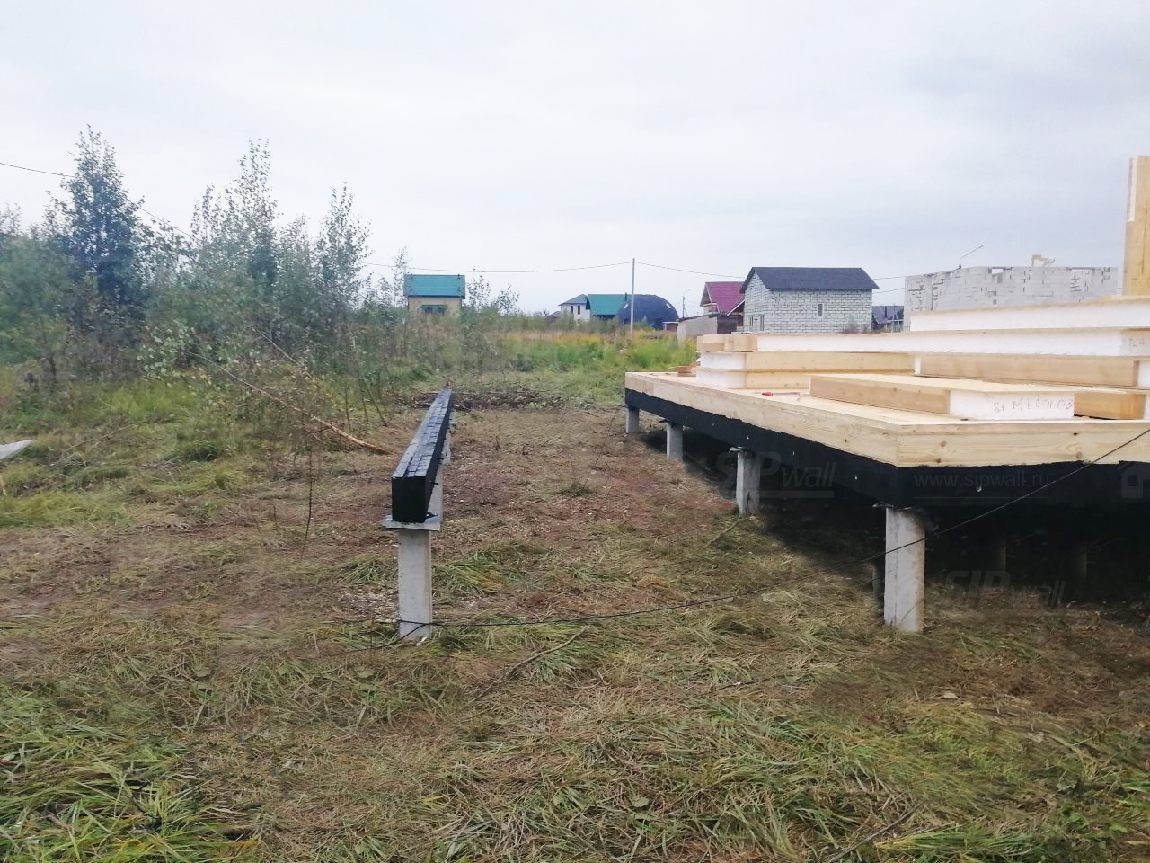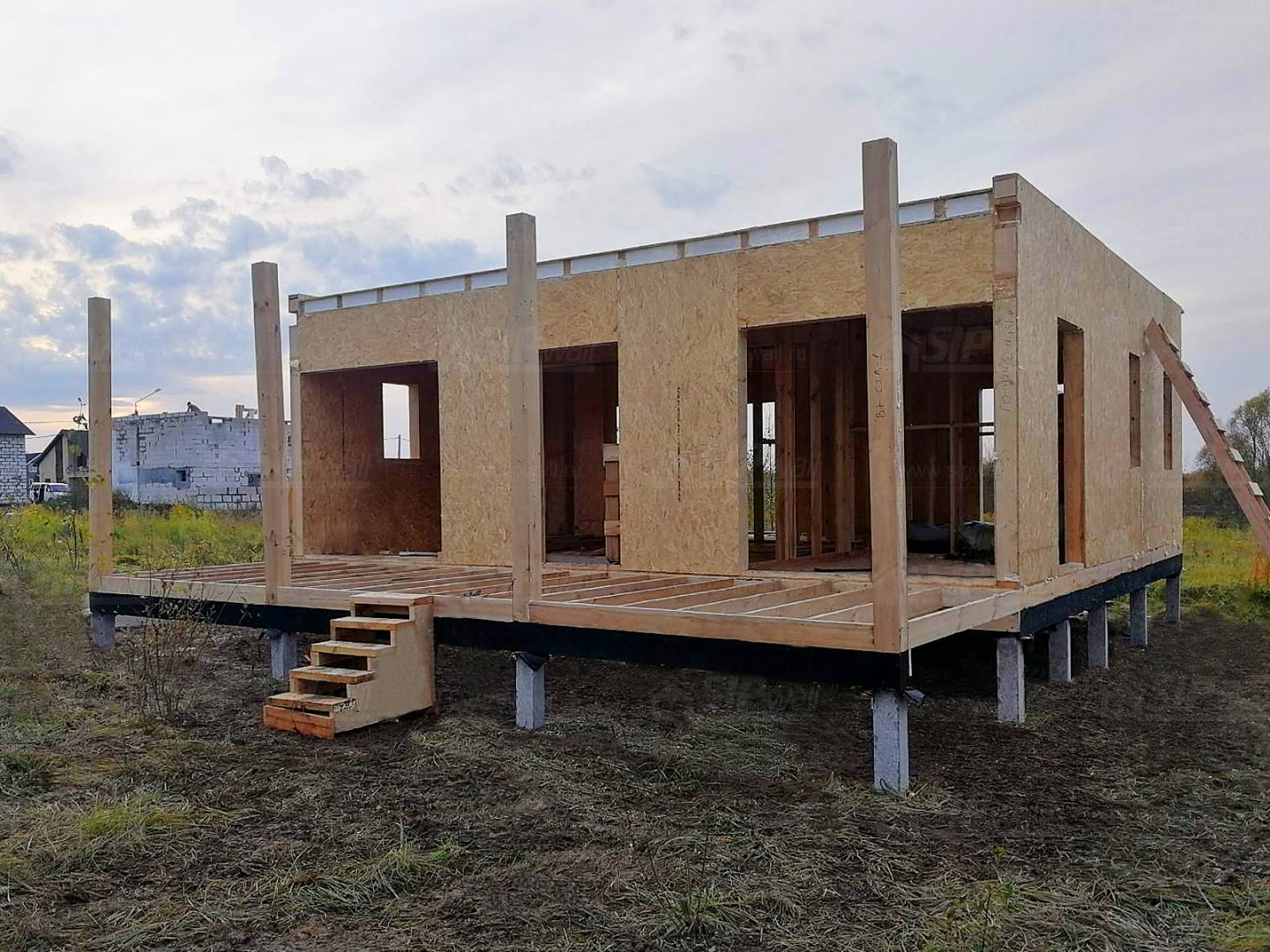 Комплектация домокомплекта: перекрытие на отметке +0.000 - СИП - 174У мм., несущие стены дома выполнены из СИП панелей 174 мм., внутренние несущие стены и внутренние не несущие перегородки выполнены по каркасной технологии. Кровля - СИП - 174У мм.