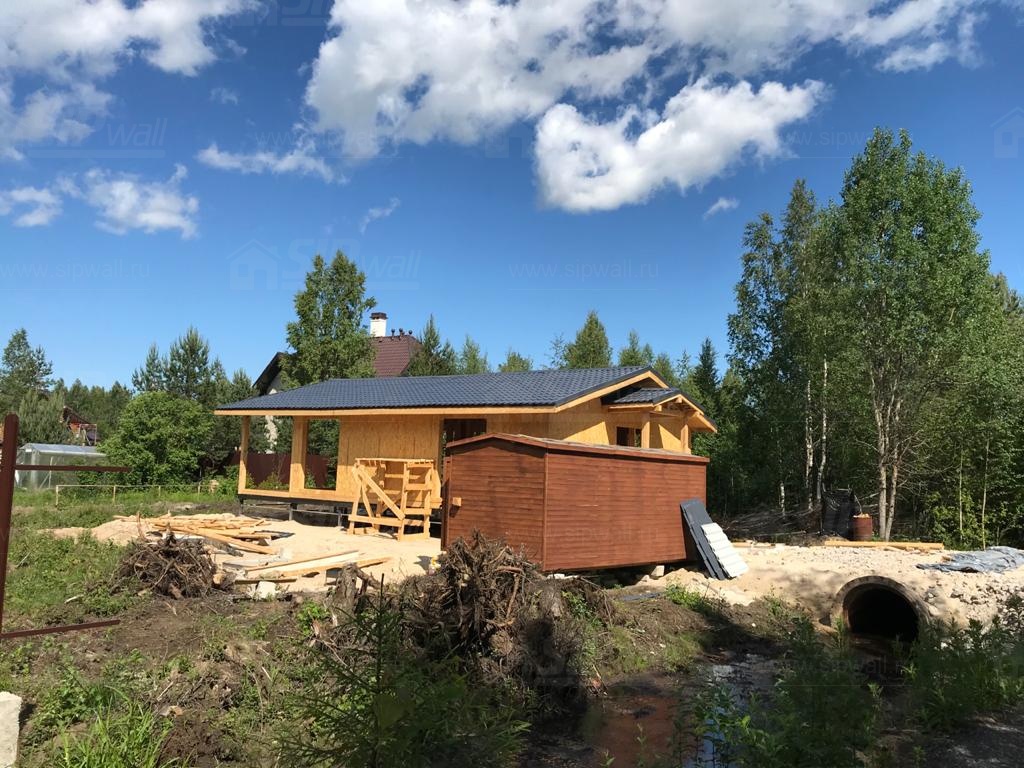 Комплектация домокомплекта: перекрытие на отметке +0.000 - СИП - 174У мм., несущие стены дома выполнены из СИП панелей 174 мм, внутренние несущие стены и не несущие стены выполнены по каркасной технологии. Кровля дома выполнена из СИП панелей 174 мм.