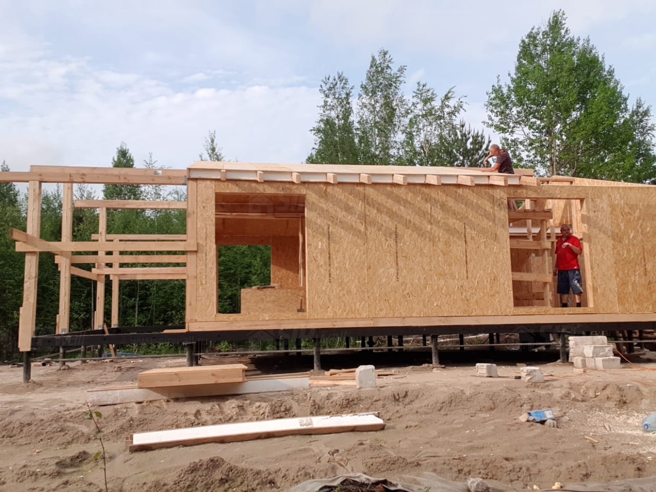 Все СИП панели SIPwall толщиной 224/174/124 мм (плиты OSB-3 толщиной 12 мм "Калевала" Россия и фасадный пенополистирол ППС-14 толщиной 200/150/100 мм производства, Россия) нарезаны и обрусованы сухим строганным брусом камерной сушки в соответствии с проектной документацией.