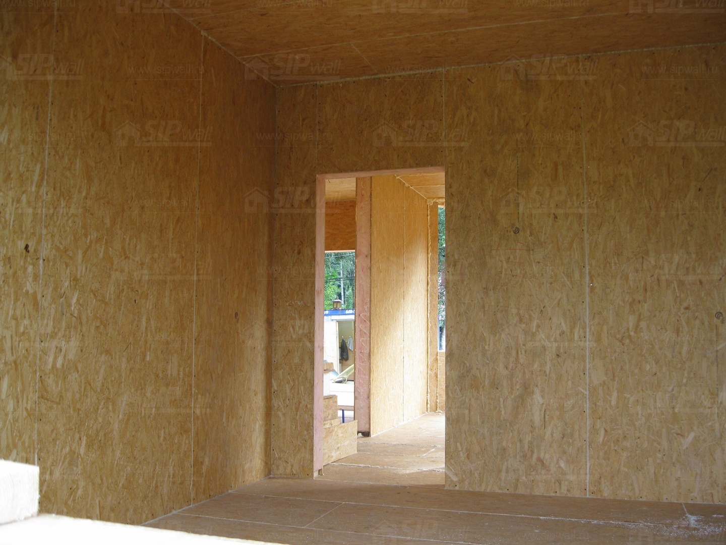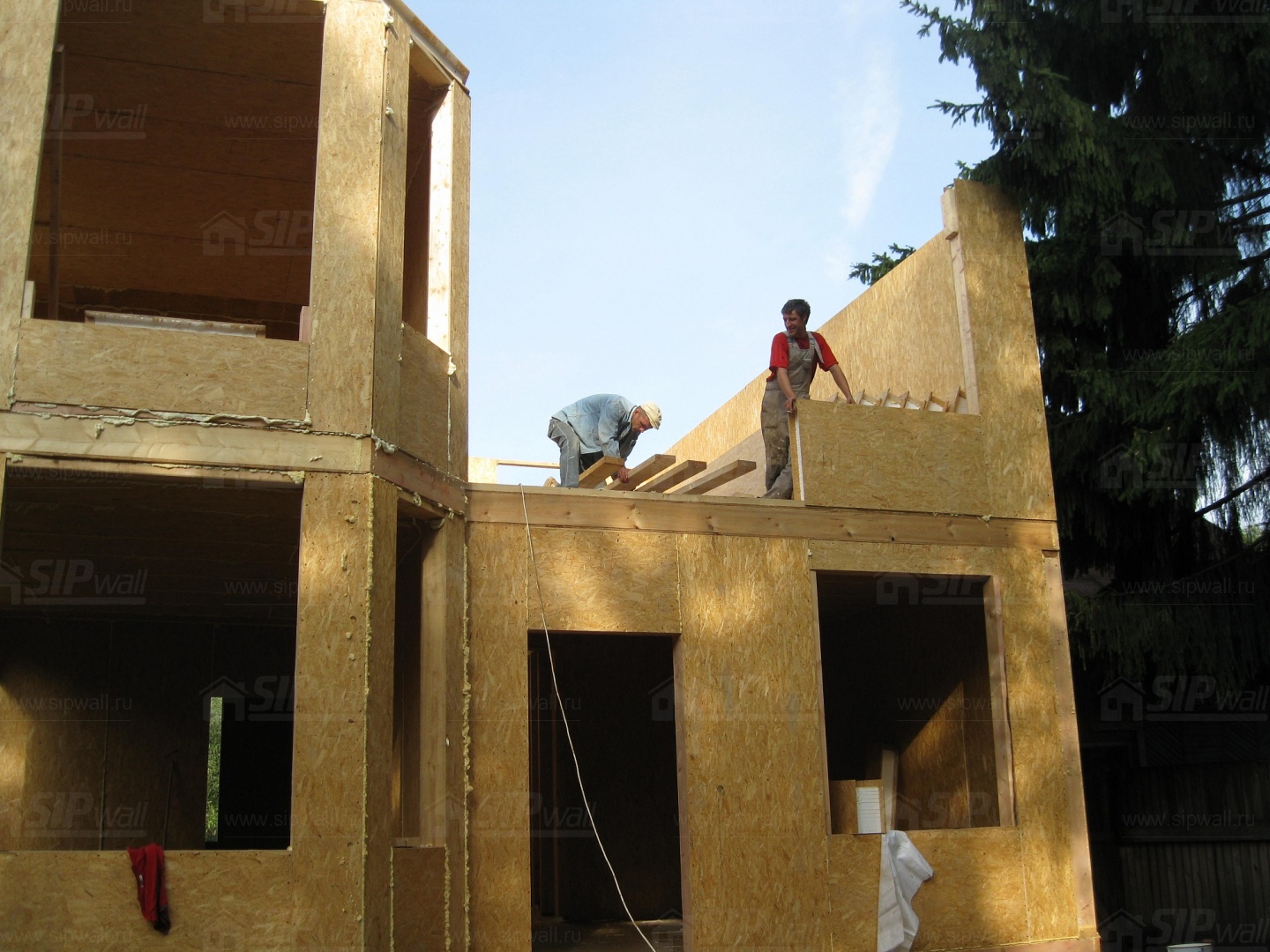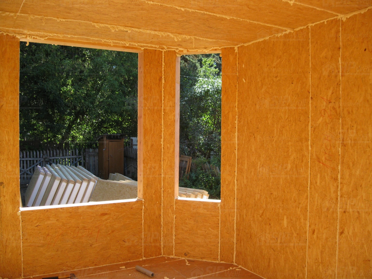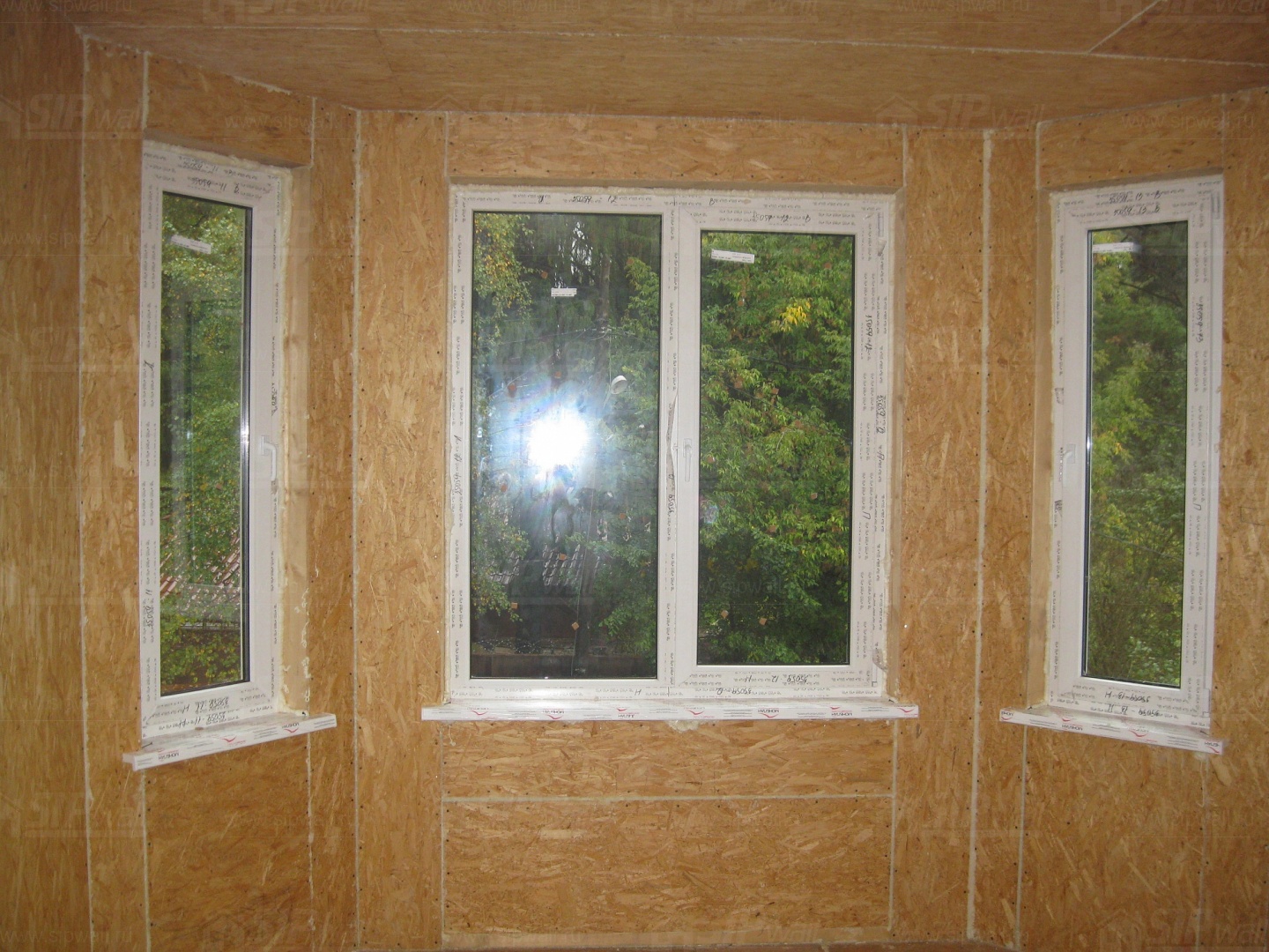 Все СИП панели SIPwall толщиной 224/174/124 мм (плиты OSB-3 толщиной 12 мм "Калевала" Россия и фасадный пенополистирол ПСБ-С 25 по ГОСТ 15588-14 толщиной 200/150/100 мм производства завода "PolarPlast", Россия) нарезаны и обрусованы сухим строганным брусом в соответствии с проектной документацией.