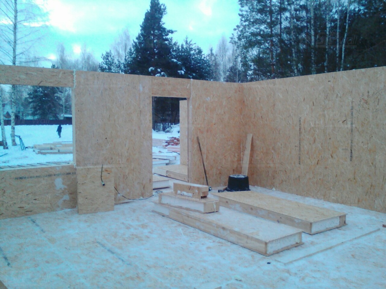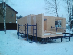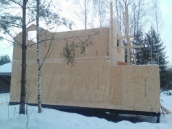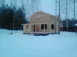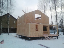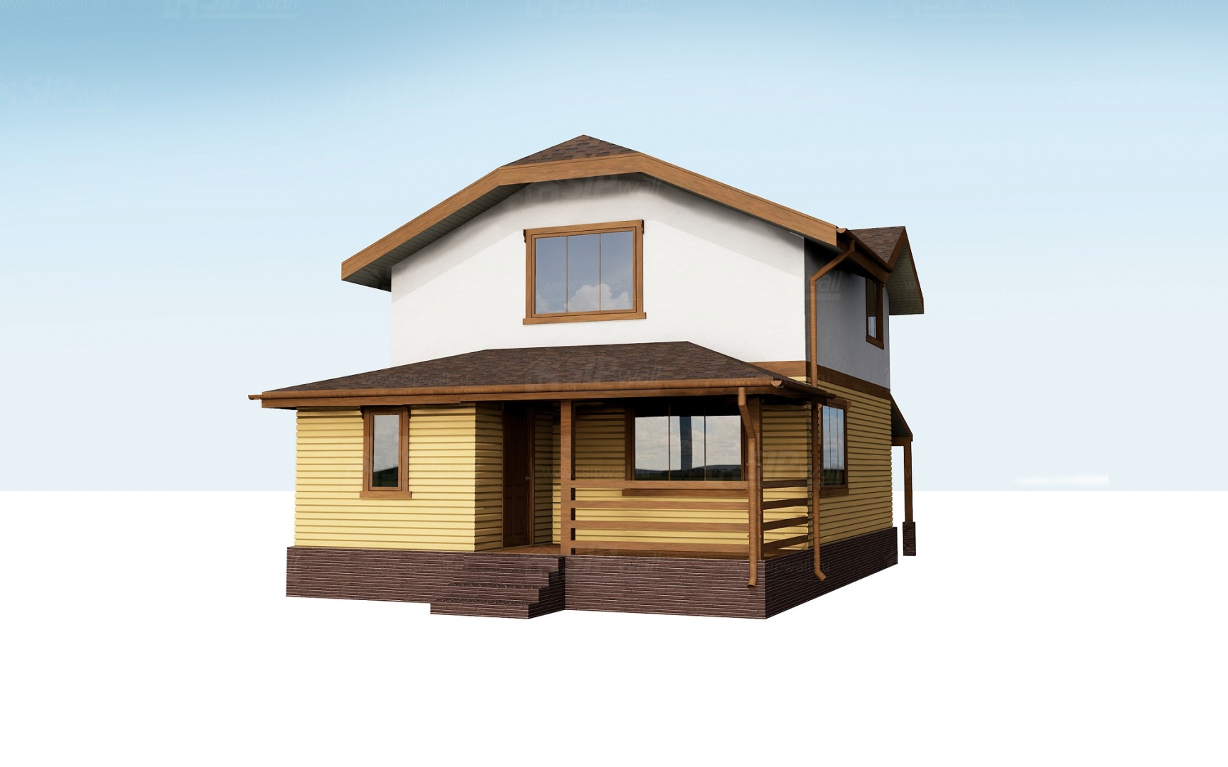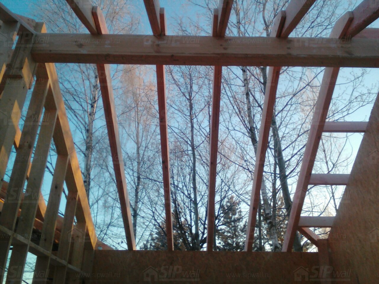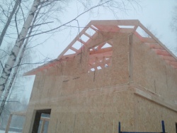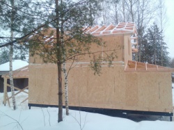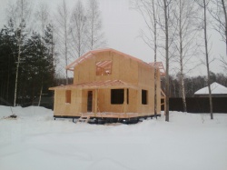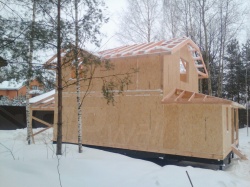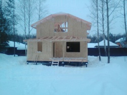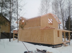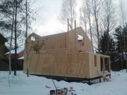 Комплектация домокомплекта: перекрытие на отметке +0.000 - СИП - 224У мм., несущие стены дома выполнены из СИП панелей 174 мм., внутренние несущие стены выполнены по каркасной технологии. Межэтажное перекрытие: деревянные двутавровые балки ДКД-241F с настилом OSB-3 толщиной 22 мм. Кровля - выполнена из СИП панелей 174У мм.
