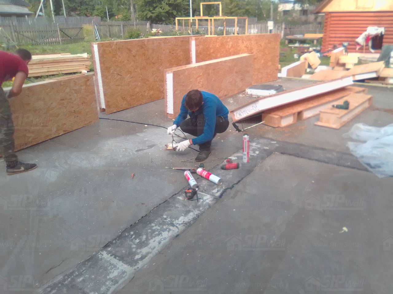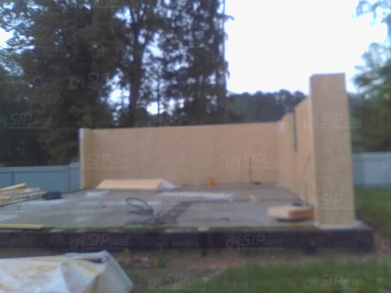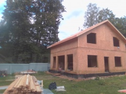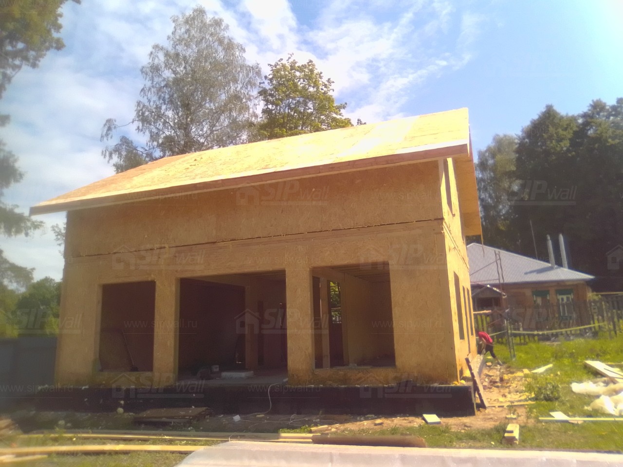 Комплектация домокомплекта: несущие стены дома выполнены из СИП панелей 174 мм., внутренние несущие стены и внутренние не несущие перегородки выполнены по каркасной технологии. Перекрытие - деревянные двутавровые балки SIPwall, серии F с настилом ОСБ 22 мм. Кровля - СИП - 224У мм.