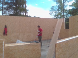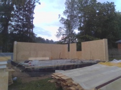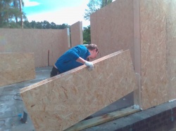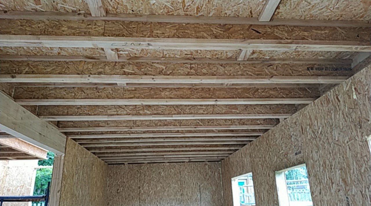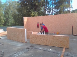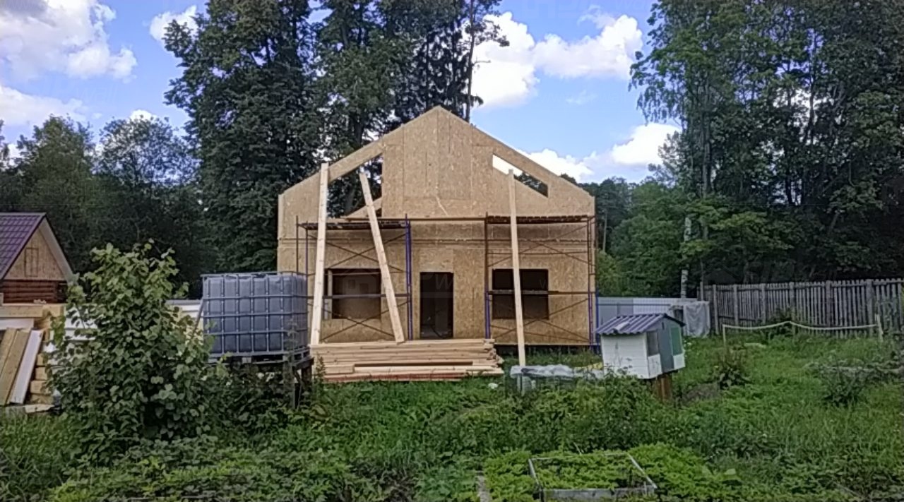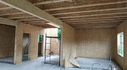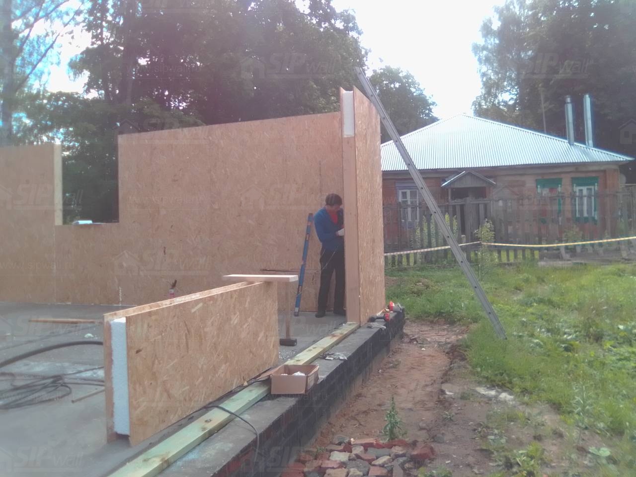 Комплектация домокомплекта: несущие стены дома выполнены из СИП панелей 174 мм., внутренние несущие стены и внутренние не несущие перегородки выполнены по каркасной технологии. Перекрытие - деревянные двутавровые балки SIPwall, серии F с настилом ОСБ 22 мм. Кровля - СИП - 224У мм.