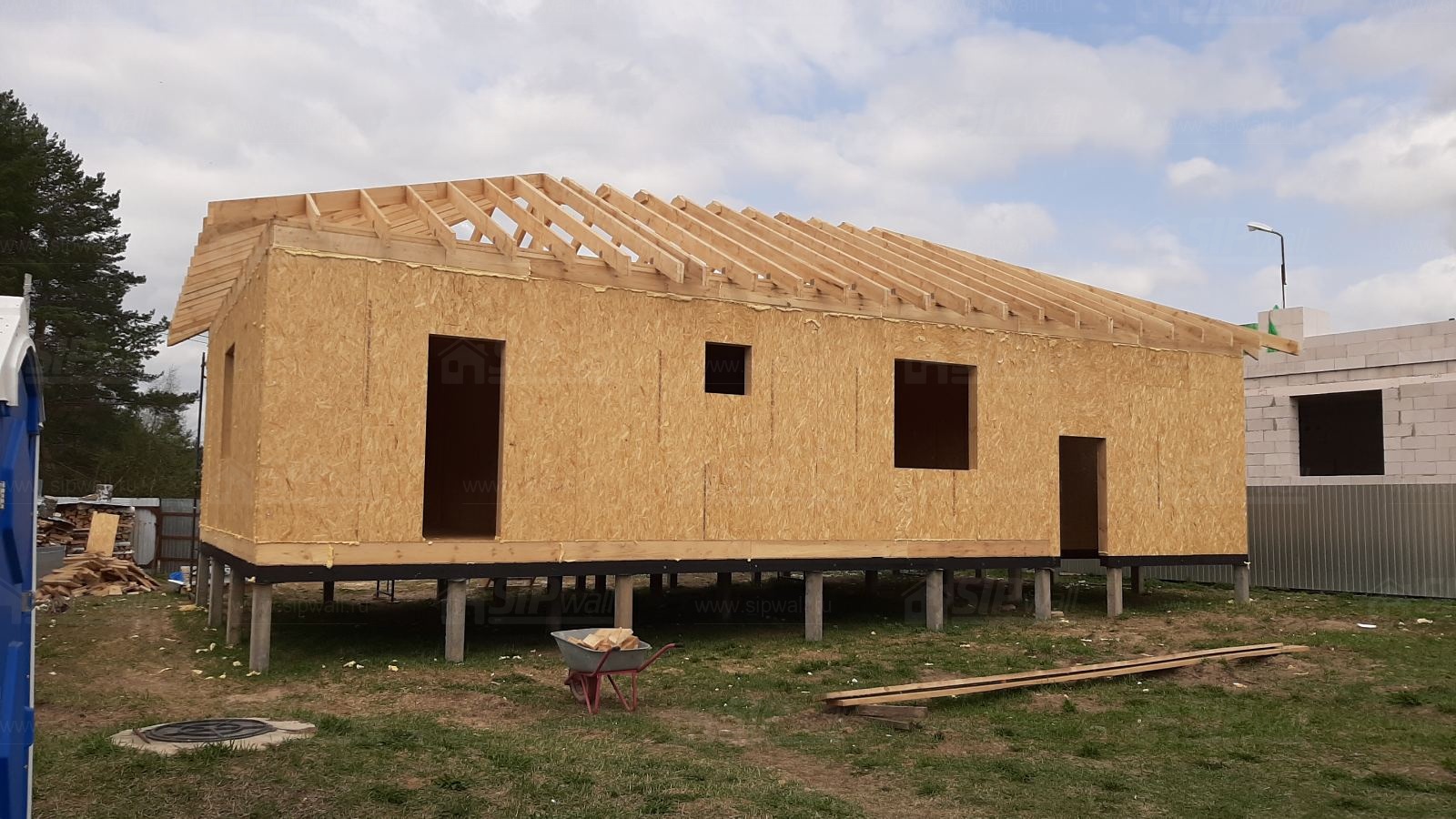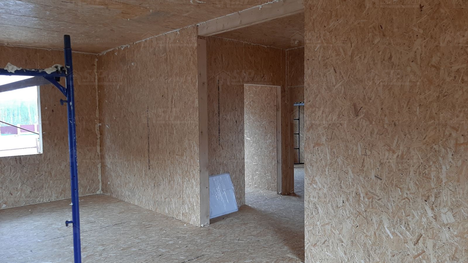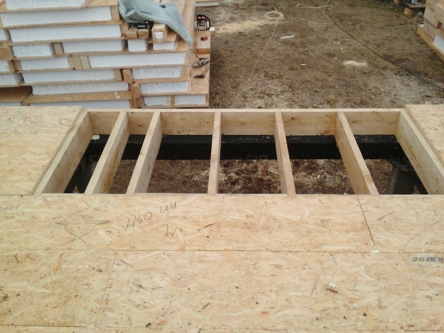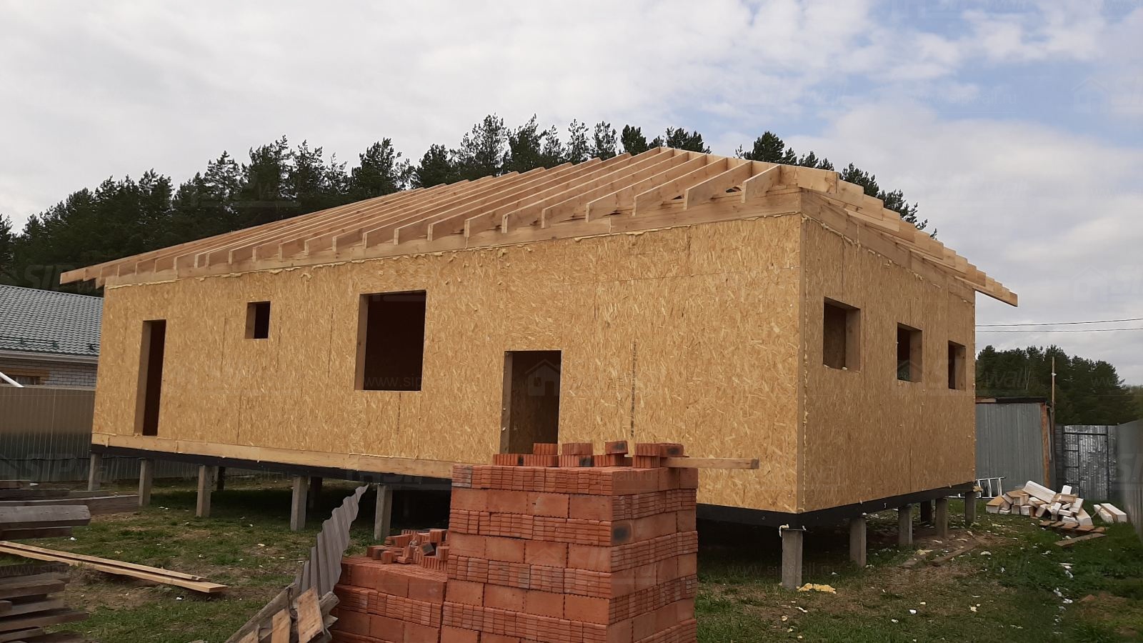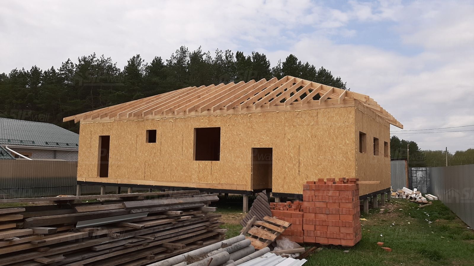 Все СИП панели SIPwall толщиной 224/174/124 мм (плиты OSB-3 толщиной 12 мм "Калевала" Россия и фасадный пенополистирол ППС-14 толщиной 200/150/100 мм производства, Россия) нарезаны и обрусованы сухим строганным брусом камерной сушки в соответствии с проектной документацией.