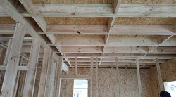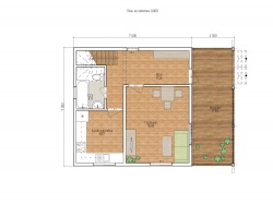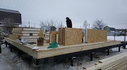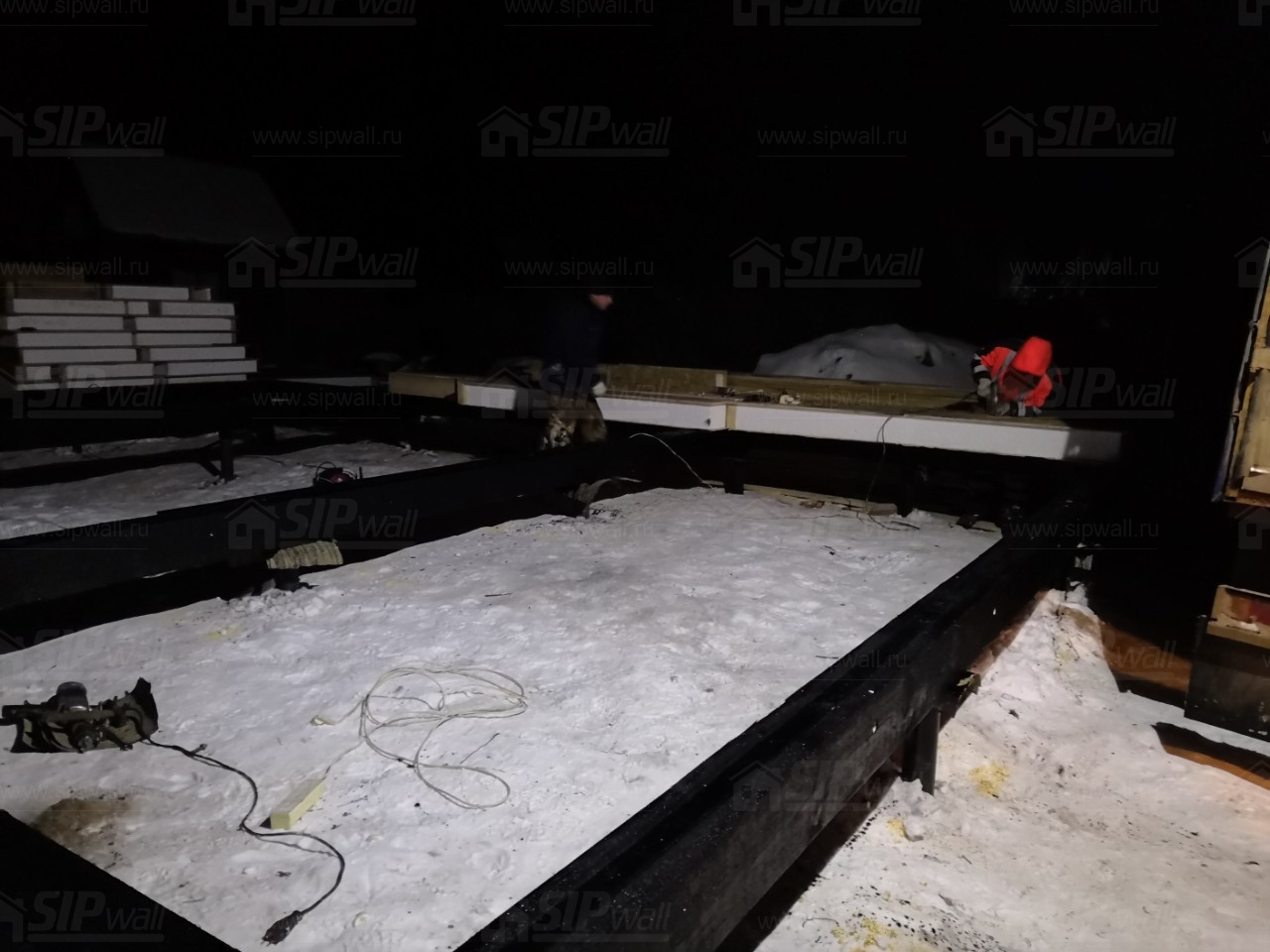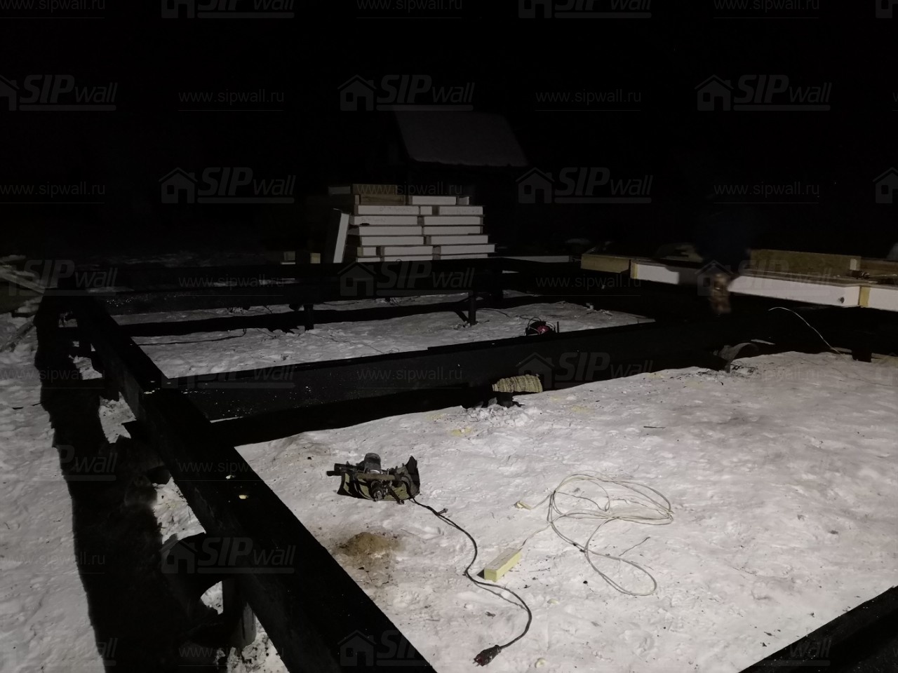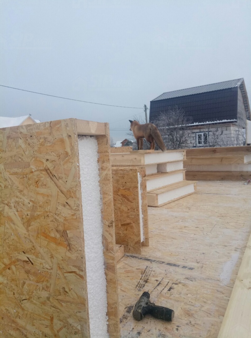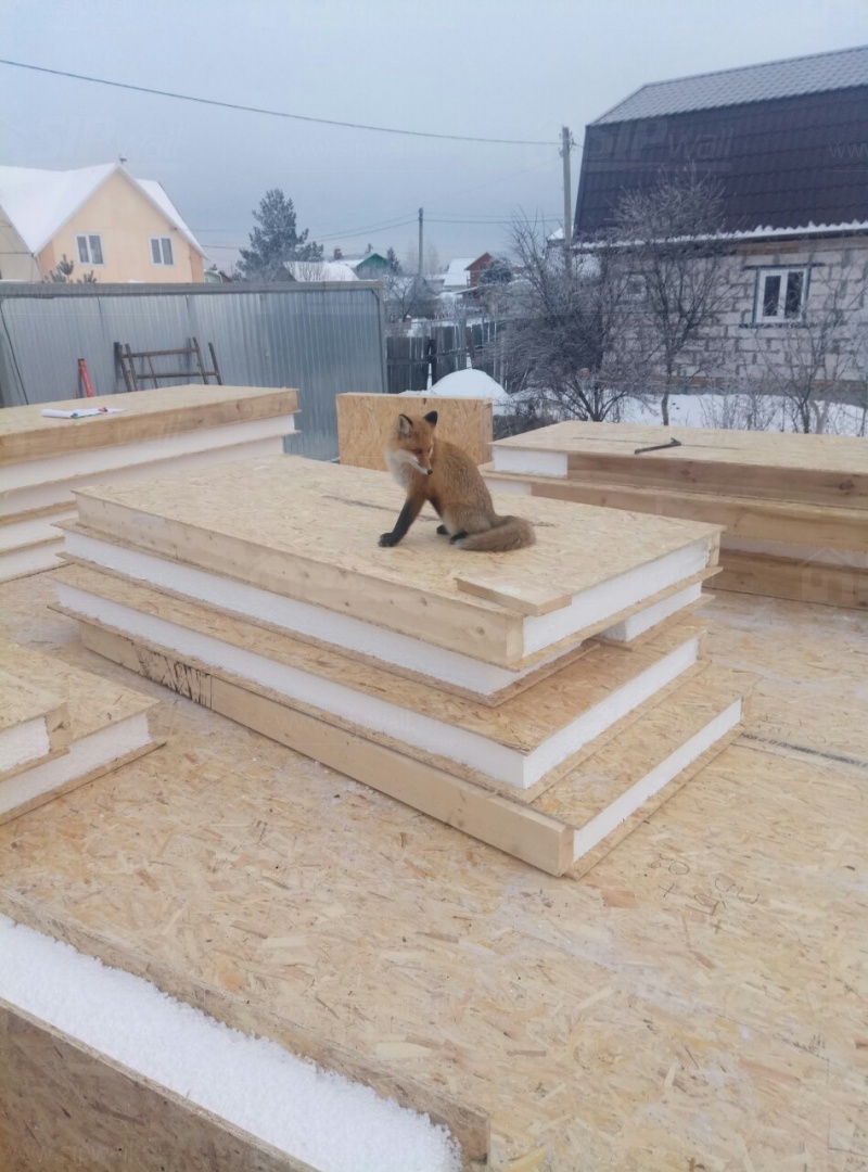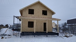 Комплектация домокомплекта: перекрытие на отметке +0.000 - СИП - 224У мм., несущие стены дома выполнены из СИП панелей 174 мм., внутренние несущие стены выполнены по каркасной технологии. Межэтажное перекрытие: деревянные двутавровые балки ДКД-241F с настилом OSB-3 толщиной 22 мм. Кровля - выполнена из СИП панелей 174У мм.